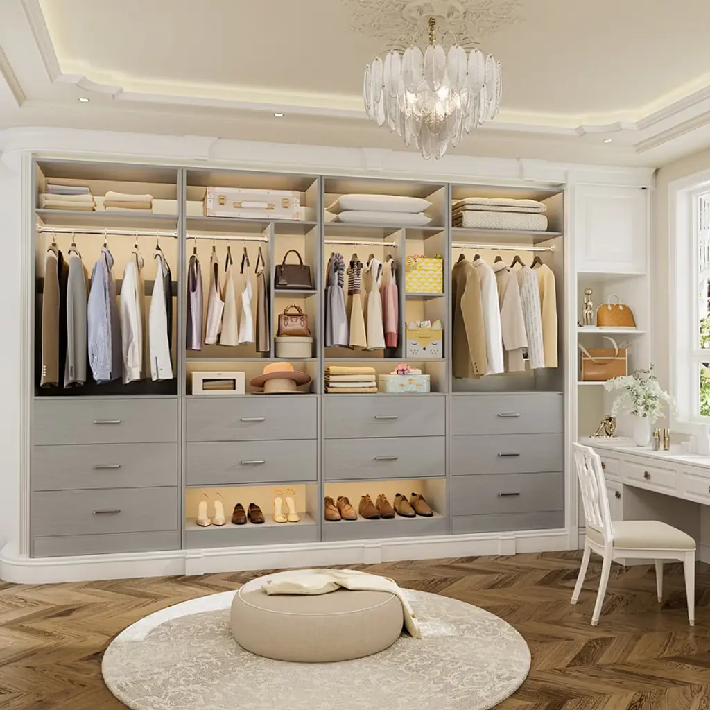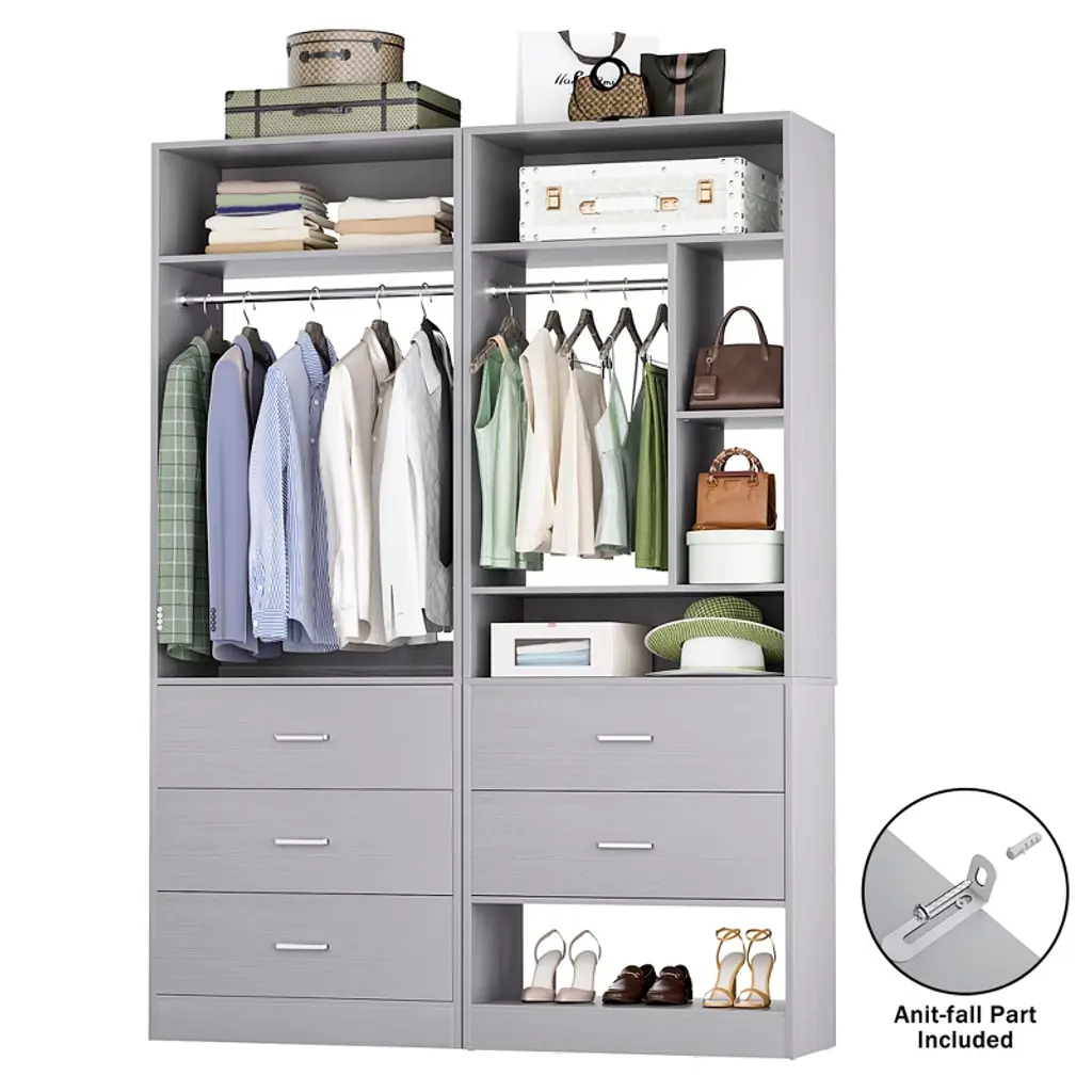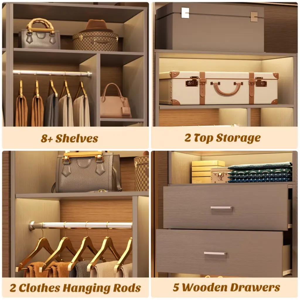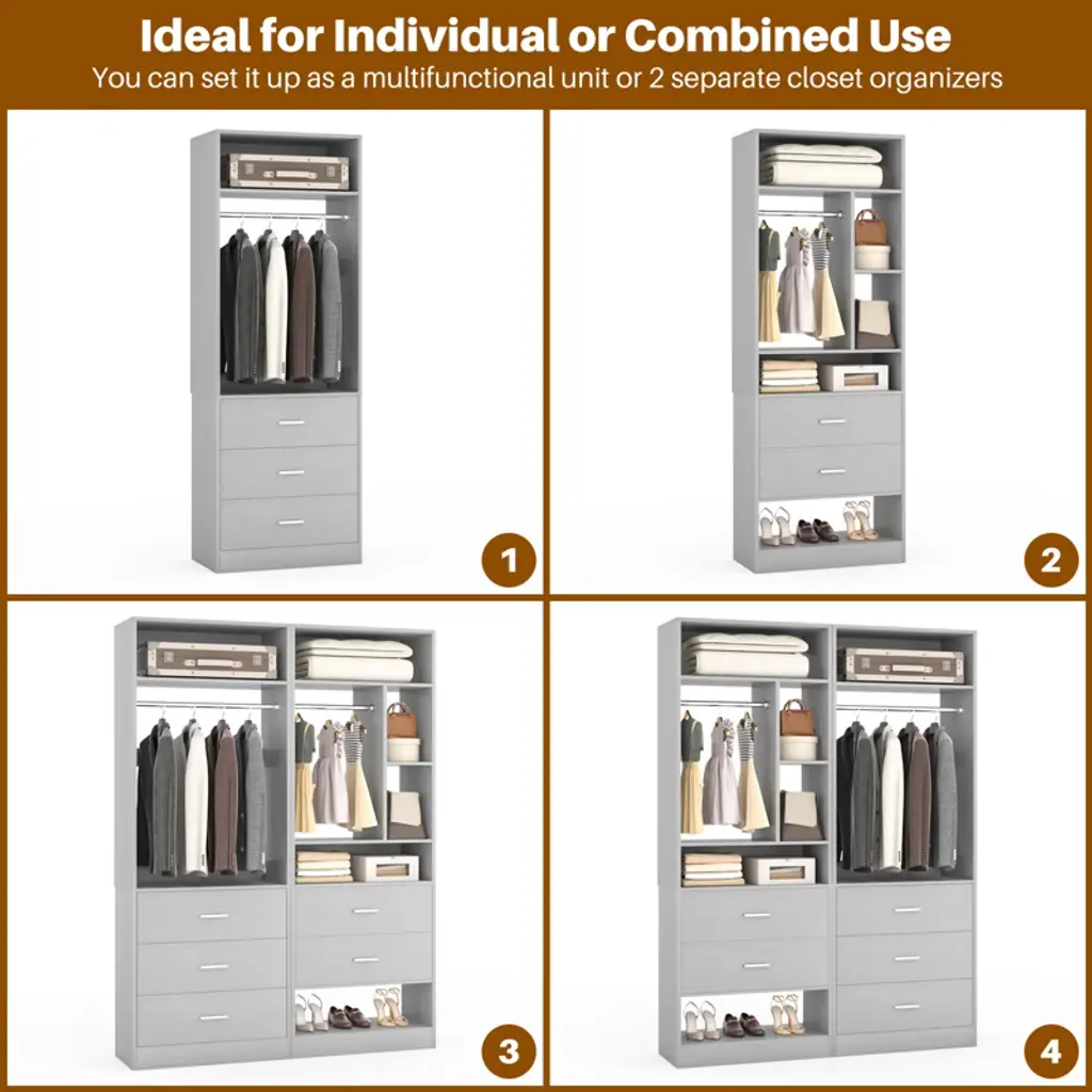 Transform your cluttered closet into a sleek, organized haven with our 2-in-1 Closet System—designed to maximize every inch of your space. Perfect for walk-in closets, this heavy-duty organizer combines 15+ shelves, 2 spacious wooden drawers, 3 adjustable hanging rods, and dedicated shoe storage to hold 400+ items—from jackets and jeans to bags and accessories. No more wasted corners or overflowing drawers!