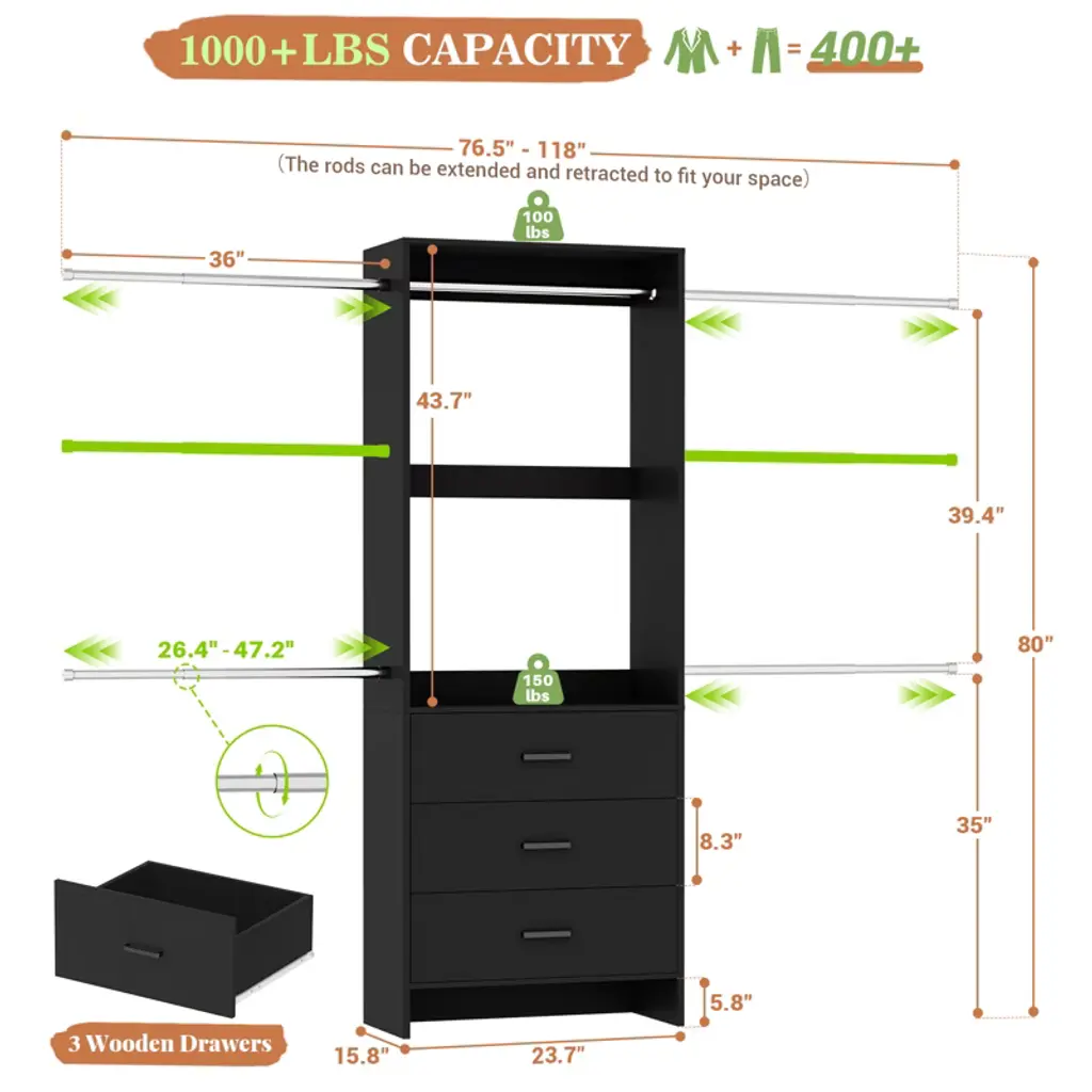 Aheaplus 76.5"-118" W Closet System With 4 Hanging Rods And 3 Drawers