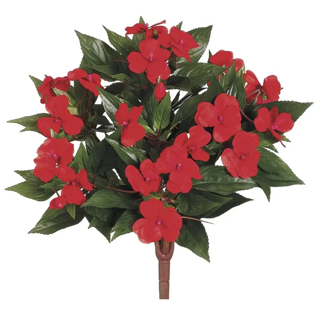 Lifelike faux New Guinea Impatiens bush showcases vibrant two-tone tomato-red blooms, magenta stamens, and richly detailed dark green veined leaves. Bendable wire stems let you shape and position for stunning indoor arrangements—perfect for vases, tabletop centerpieces, or full, lush displays. Adds instant, year-round color to any room. Features: Red New Guinea impatiens artificial bush Lifelike design Bendable wire branches for easy positioning Recommended for indoor use only Dimensions: 13.7" high x 9" diameter Material(s): plastic/polyester/wire/foam