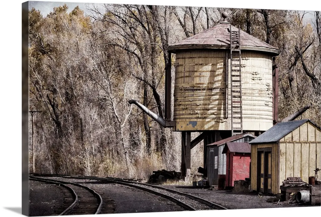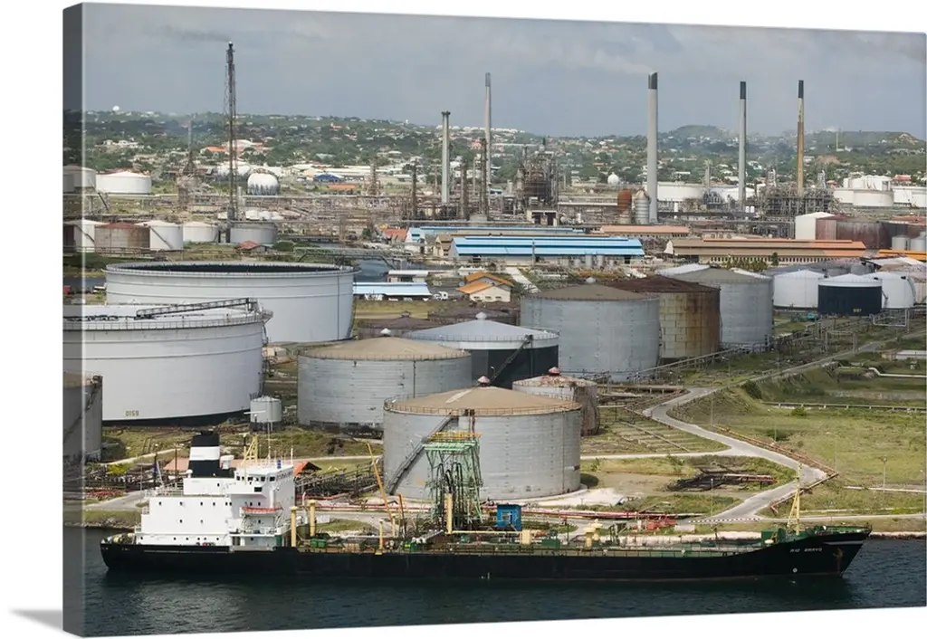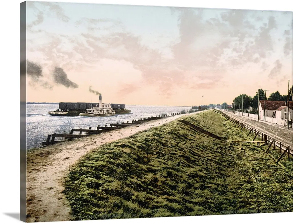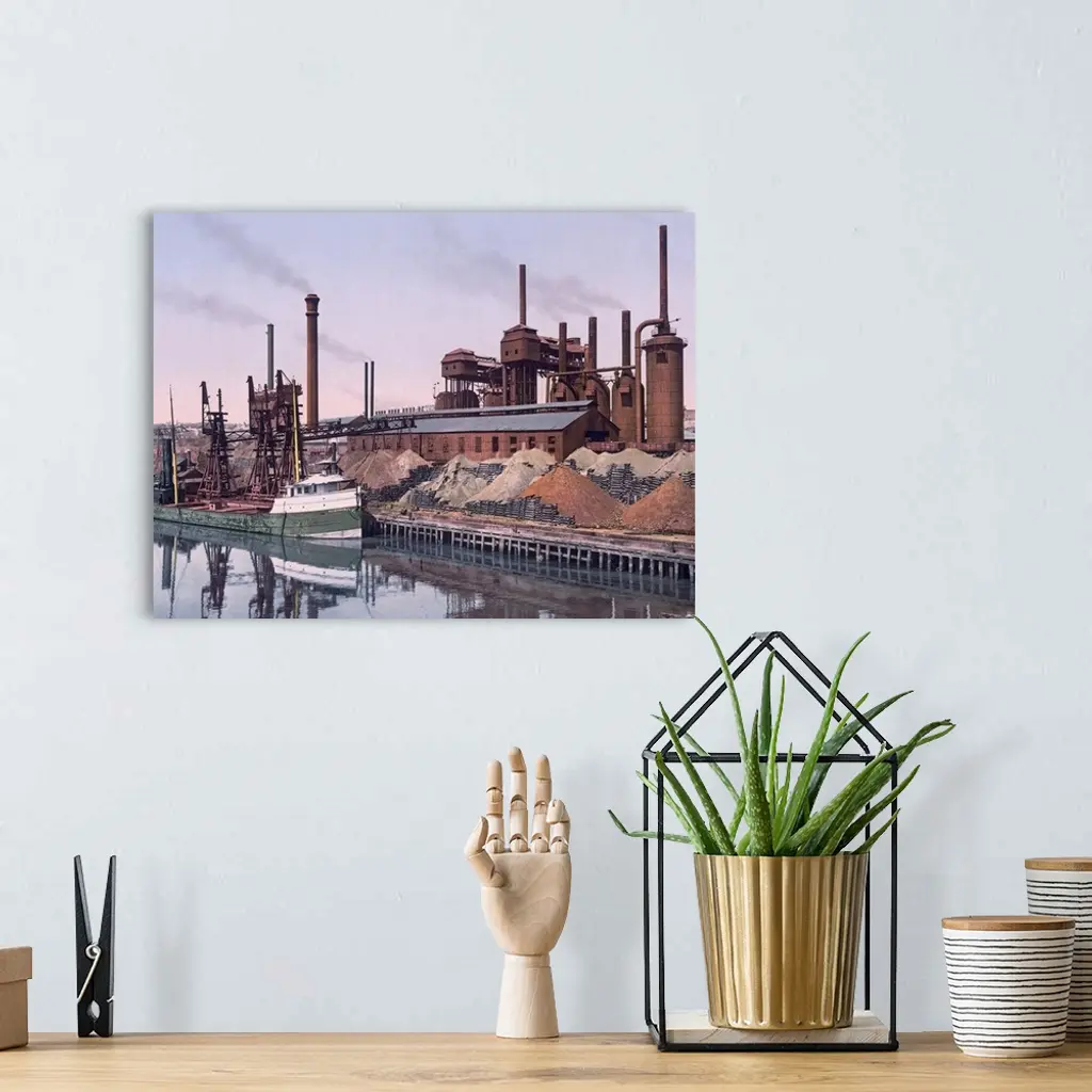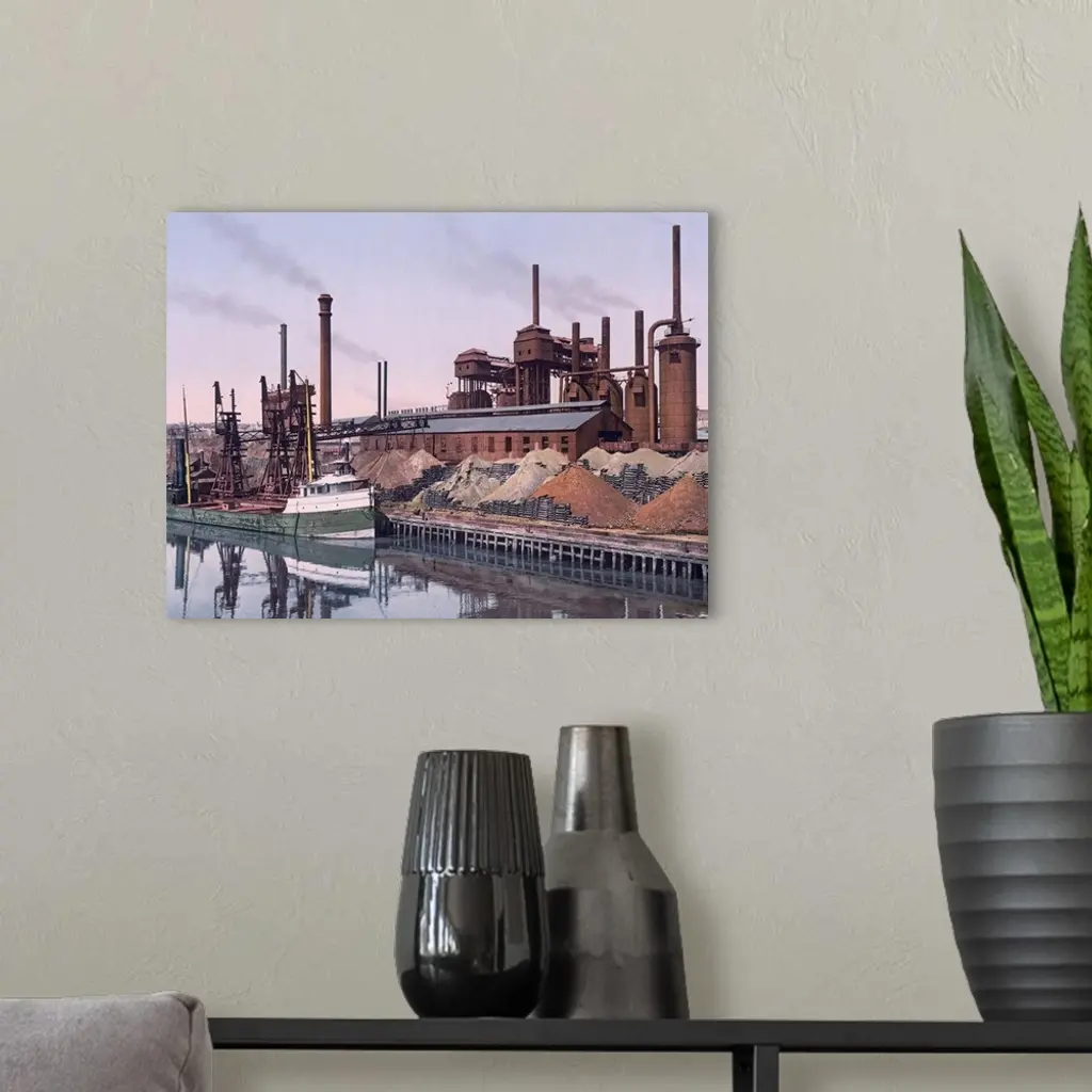 Vintage color photo of an American Steel factory on the banks of a river with tall smoke stacks and piles of minerals.