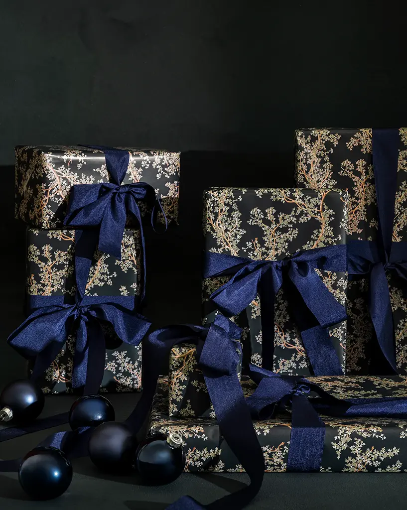 Artful and organic, our Antigone Branch Gift Wrap features a delicate motif of winding branches and soft green foliage set against a rich, moody backdrop. Elegant and elevated, it adds a refined, nature-inspired finish to holiday gifting.