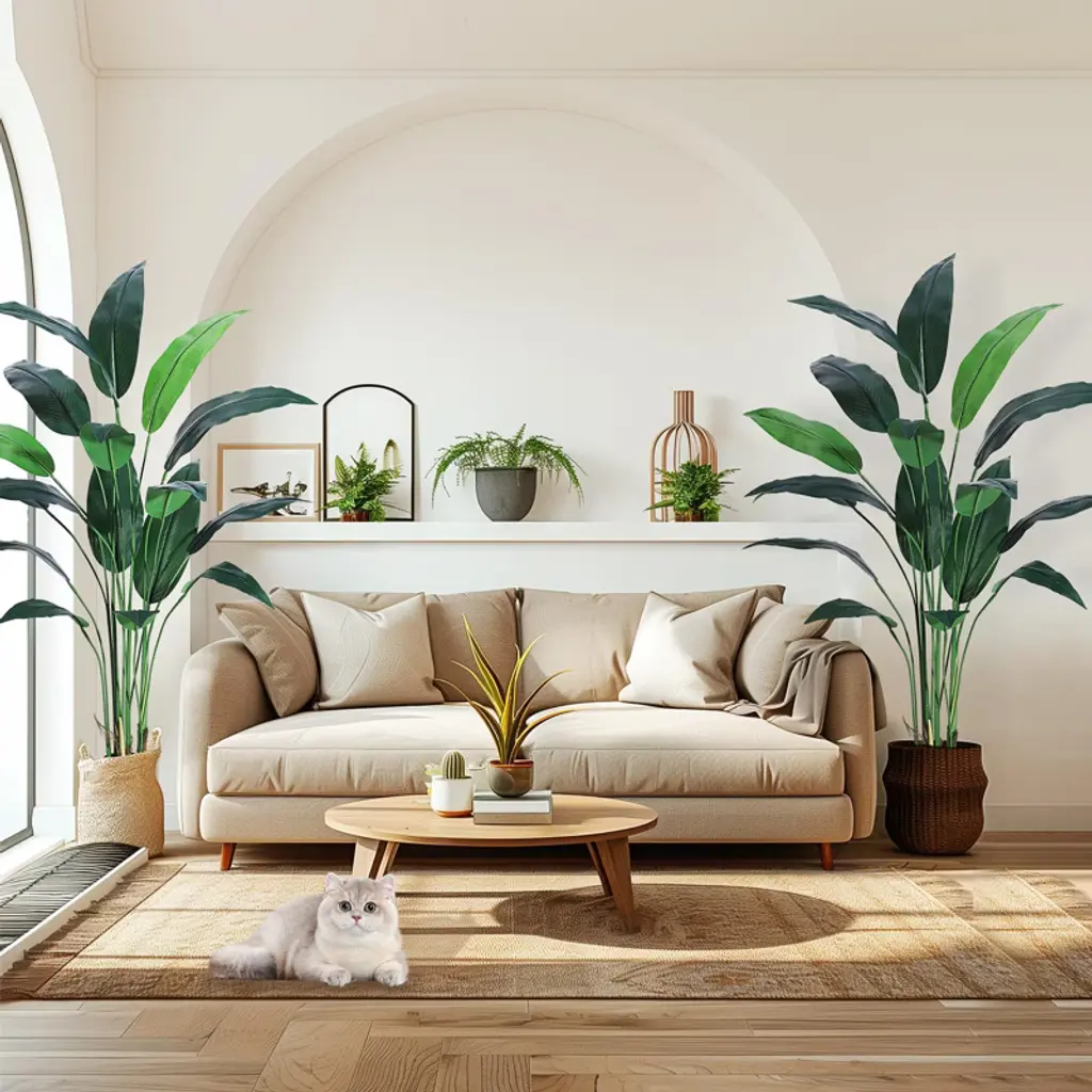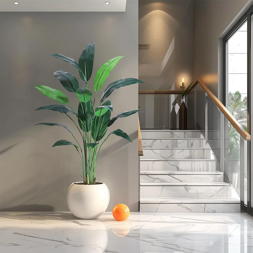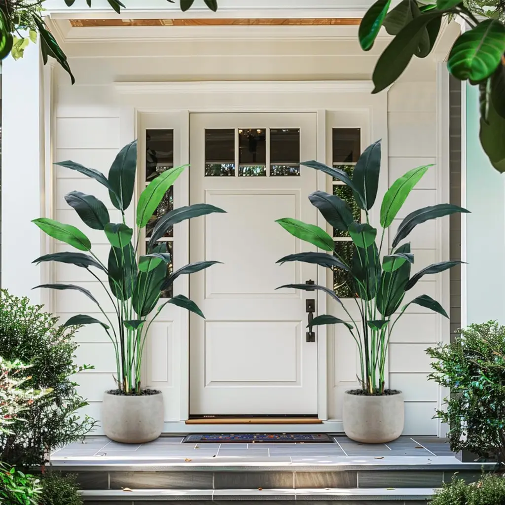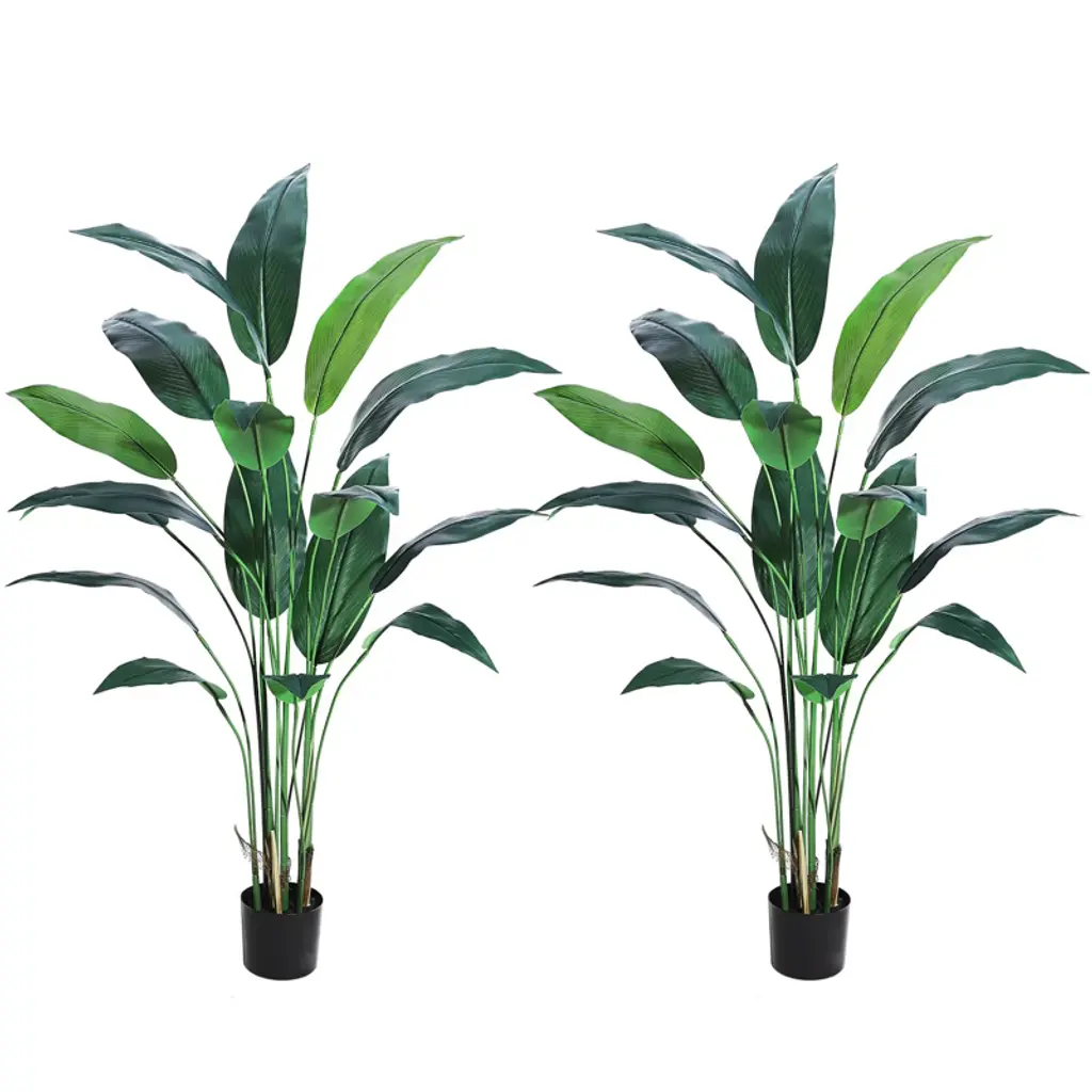 Product DescriptionInfuse your indoor or covered outdoor spaces with tropical sophistication using this 6/7-foot artificial bird of paradise tree, meticulously designed to replicate the bold, architectural beauty of its natural counterpart. Ideal for homes, offices, or commercial settings, this faux tree combines lifelike foliage, durable construction, and effortless maintenance for year-round vibrancy.Key Features1. Ultra-Realistic Botanical DesignThe trunk mimics the textured appearance of a real Trachycarpus palm with faux bark detailing and natural imperfections. Seventeen vibrant rubber-fabric leaves feature tapered shapes, visible veining, and color gradients from deep green to subtle yellow undertones, replicating the lushness of tropical foliage.2. Adjustable, Customizable CanopyFlexible metal wires embedded in each leaf allow you to arch, spread, or angle foliage for a tailored look. Pre-assembled segments connect seamlessly via labeled guides, enabling quick setup and personalized shaping.3. Weather-Resistant & Family-SafeUV-treated silk leaves resist fading in sunlit indoor areas or shaded patios. Flame-retardant materials ensure safety in enclosed spaces, while a cement-filled polypropylene base provides tip-resistant stability.4. Low-Maintenance EleganceRequires no watering, pruning, or sunlight. Wipe leaves occasionally with a damp cloth to maintain their glossy finish.Product SpecificationsMaterial: Silk/PVC leaves, polyethylene trunk, polypropylene baseColor: Tropical green foliage, brown textured trunkIncluded: 1 tree, 1 weighted base, assembly guideFeatures: Adjustable leaves, UV resistance, flame-retardant treatmentPerfect as a housewarming gift or permanent decor accent, this artificial bird of paradise tree effortlessly bridges nature and modern design, offering enduring beauty without the upkeep of live plants.