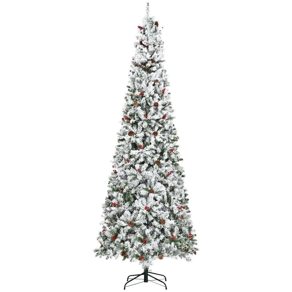 Artsy 9 Foot Pencil Snow Flocked Artificial Xmas Tree With Pine Realistic Branches, Pine Cones, Red Berries, Auto Open, Green - Green