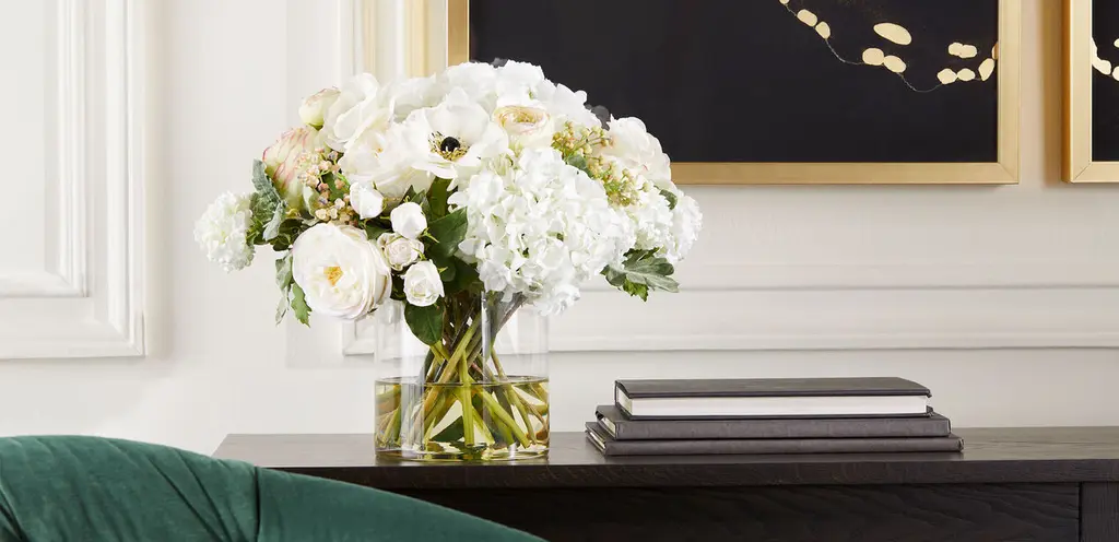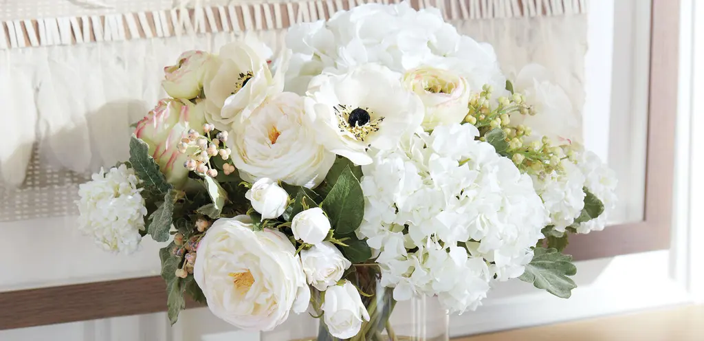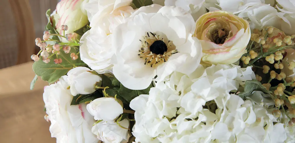 This white watergarden floral arrangement captures some of our favorite spring and summer flowers—hydrangea, anemone, ranunculus, and roses—at their peak. Glorious blooms in shades of ivory and alabaster are bunched closely together, punctuated by carefully placed tallow pick berries and silvery gray dusty miller. Display this grand bouquet anywhere for a touch of classic beauty that will never wilt or fade.