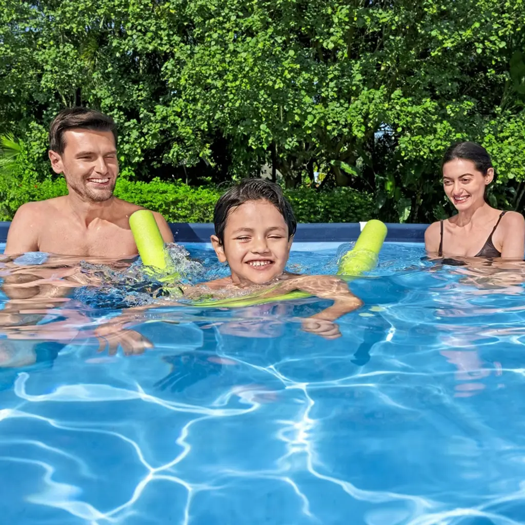 The Bestway Deluxe Splash Frame Pool is the perfect backyard above ground pool for families. It's easy to assemble too and only takes about 20 minutes with 2-3 people. The metal frame of the pool is connected with T connectors and C clips and walled with heavy-duty PVC and polyester 3-ply. Built to last, you and your family can enjoy years of summer fun. When the pool season is over, the flow control drain valve makes emptying the pool a breeze. Connect it to your garden hose and drain away from your home and distribute water evenly so you won't ruin your lawn. With a flow control valve for easy draining, you don't have to empty the water right next to the pool. it's easy to disassemble and store during the colder months. Disclaimer: Please review your HOA rules and restrictions before purchasing this product. Not all housing agencies permit private above-ground pools. Measure before you buy to ensure proper fit. Enjoy the summer days with your little ones in the Bestway Deluxe Splash Frame Pool.