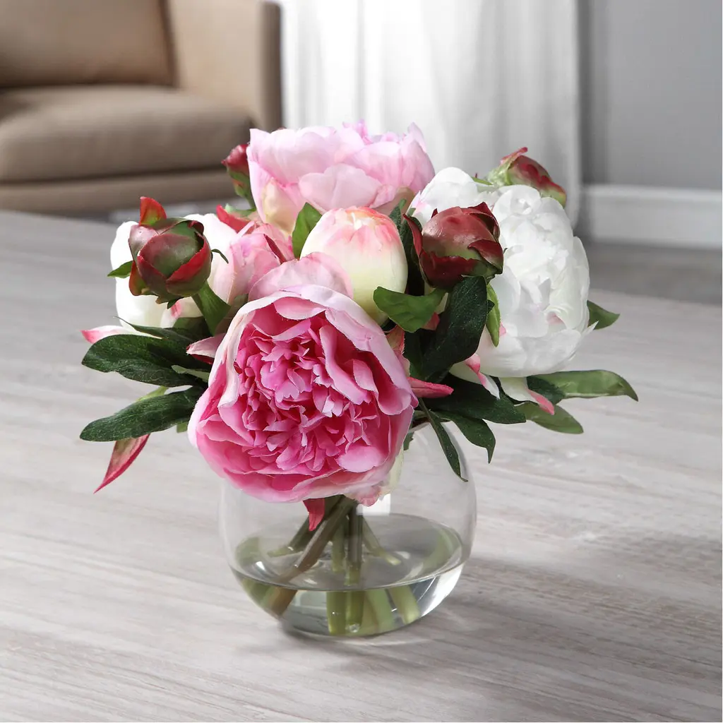 A Sweet Mix Of Lush Pink And Cream Peony Cuttings Placed In A Round, Clear Glass Vase With Faux Water.
