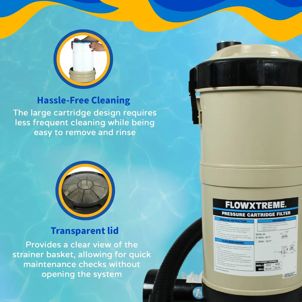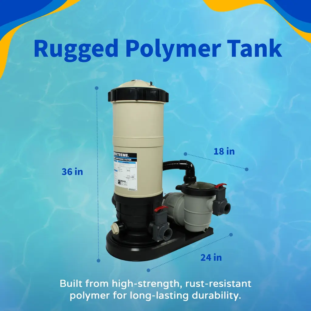 Keep your above-ground swimming pool clean all season long with the Hydromatic Cartridge Filter System. Constructed from rugged polymer, the tank and base are resistant to corrosion, ensuring that your pool stays clean and clear for many seasons to come. Inside the filter tank is an extra-large filter cartridge that’s designed to provide exceptional filtration and water quality, without backwashing. Two slide valves and a spin lock top make removing and cleaning the cartridge quick and easy. The high-powered pump provides a consistent, energy-efficient performance so you can run your pump less while still maintaining sparkling clean water. 1-year warranty.