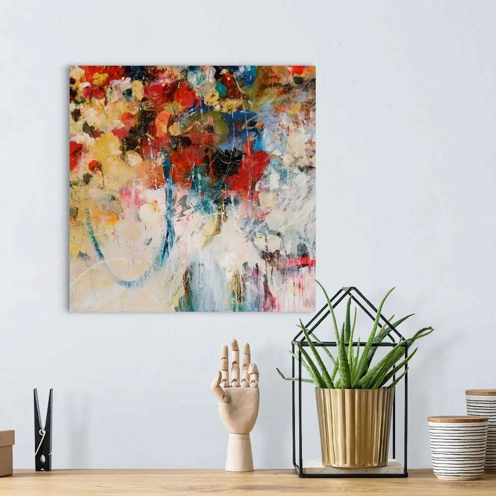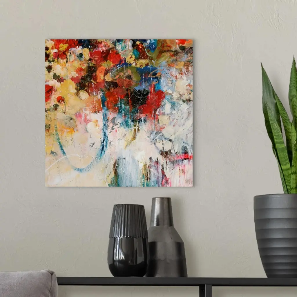 Abstractly painted square canvas with different flowers painted in the top portion and faded color splashes at the bottom.
