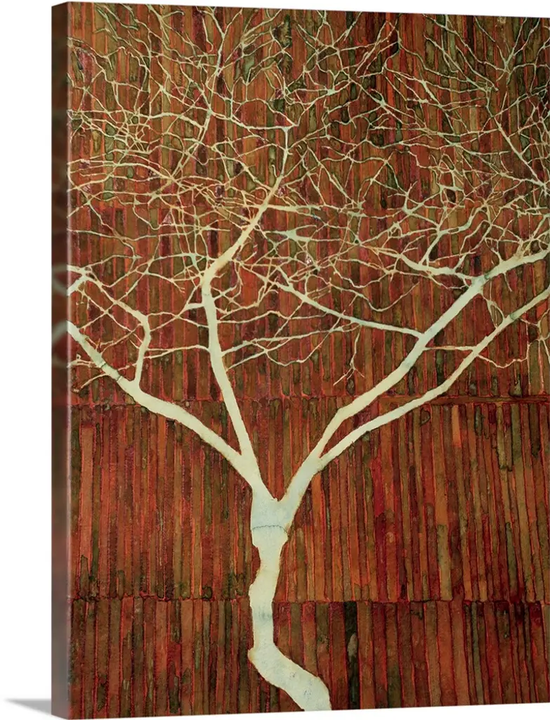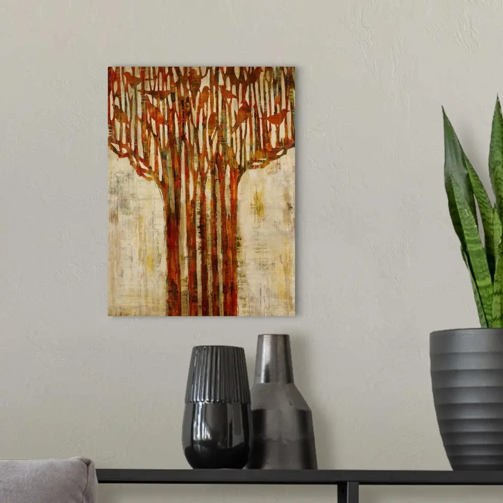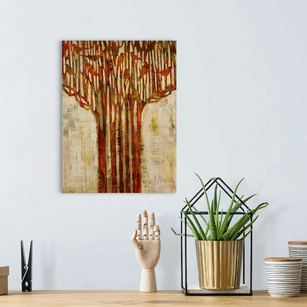 Huge contemporary art portrays an abundance of birds sitting on the numerous branches within a large tree. Artist uses a lot of vertical lines to represent all parts of the tree and positions it against a distressed background composed of similar neutral tones.
