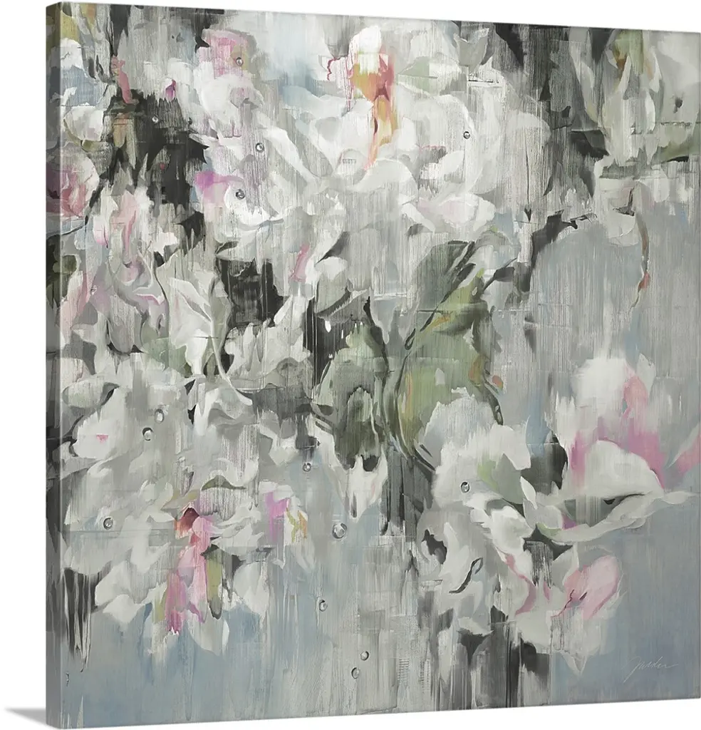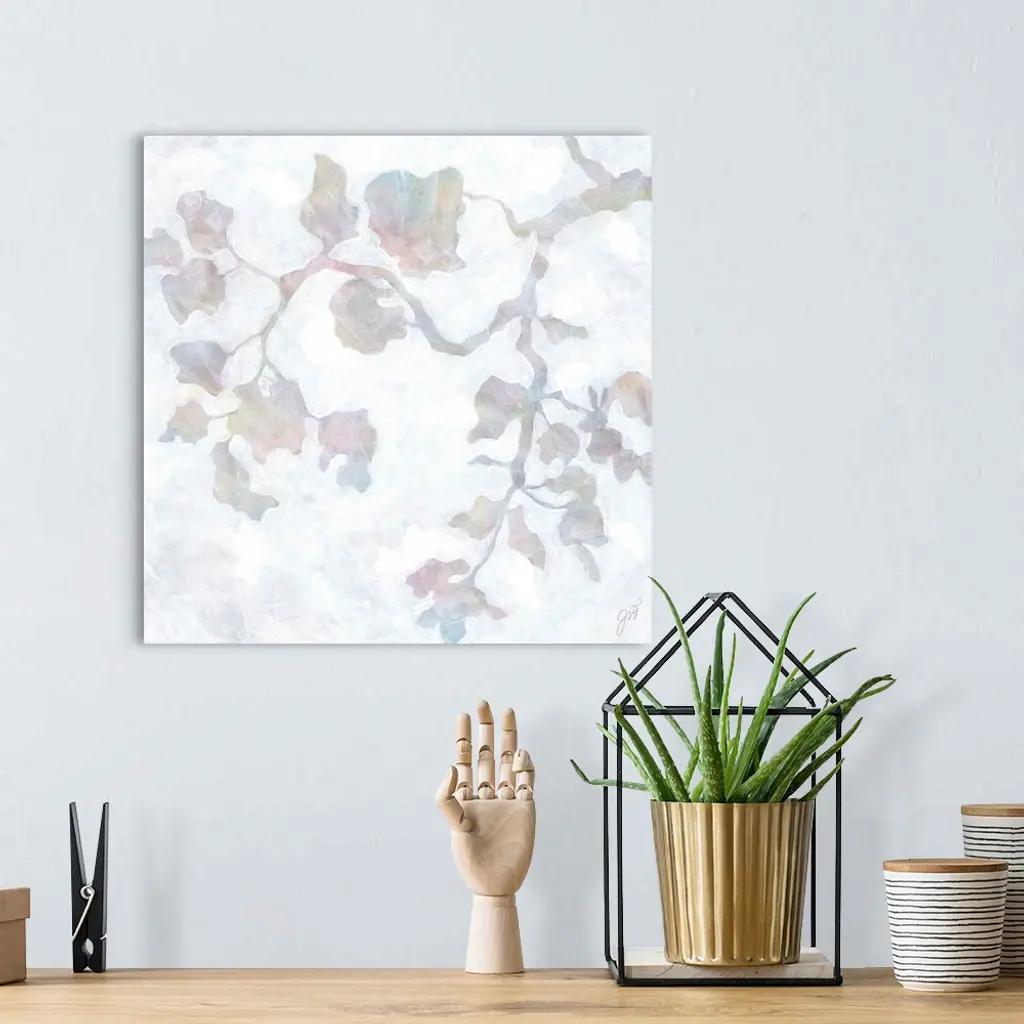 In soft pastel tones of pink, purple, and orange, the silhouette of a flowery branch stands out against a light background.