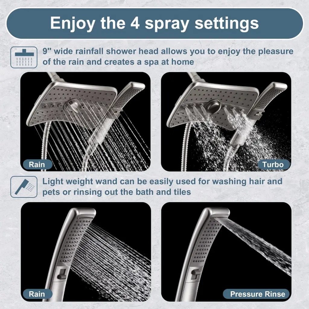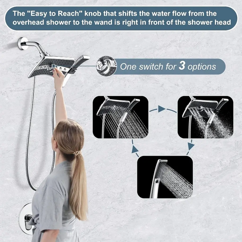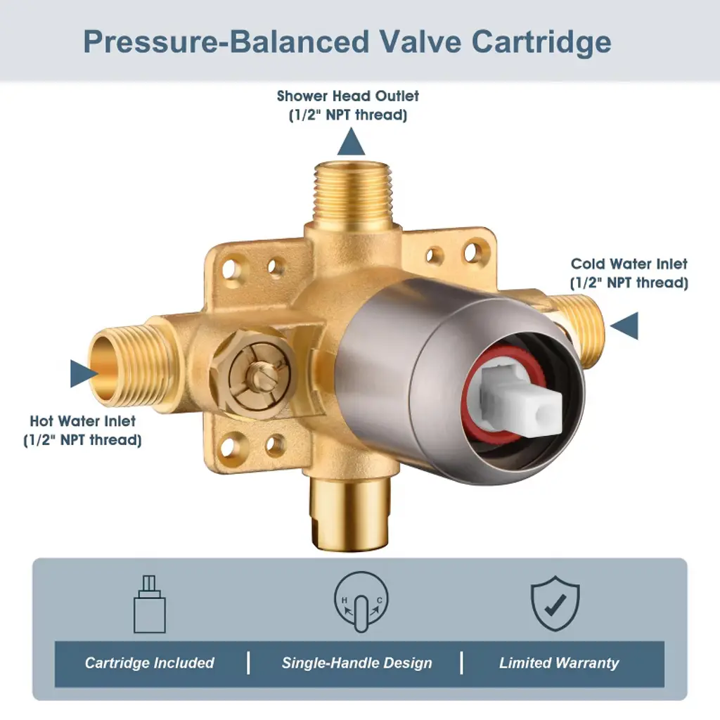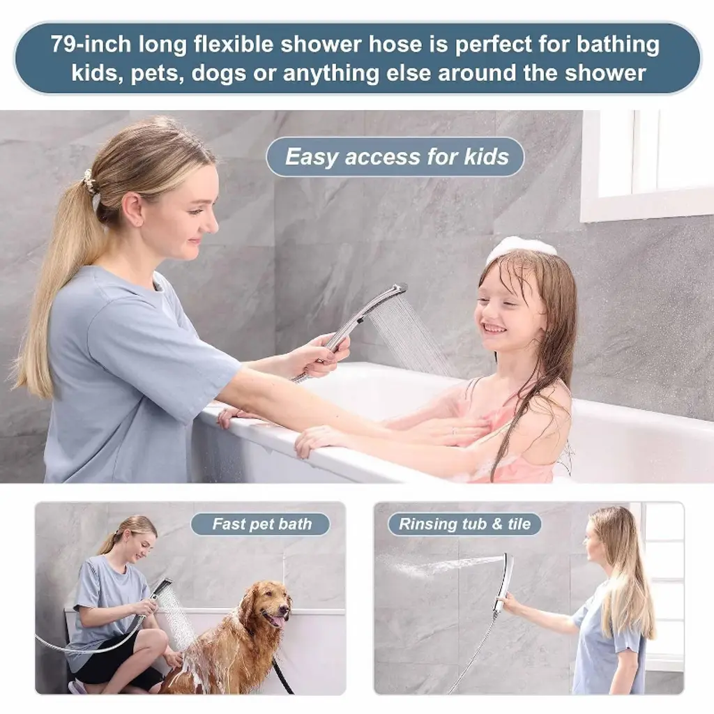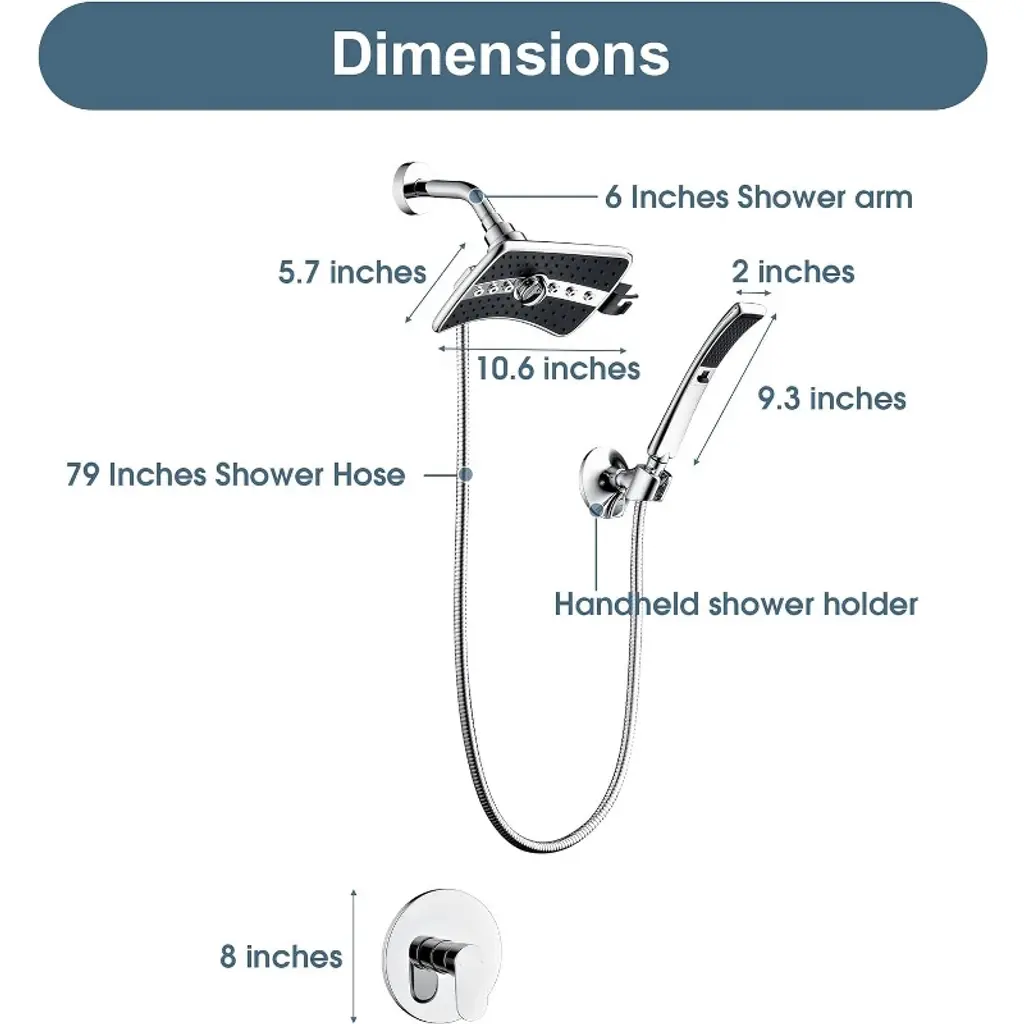 1. Consistent Temperature Control Pressure balance valve maintains stable water temperature, preventing sudden changes for safer, more comfortable showers. 2. Dual Shower Head Combo Includes fixed overhead rain shower and handheld spray. Switch easily for full-body rinsing, targeted cleaning, or bathing kids and pets. 3. Durable and Stylish Construction Corrosion-resistant ABS with premium finish complements most bathroom styles and ensures long-lasting performance. 4. 79-Inch Stainless Steel Hose Extra-long stainless steel hose with anti-kink design and brass connectors for flexibility, durability, and leak prevention. 5. Complete Shower Kit Included Set includes rain shower head, handheld shower, hose, trim kit, and pressure-balanced valve. Backed by limited lifetime warranty.Consistent Temperature Control - This shower faucet set includes a pressure balance valve that keeps water temperature stable, even when other fixtures are in use. It protects against sudden temperature shifts, making your shower safer and more comfortable. Dual Shower Head Combo - This shower head with handheld combo features a fixed overhead rain shower and a handheld spray. Easily switch between the two to enjoy a full-body rinse, targeted cleaning, or convenient use for kids, pets, or seated showers. Durable and Stylish Construction - The complete rain shower system is built with corrosion-resistant ABS and a chrome finish that matches most bathroom styles. The included trim kit ensures a clean, professional look and dependable long-term performance. 79-Inch Stainless Steel Hose - Comes with a 79-inch shower hose made of stainless steel for extended reach and flexibility. Anti-kink design with brass connectors ensures smooth water flow, durability, and leak prevention. Complete Shower Kit Included - Package includes a rain shower head, handheld shower, shower faucet system, 79-inch hose, trim kit, and pressure-balanced valve. Everything you need for installation is in the box. Backed by BRIGHT SHOWERS’s limited lifetime warranty.