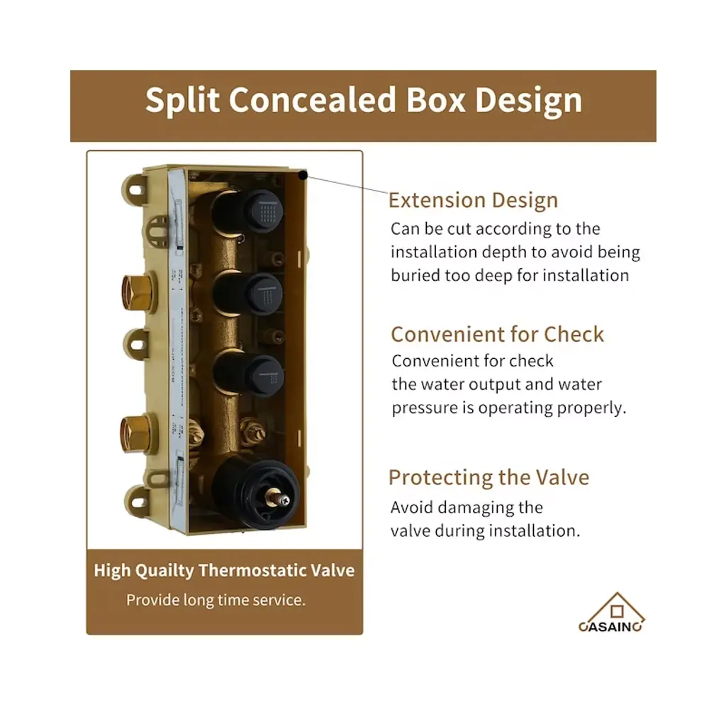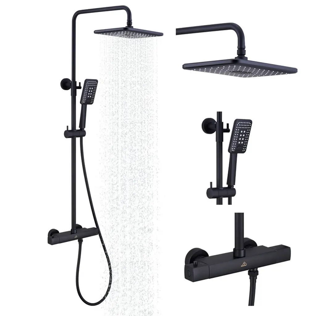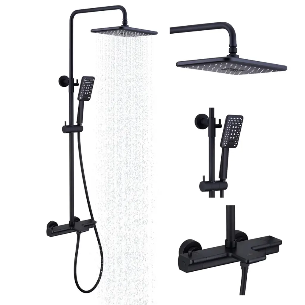 This bathroom shower set has a 12-inch stainless steel square rain shower head,air-in Technology.The single handle allows for easy adjustment of water flow and water temperature. US standard 1/2 NPT thread.
