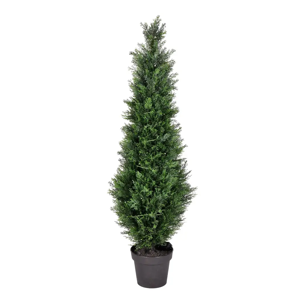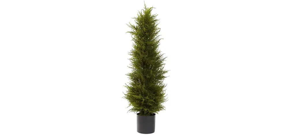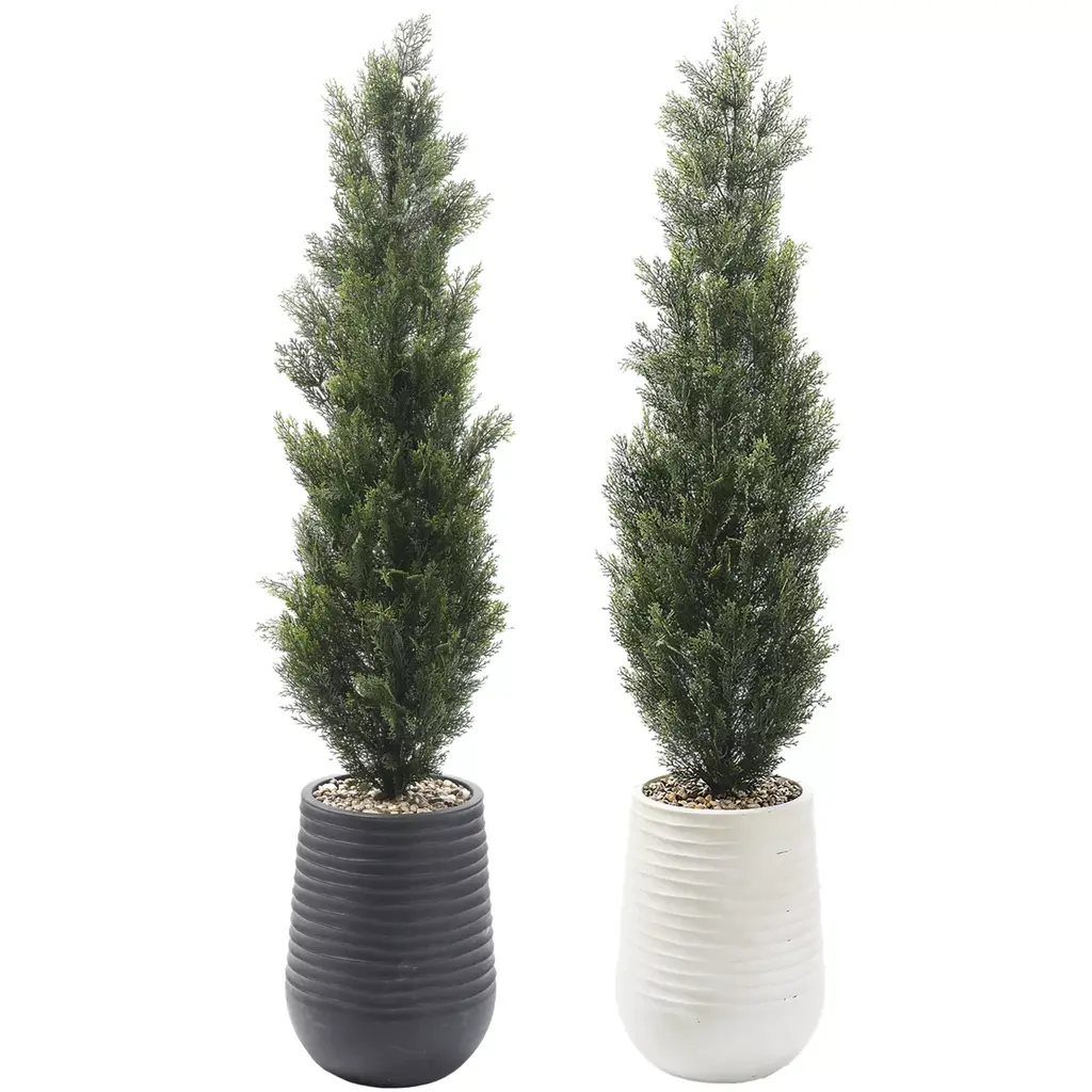 Enhance your outdoor space with our six-foot tall faux Cedar tree, a stunning addition that comes complete with a stylishly textured planter available in either black or white. Designed for durability and longevity, this piece is UV protected, ensuring it maintains its beauty against the elements. Perfect for outdoor settings. Please select your color before adding to cart.
