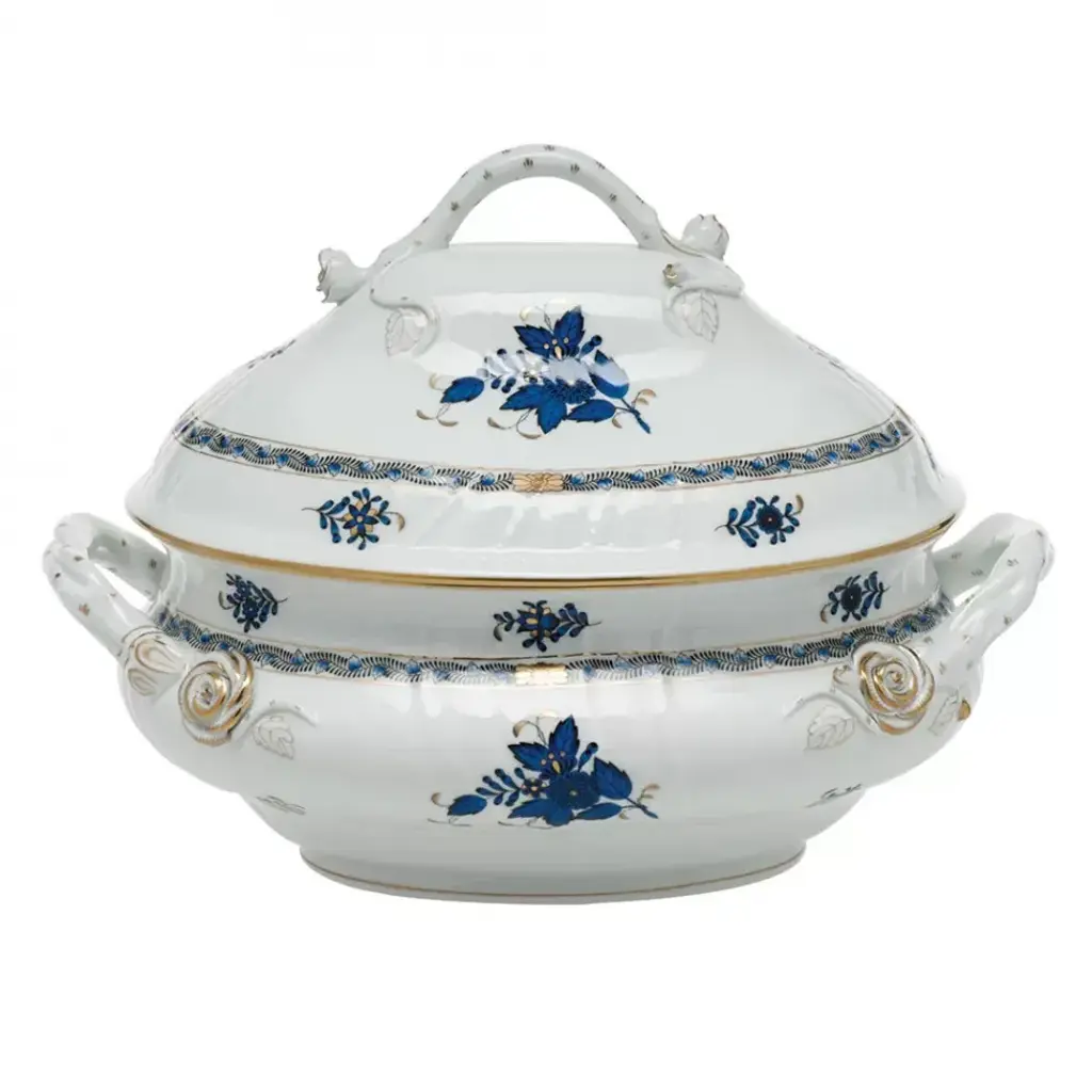 A Herend classic. Originally created in 1930 for Count Albert Apponyi, the pattern features a center motif of a stylized peony surrounded by a garland of leaves with 24K gold rosettes. It is available in multiple color options. Hand painted in Hungary. Now the biggest porcelain manufactory in Europe, Herend was founded in 1826 to produce earthenware in the small Hungarian village for which it was named. At the time, Hungary was flooded with low-cost pottery, but in 1839, Mor Fischer became the Manufactory’s new owner and he decided to focus on producing dinnerware replacement pieces for Europe’s royal families to complement their valuable porcelain patterns from Germany and the Far East. As his client base grew, Fischer commissioned his artists to begin designing dinnerware patterns of their own. Queen Victoria’s 1851 purchase of a large set for Windsor Castle was a milestone, setting the stage for aristocrats throughout Europe to clamor for Herend in their estates. In the 1850s, Herend added meticulously-crafted figurines to its creations. Herend’s trademark fishnet pattern, which is widely recognized and prized as Herend’s signature design, started in 1858 when an artist who was intrigued with a Chinese plate’s fish scale design painted it onto a rooster figurine to imitate feathers.