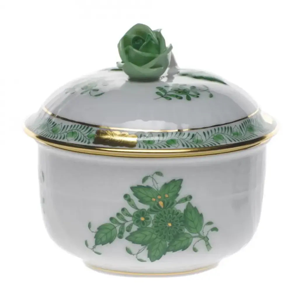 A Herend classic. Originally created in 1930 for Count Albert Apponyi, the pattern features a center motif of a stylized peony surrounded by a garland of leaves with 24K gold rosettes. It is available in multiple color options. Hand painted in Hungary. Now the biggest porcelain manufactory in Europe, Herend was founded in 1826 to produce earthenware in the small Hungarian village for which it was named. At the time, Hungary was flooded with low-cost pottery, but in 1839, Mor Fischer became the Manufactory’s new owner and he decided to focus on producing dinnerware replacement pieces for Europe’s royal families to complement their valuable porcelain patterns from Germany and the Far East. As his client base grew, Fischer commissioned his artists to begin designing dinnerware patterns of their own. Queen Victoria’s 1851 purchase of a large set for Windsor Castle was a milestone, setting the stage for aristocrats throughout Europe to clamor for Herend in their estates. In the 1850s, Herend added meticulously-crafted figurines to its creations. Herend’s trademark fishnet pattern, which is widely recognized and prized as Herend’s signature design, started in 1858 when an artist who was intrigued with a Chinese plate’s fish scale design painted it onto a rooster figurine to imitate feathers.