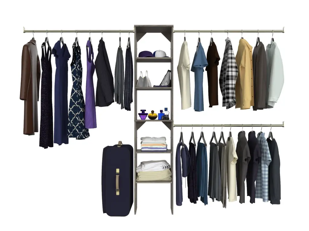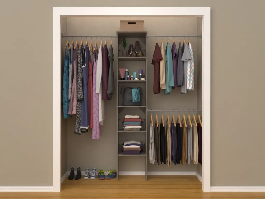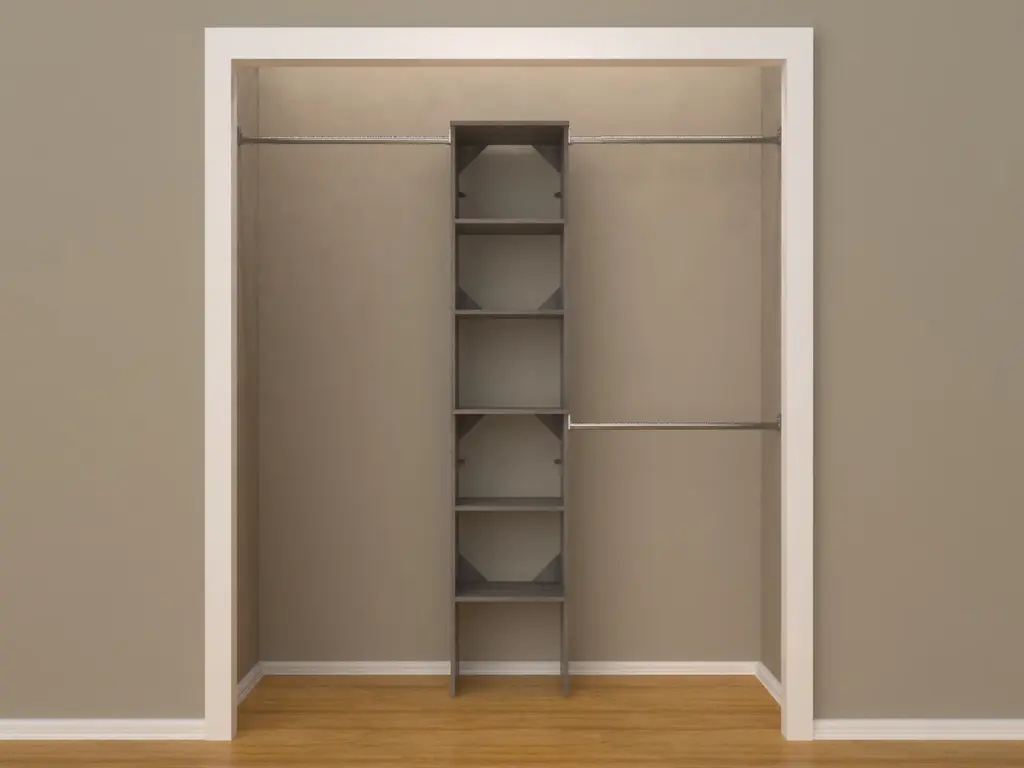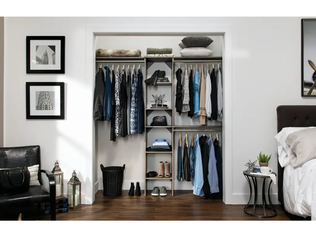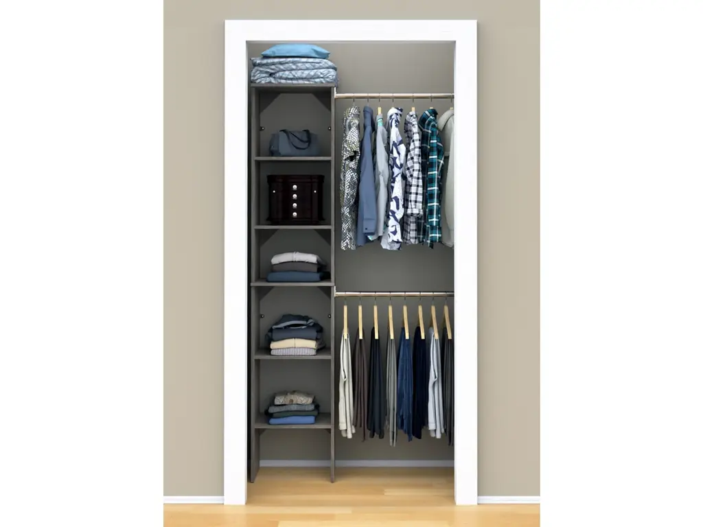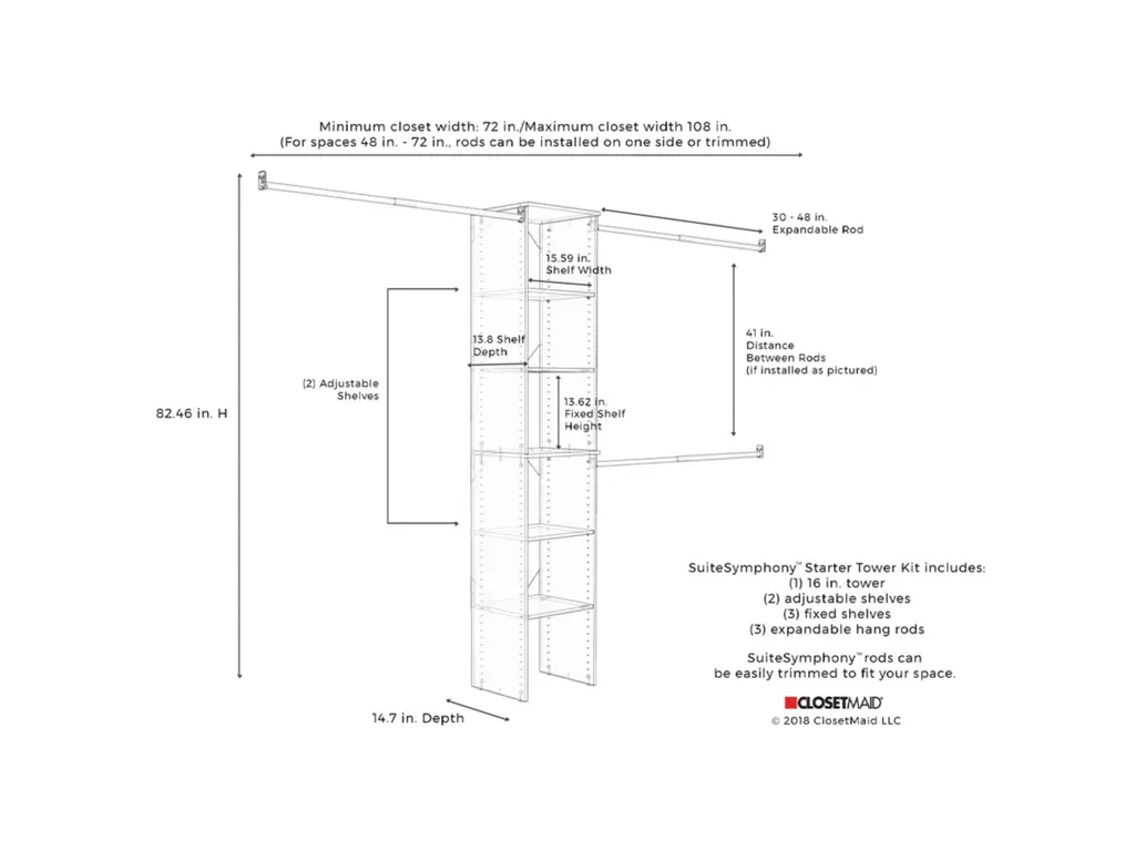Upgrade your clothing storage with ClosetMaid's SuiteSymphony closet organization systems. This high-quality system includes a 16" wide tower with two adjustable shelves and three expandable closet rods to keep your clothing and accessories organized. The sturdy laminate frame fits closets between 72 to 108 inches wide and creates up to 75-inches of shelf space and 144-inches of hanging space. Combine this kit with additional SuiteSymphony towers and accessories to create the reach " or walk" closet of your dreams. SuiteSymphony – beautifully affordable organization to fit your life and style.