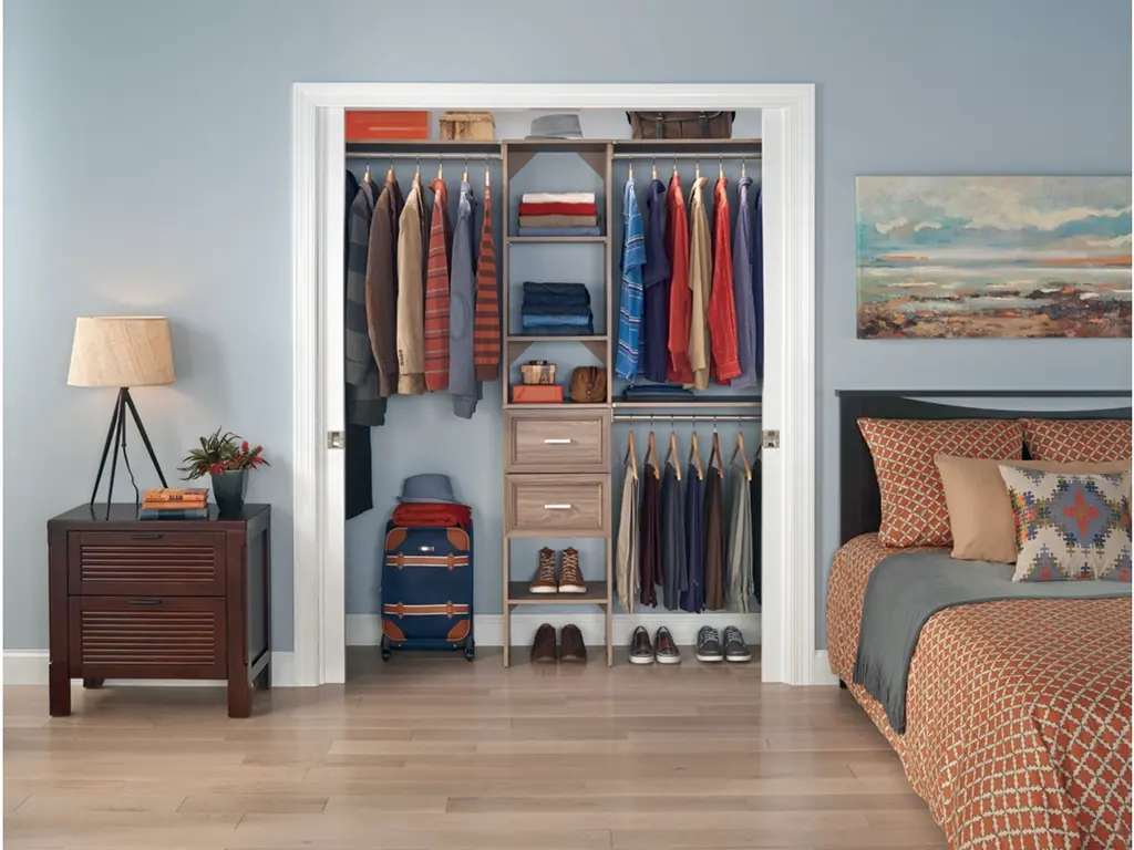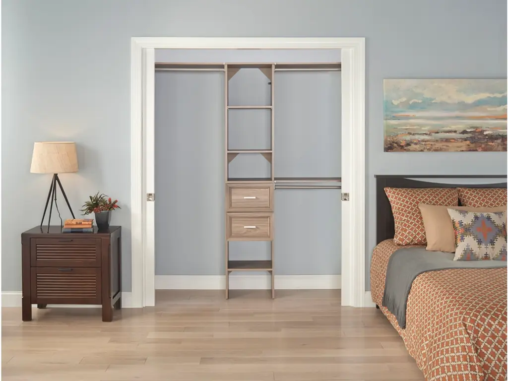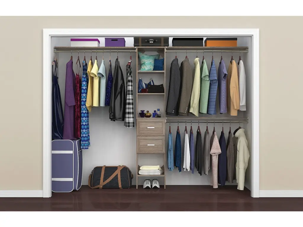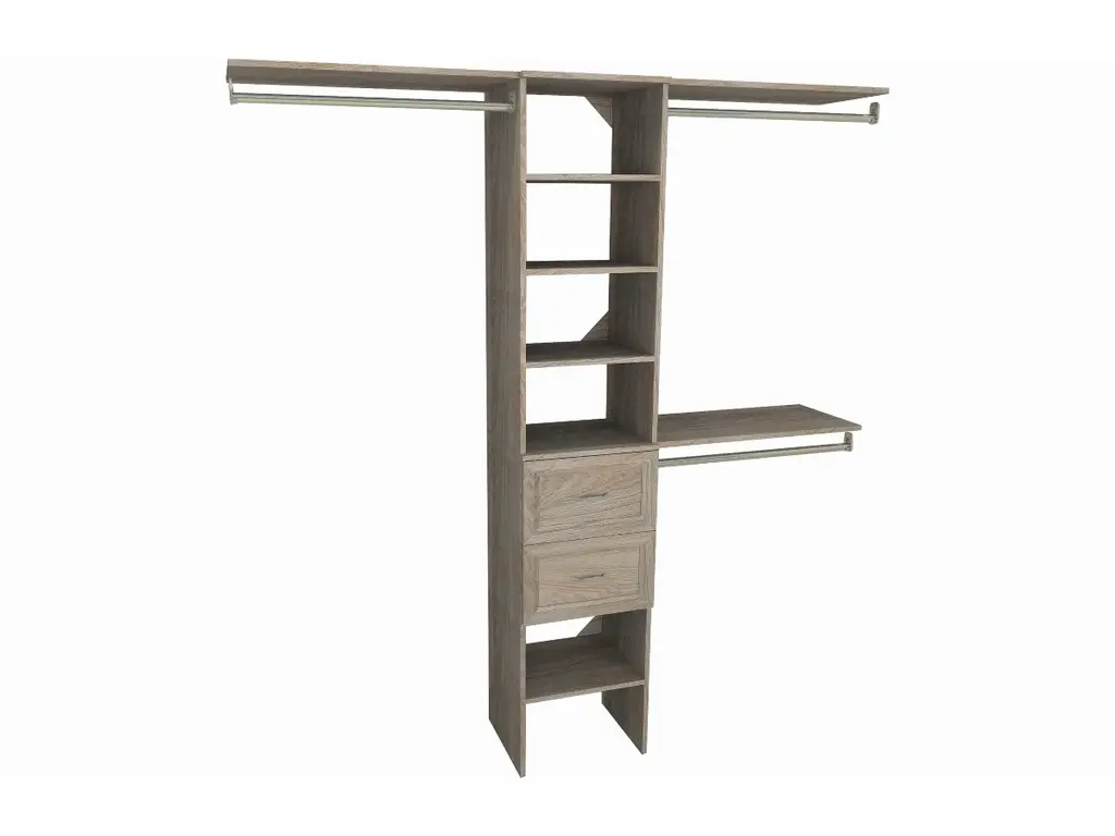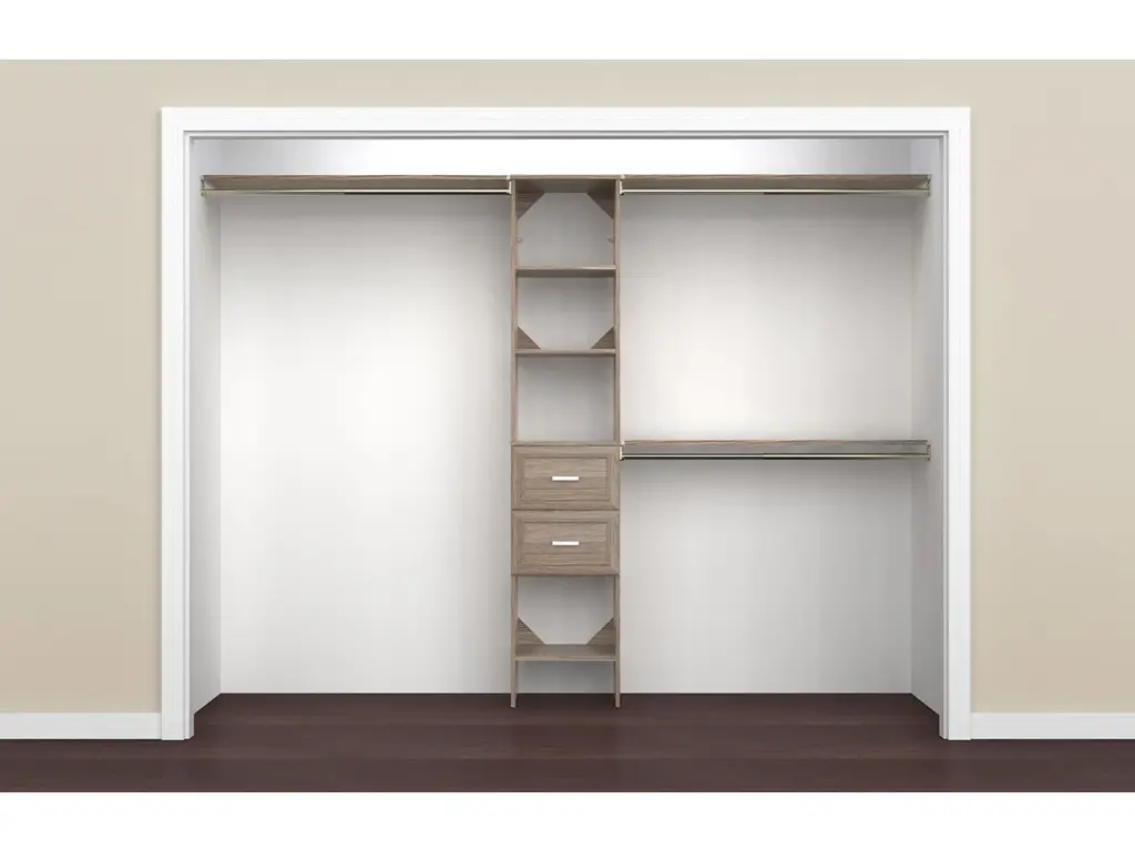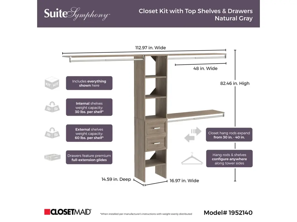 Upgrade your clothing storage with ClosetMaid's SuiteSymphony closet organization systems. This high-quality system includes a 16-inch wide tower with three expandable hanging rods, two drawers and multiple open shelves to keep your clothing and accessories organized. The sturdy laminate frame fits closets between 72 to 108 inches wide and creates up to 75-inches of shelf space and 144-inches of hanging space. Combine this kit with additional SuiteSymphony towers and accessories to create the reach in or walk-in closet of your dreams. SuiteSymphony - beautifully affordable organization to fit your life and style.