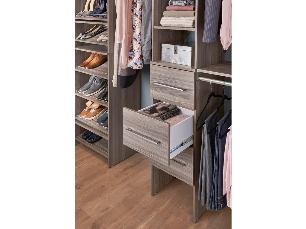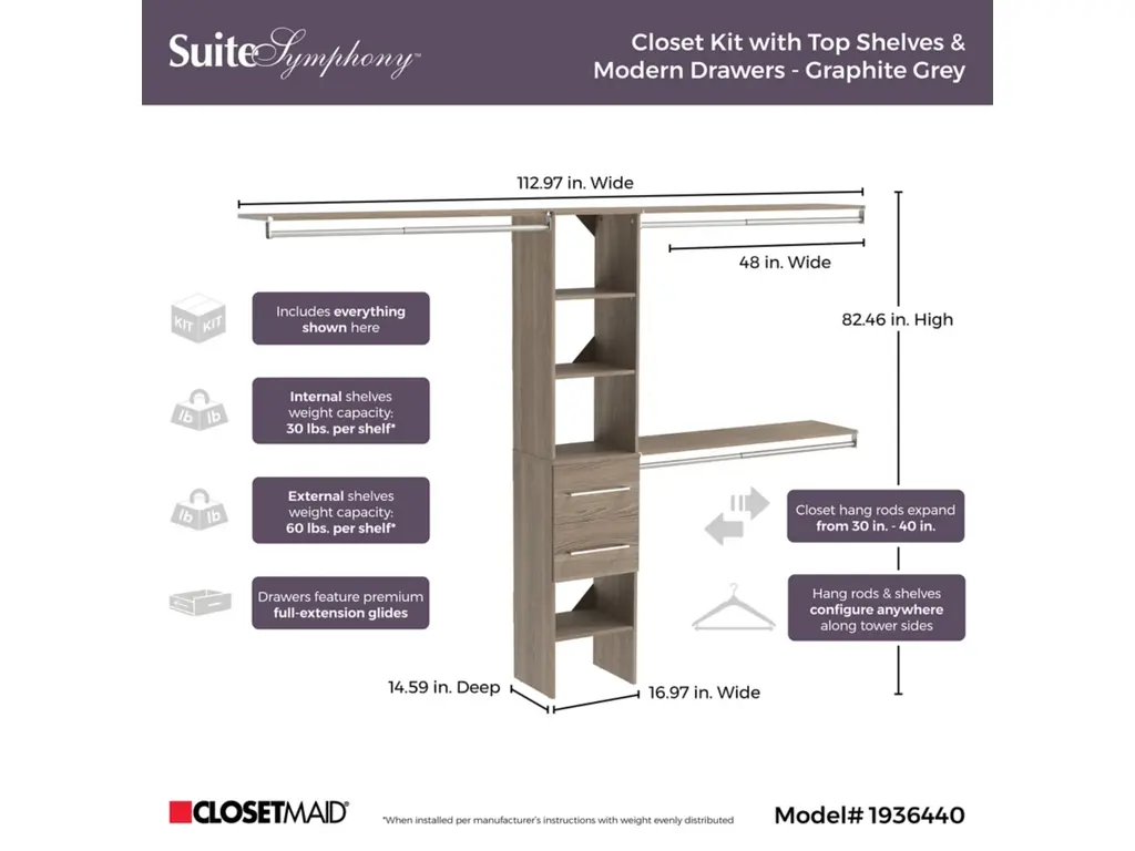 Upgrade your clothing storage with ClosetMaid's SuiteSymphony closet organization systems. This high-quality system includes a 16-inch wide tower with three expandable hanging rods, two modern front drawers and multiple open shelves to keep your clothing and accessories organized. The sturdy laminate frame fits closets between 72 to 108 inches wide and creates up to 75-inches of shelf space and 144-inches of hanging space. Combine this kit with additional SuiteSymphony towers and accessories to create the reach in or walk-in closet of your dreams. SuiteSymphony - beautifully affordable organization to fit your life and style.