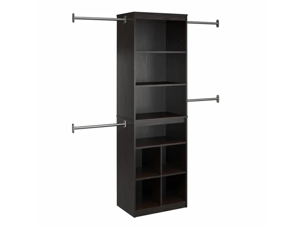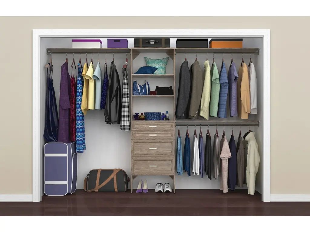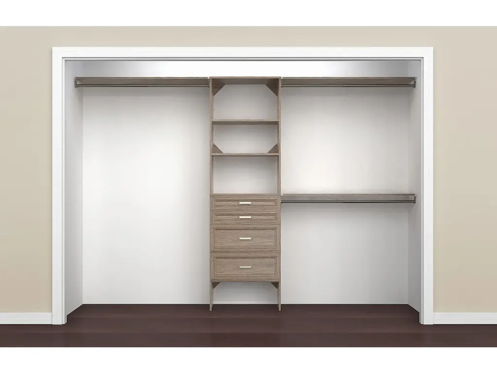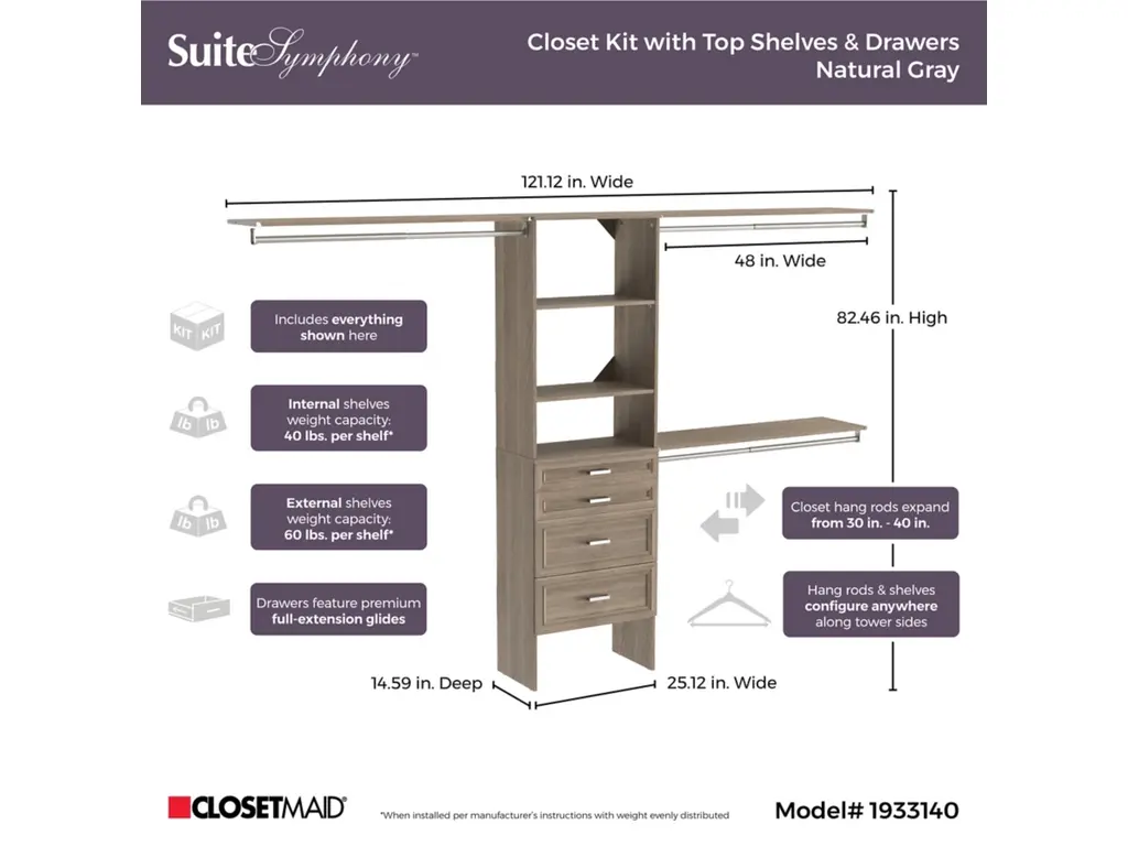 Upgrade your clothing storage with ClosetMaid's SuiteSymphony closet organization systems. This high-quality system includes a 25-inch wide tower with two adjustable shelves, three expandable closet rods, two 5-inch drawers, two 10-inch drawers and three top shelves to keep your clothing and accessories organized. The sturdy laminate frame fits closets between 60 to 120 inches wide and creates up to 264-inches of shelf space and 144-inches of hanging space. Combine this kit with additional SuiteSymphony towers and accessories to create the reach in or walk-in closet of your dreams. SuiteSymphony – beautifully affordable organization to fit your life and style.