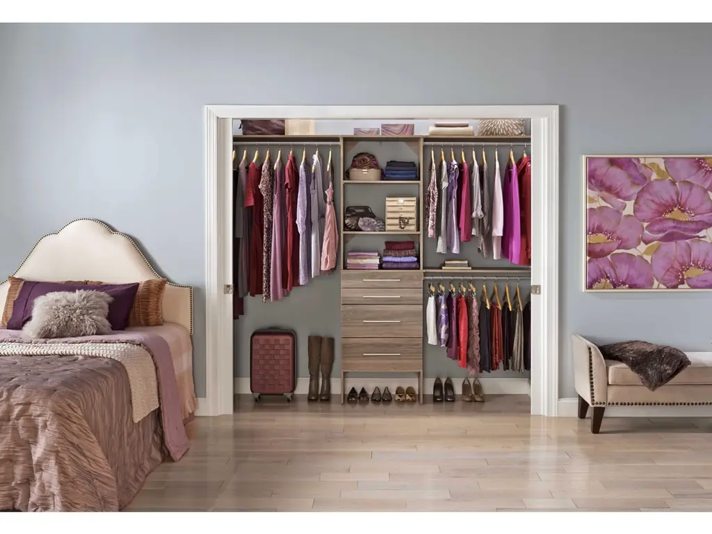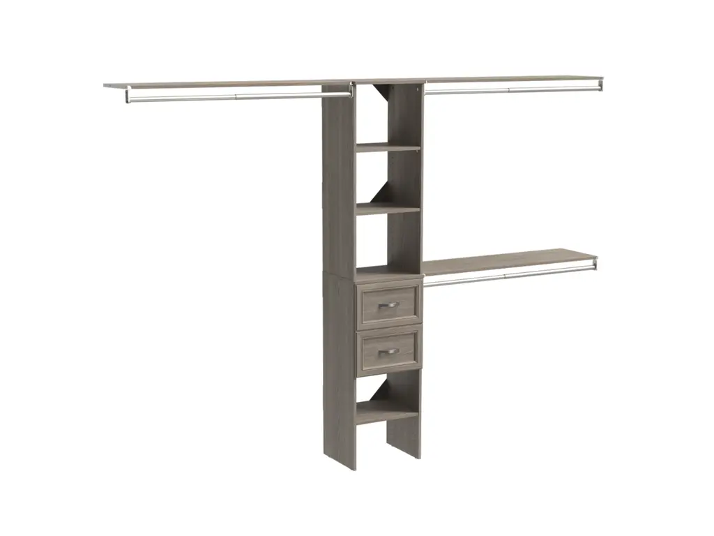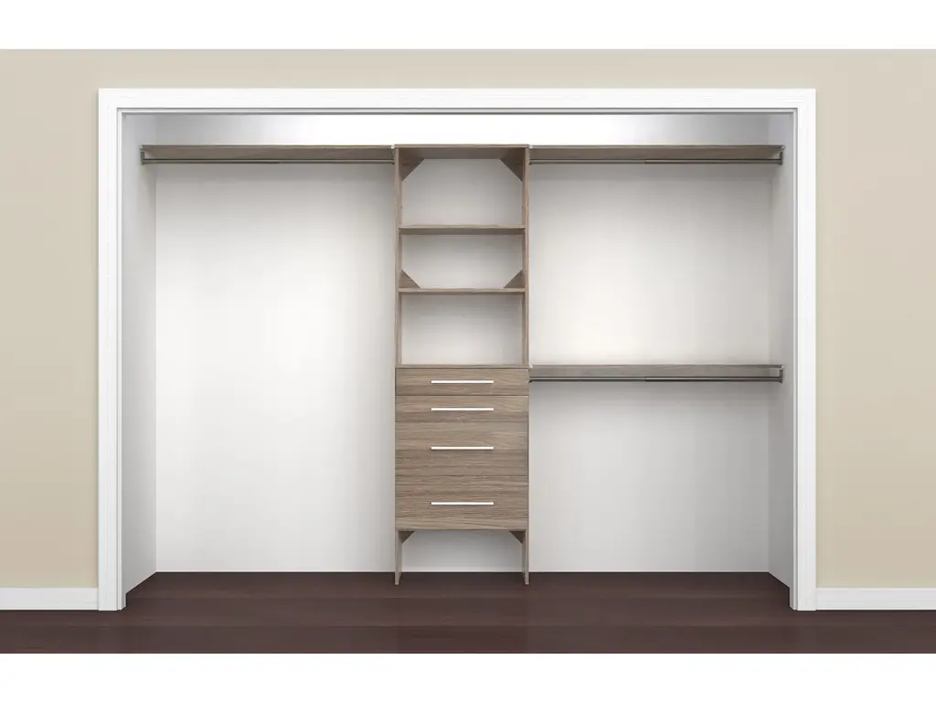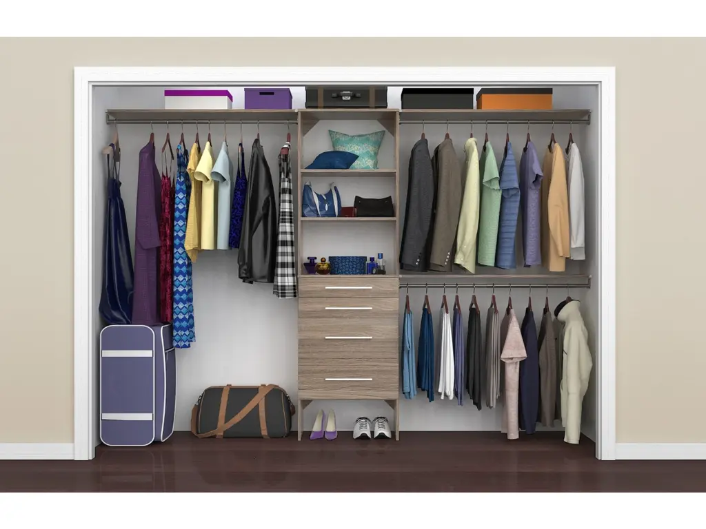 Upgrade your clothing storage with ClosetMaid's SuiteSymphony closet organization systems. This high-quality system includes a 25-inch wide tower with two adjustable shelves, three expandable closet rods, two 5--inch drawers, two 10-inch drawers and three top shelves to keep your clothing and accessories organized. The sturdy laminate frame fits closets between 60 to 120 inches wide and creates up to 264 -inches of shelf space and 144-inches of hanging space. Combine this kit with additional SuiteSymphony towers and accessories to create the reach in or walk-in closet of your dreams. SuiteSymphony – beautifully affordable organization to fit your life and style.