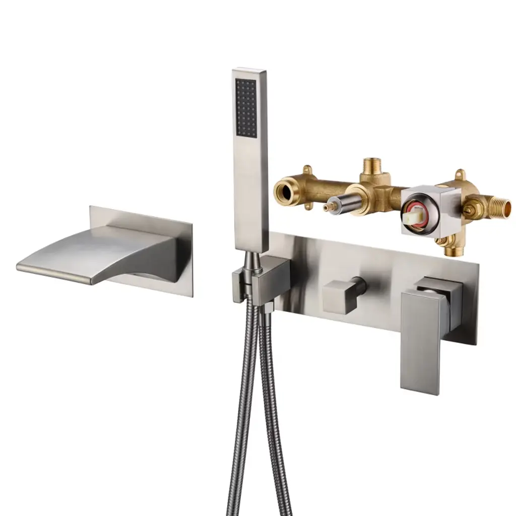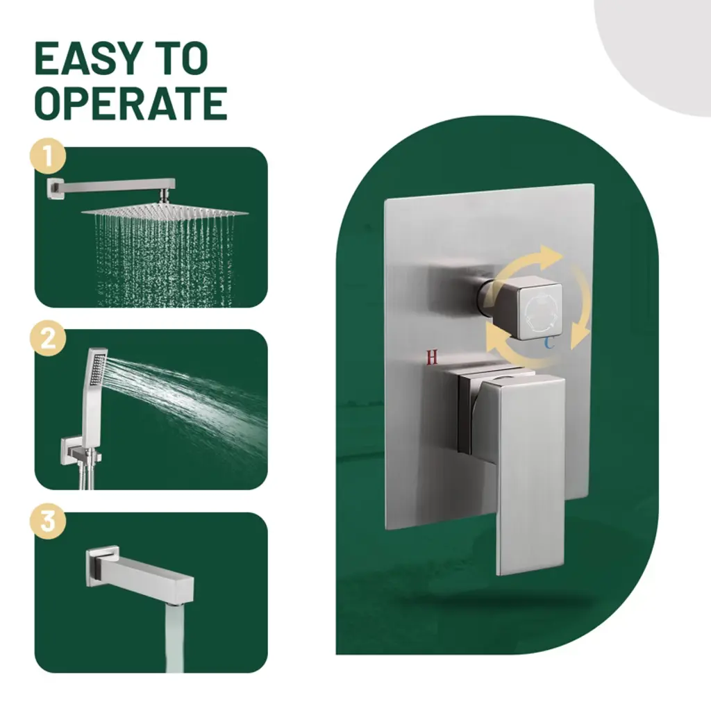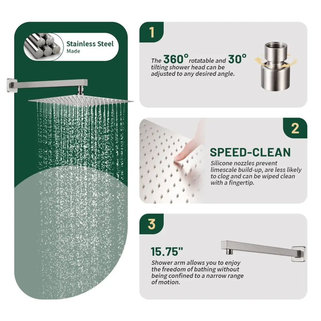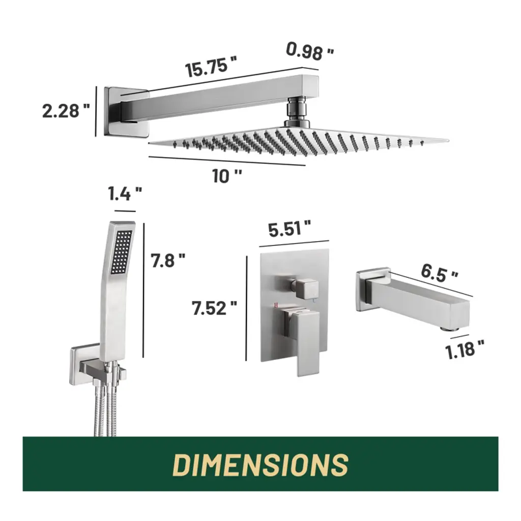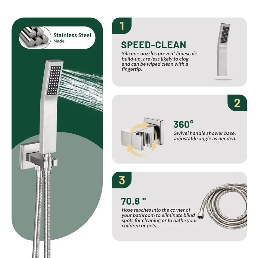 Our shower system has a modern feel that will match most bathroom decorating style. Made from 304 stainless steel and solid brass, this shower mixer is rust-resistant and durable to ensure long-lasting use. The shower head and handle showerhead are fitted with silicone nozzles that wipe away deposited minerals with a simple swipe of your finger, giving the product an instant new look. A pressure-balancing valve monitors water pressure balance, and the 70.8-inch hose reaches into the corners of your bathroom to eliminate cleaning blind spots. Backed by a two-year warranty for added peace of mind. Upgrade your shower with this shower system and enjoy a luxurious and invigorating shower experience every day.