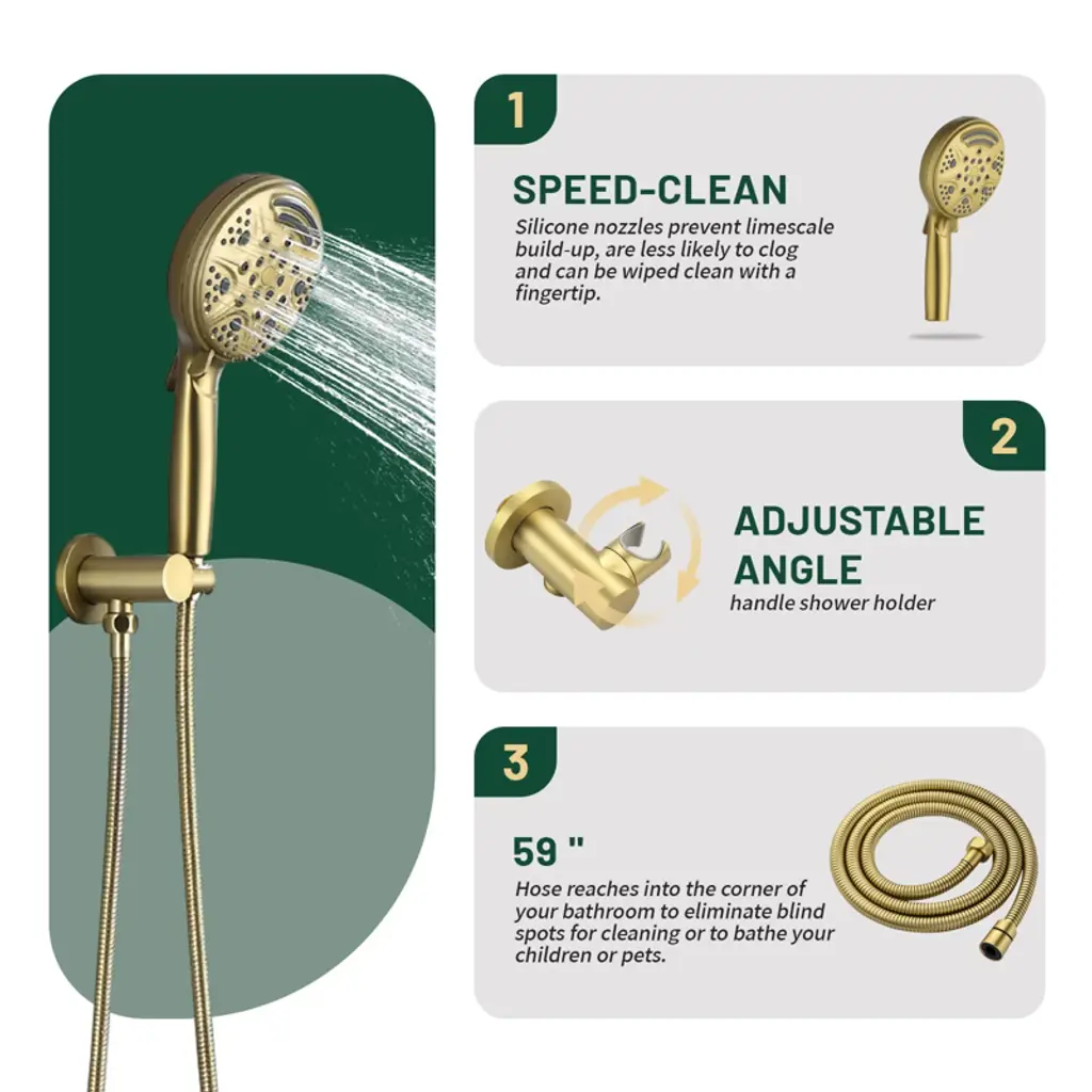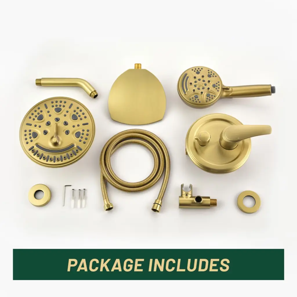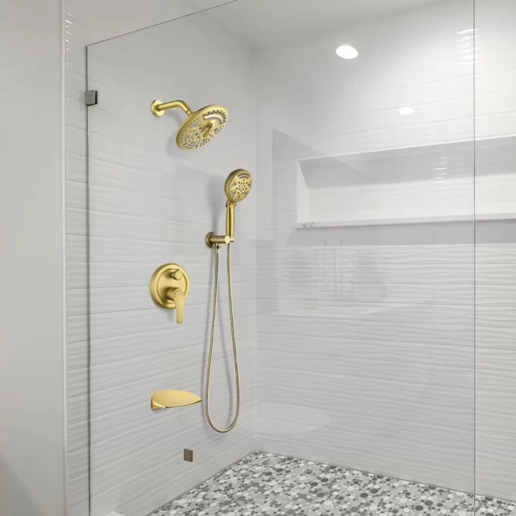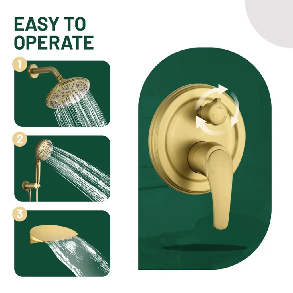 Cobbe Brushed Gold Shower System With Waterfall Tub Spout 8-inch 6 Settings Shower Head 9 Settings Hand Shower And 59-inch Hose Include Valve