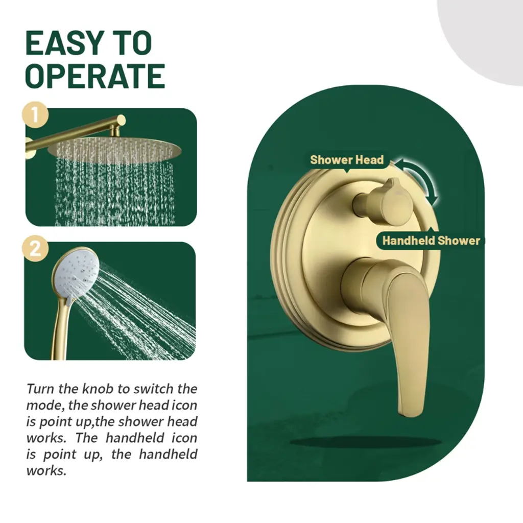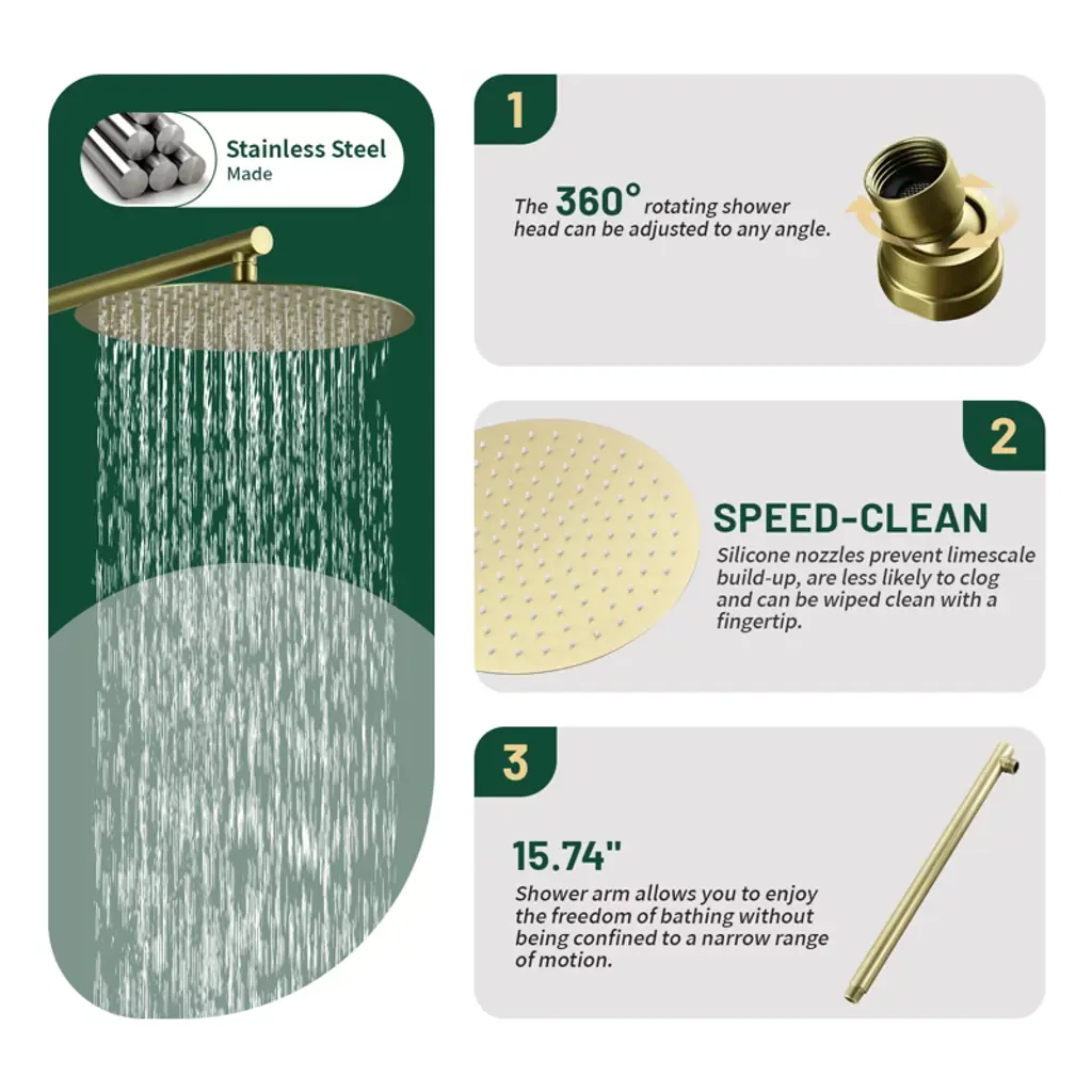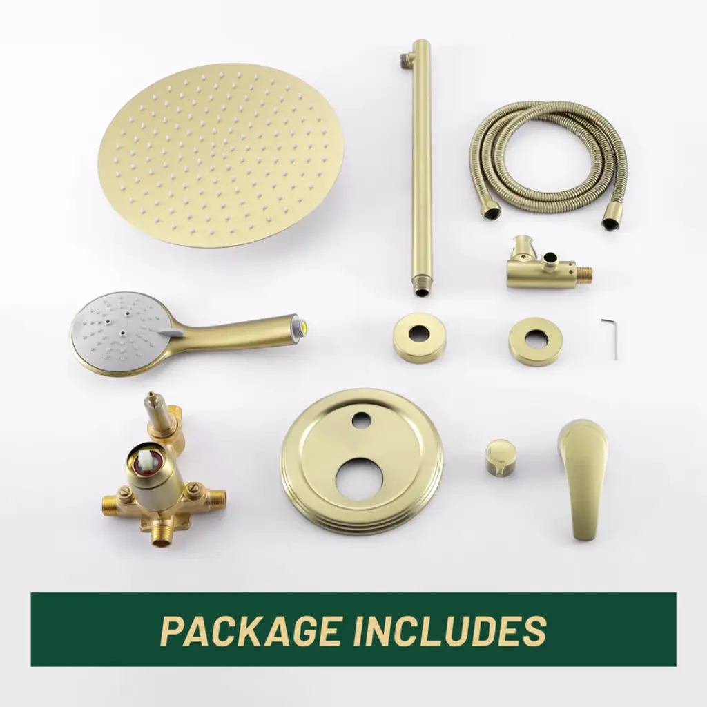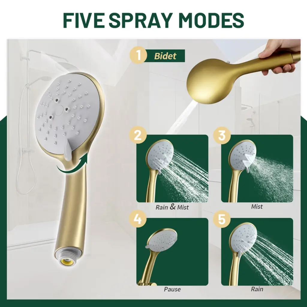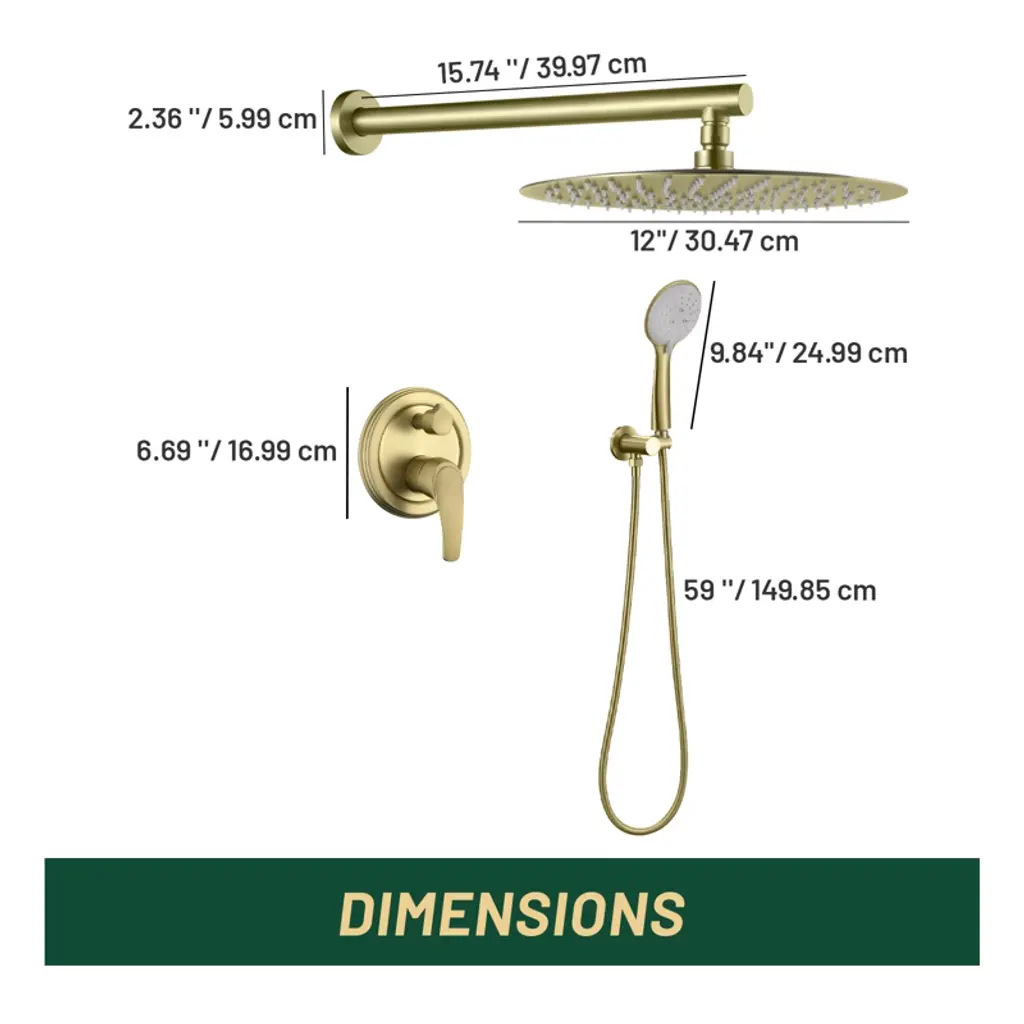 Cobbe Brushed Gold Wall Mount With 12-inch Rainfall Head 5 Settings Hand Shower And 15.74-inch Shower Arm Single Handle Bathroom Shower System