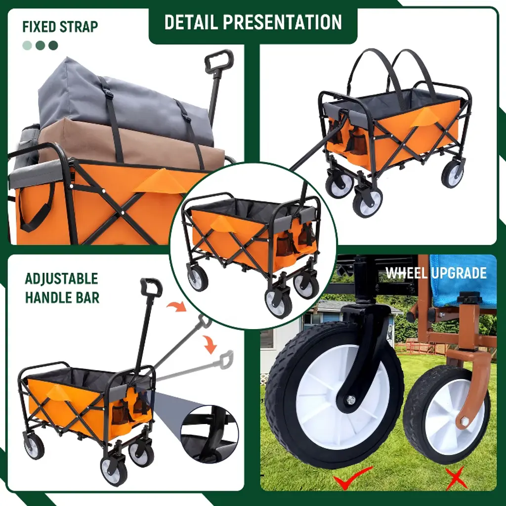 Collapsible Foldable Wagon Cart With Strapping System Beach Wagon, Utility Cart For Camping Supports 225lbs Orange