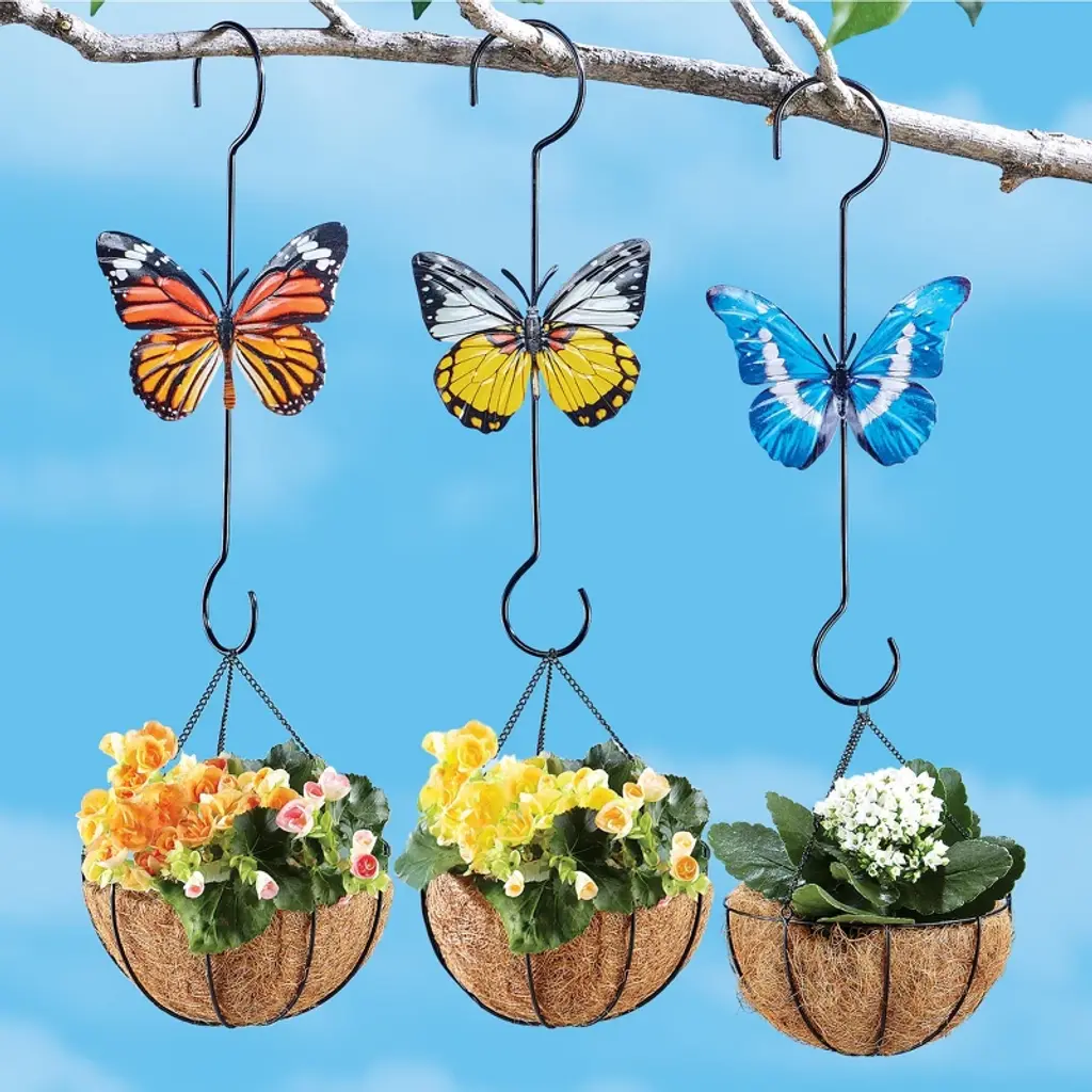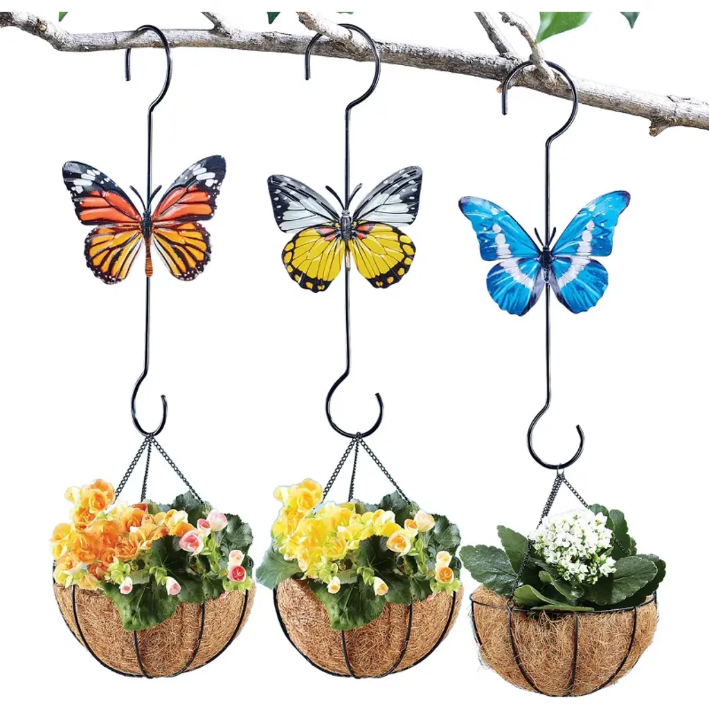 This Trio Of Beautiful Plant Hangers Feature A Colorful Butterfly Design. With A Hook On Each End, They Make It Easy To Display Your Favorite Plants On A Tree Branch And More. Metal. Each Is 15"H X 6 1/4"L. Set Of 3.