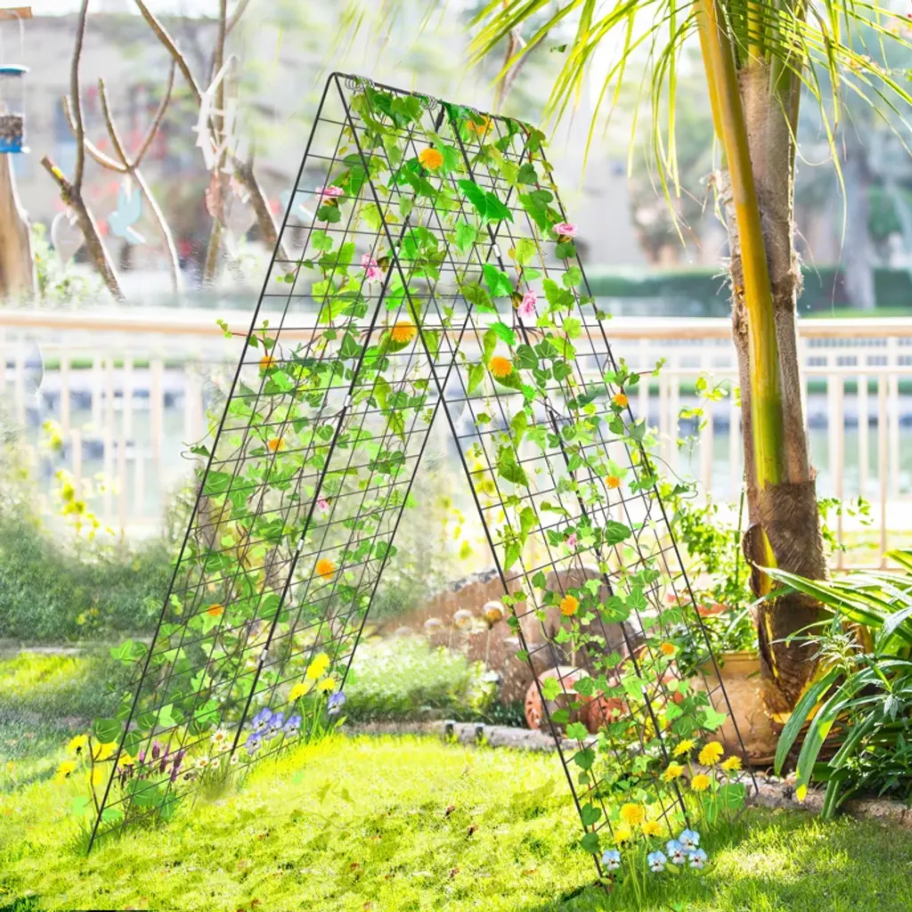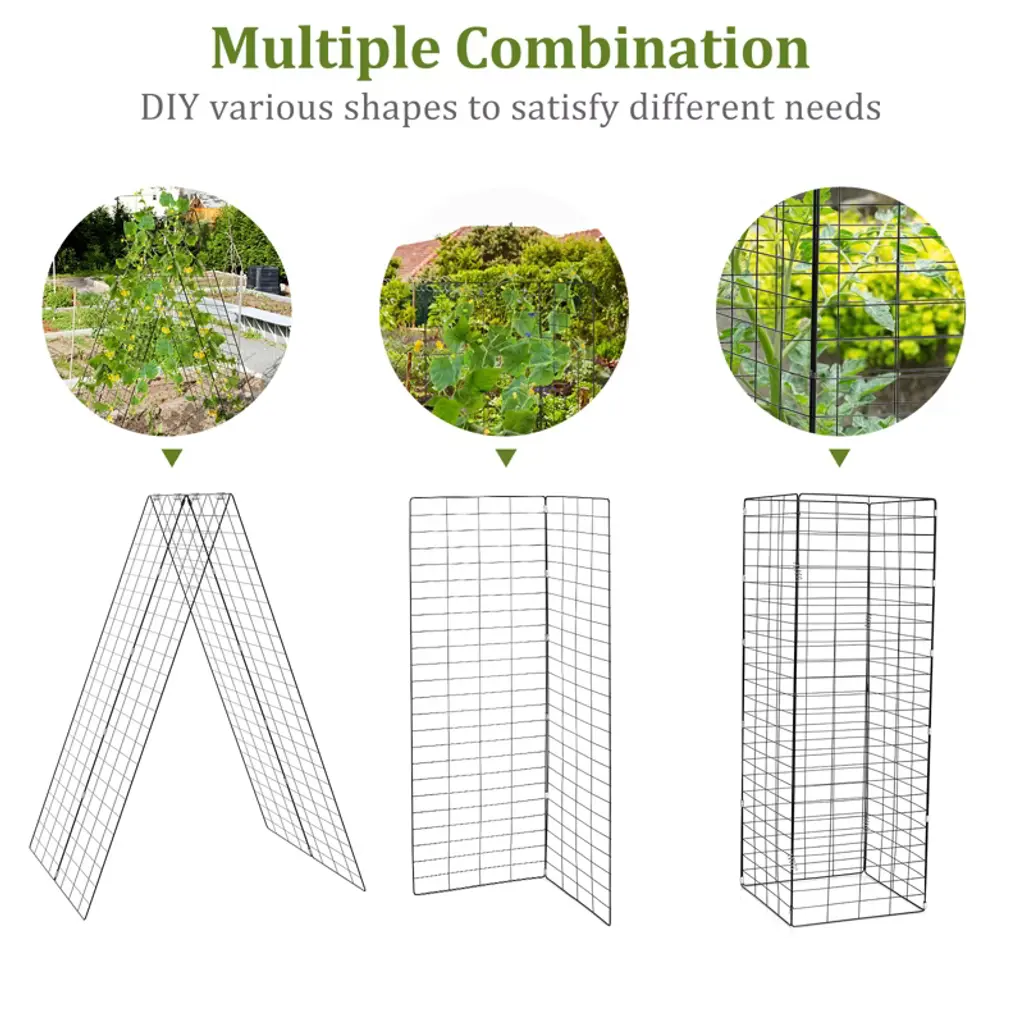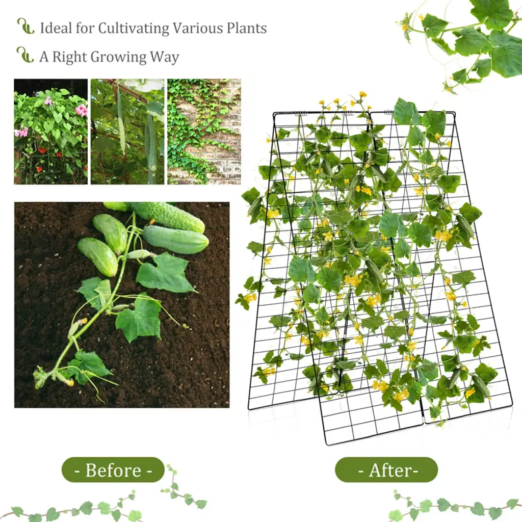 Do you want to own a private garden in your home?Are you still worrying about the bending stem of plant?Our cucumber trellis is a practical planting tool to manage plants. It provides sufficient growing space for various kinds of plants to grow in your garden, such as vines, fruits, flowers, vegetables, etc.Moreover, it is worthy mentioned that the grid design promotes air circulation and helps plants stand on a smooth surface, which is conducive to the growth of plants. The solid steel wire also features good hardness to provide better support for the vegetation. The ground stakes make cucumber trellis more stable to hold your plants.Moreover, it can be twisted for A-frame or square to help plants grow in a suitable way. Enjoy your garden time with our cucumber trellis!FeaturesThe trellis offers perfect growing environment for climbing plants Stable A-frame maximizes space in the garden, yard or raised bed Large planting area to cultivate vines, fruits, flowers, vegetables, etc. Solid steel frame ensures sturdiness and durability Well-polished surface, no worries about damage to plants Combine 2 pieces trellis together for A-frame, square Ground stakes add stability to the cucumber trellis Clips in two different size and cable ties for fixing the plants Garden twist tie with built-in cutter for more convenience Easy to assemble and dismantle Color: Green Material: Steel Overall Dimension: 50.5" x34"(L x W) Net Weight: 13lbs Package includes: 4 x Cucumber Trellis 18 x Big Clip 18 x Small Clip 32 x Ground Stake 16 x Spiral Connector 24 x Cable Tie 2 x Garden Twist Tie 1 x Instruction