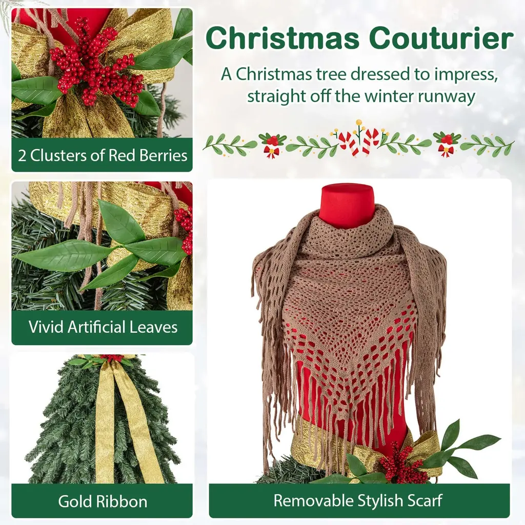 Embodying the elegance of an elegant lady, this 5 ft Xmas tree is adorned with red berries, artificial leaves, a gold ribbon, and a stylish scarf, creating a sophisticated look. Its 248 branch tips are shaped into a delicate skirt, evoking a festive atmosphere. The 100 pre-lit LED lights emit a warm white glow and look like starlight sprinkled upon the branch skirt. Crafted from high-quality PVC material, the Xmas tree is both safe and enduring. This tree ensures convenient setup for your Xmas party. The folding metal stand has a preinstalled bolt for ideal hole alignment. The gloves are provided for hand protection during assembly. The Christmas couturier is perfect for your fashion studio, home, shop, etc. Merry Christmas!FeatureA Christmas tree dressed to impress, straight off the winter runway Beautiful skirt shape is composed of 248 lush branch tips Thanks to 100% new PVC, this tree is fireproof, non-allergic, and anti-fading Red berries, artificial leaves, gold ribbon, and scarf to capture your attention Adorned with 100 LED lights that are energy-saving and endure safe using Equipped with a secure adaptor that is UL certificated Folding metal stand offers reliable support to maintain stability Creative Xmas decoration seamlessly blends into your home, shop, studio, etc Please note that ornaments hanging on the branches are not includedSpecificationColor: Green & Red Material: PVC, Metal Tree Height: 5 ft Tree Width: 2.7 ft Diameter of Stand: 18" Number of Branch Tips: 248 Number of LED Lights: 100 Number of Red Berries (Clusters): 2 Number of Sections: 2 Net Weight: 10 lbs Package Includes: 1 x Christmas Tree 2 x Pairs of Gloves 1 x User Guide
