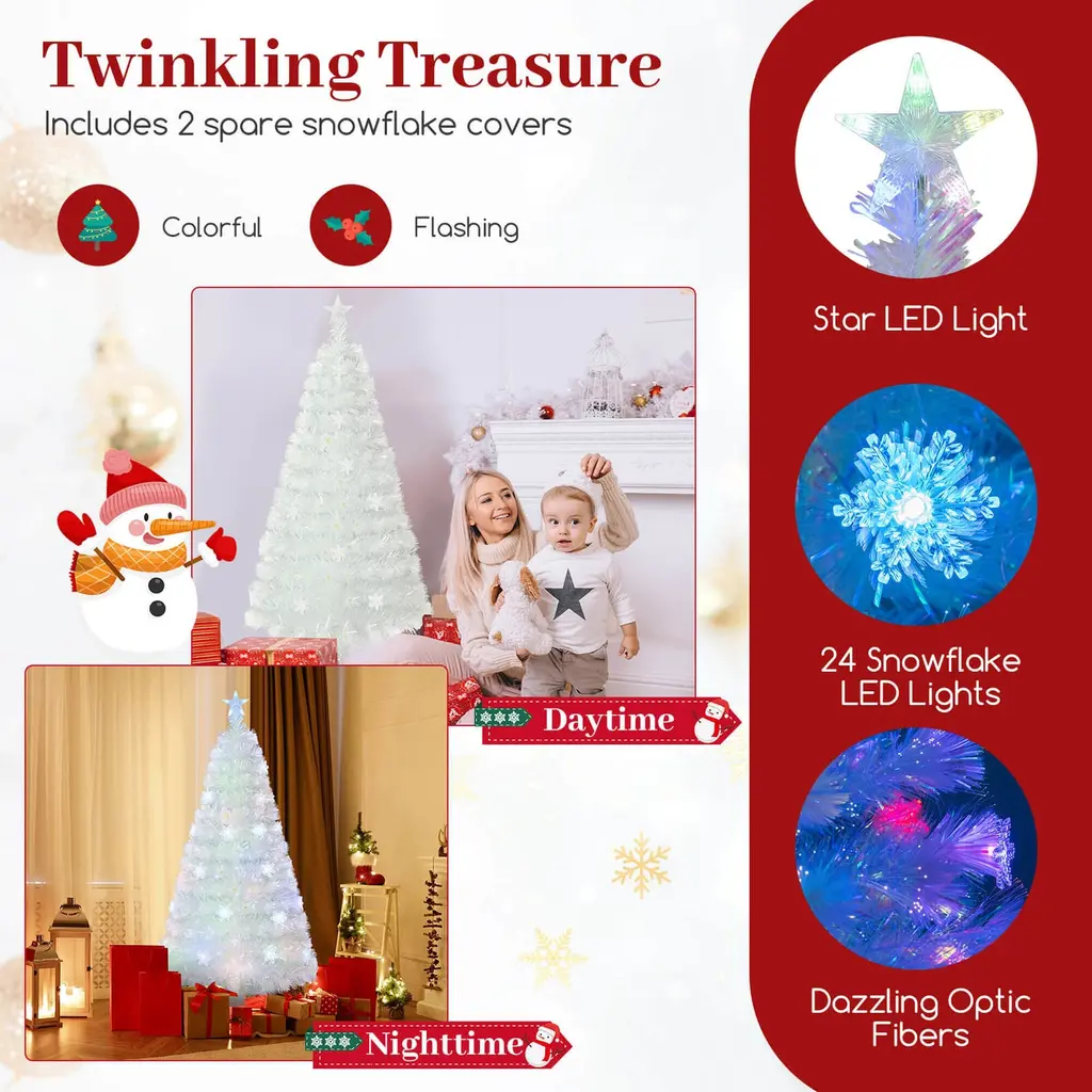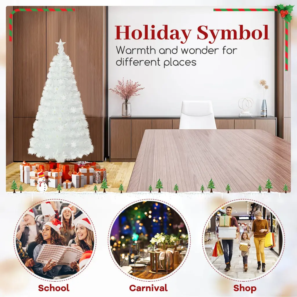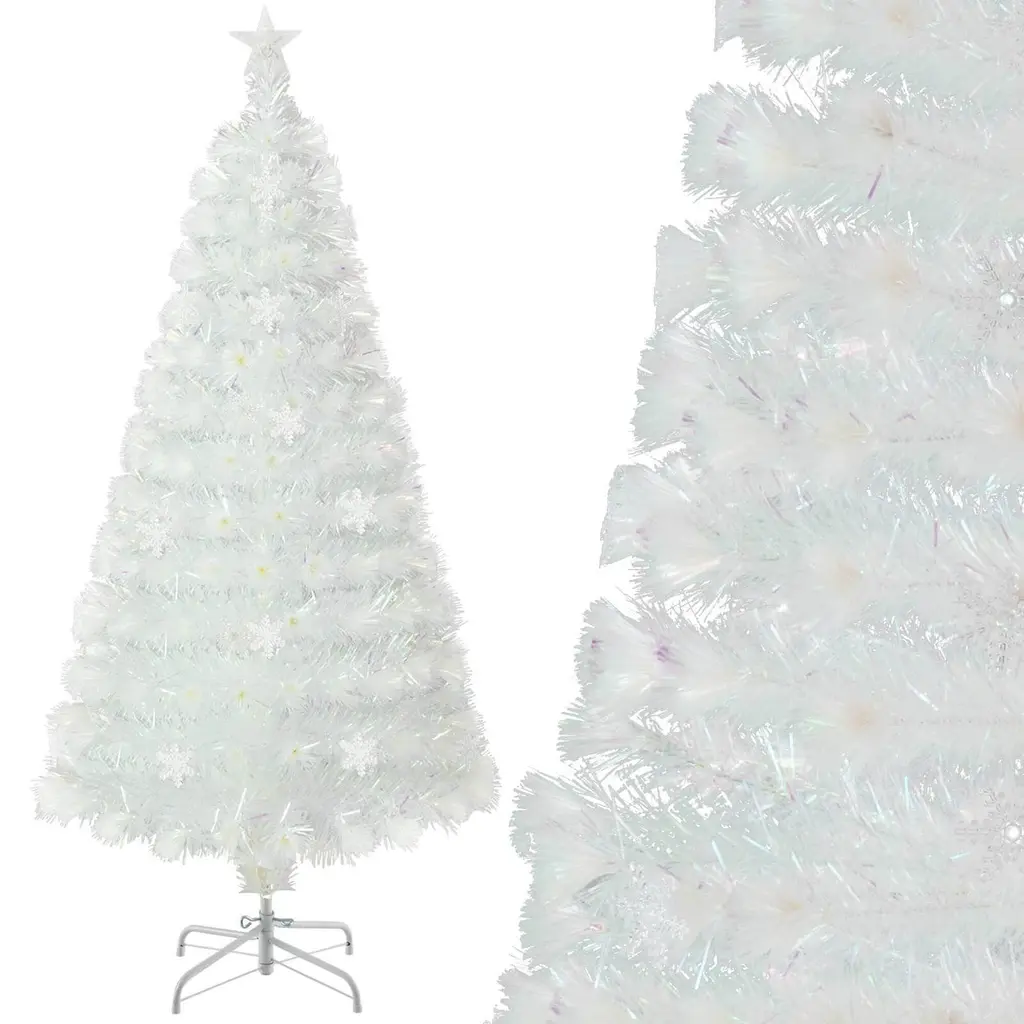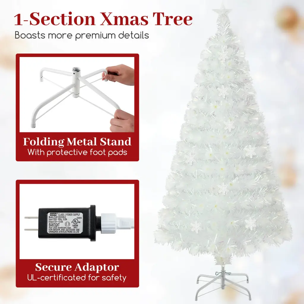 The 1/2-section Xmas tree boasts 170/230/270 branch tips that are composed of iridescent film leaves to reflect a rainbow of colors. Boasting a glowing star LED light, 24/36/48 colorful snowflake LED lights, and optic fibers, the 5/6/7 ft Christmas tree puts on a mesmerizing light show. The Christmas tree displays a different appearance during the daytime and nighttime. Made of high-quality PET material, it is non-allergic, fade-resistant, and free of any unpleasant smell. In addition, the holiday symbol boasts more premium details, including spare snowflake covers, a folding metal stand, and a UL-certified adaptor. Merry Christmas!FeatureIridescent film leaves reflect light to create a dazzling display of rainbow hues 170/230/270 branch tips are made of non-allergic, anti-fading, smell-free, and new PET Twinkling treasure includes 2 spare snowflake covers for emergencies Star light, snowflake LED lights, and optic fibers for a flashing lighting show Supported by a folding metal stand with protective foot pads Comes with a secure adaptor that is UL-certificated for safety Warmth and wonder for different places, such as school, shop, carnival, etcSpecificationColor: White Material: PET Tree Height: 5 ft, 6 ft, 7 ft Tree Width: 2.4 ft, 2.6 ft, 2.9 ft Diameter of Stand: 14", 16", 18" Number of Branch Tips: 170/230/270 Number of Snowflake LED Lights: 24/36/48 Number of Sections: 1/2/2 Net Weight: 8.5 lbs, 12 lbs, 14.5 lbs Package Includes: 1 x Christmas Tree 2 x Spare Snowflake Covers 1 x User Guide