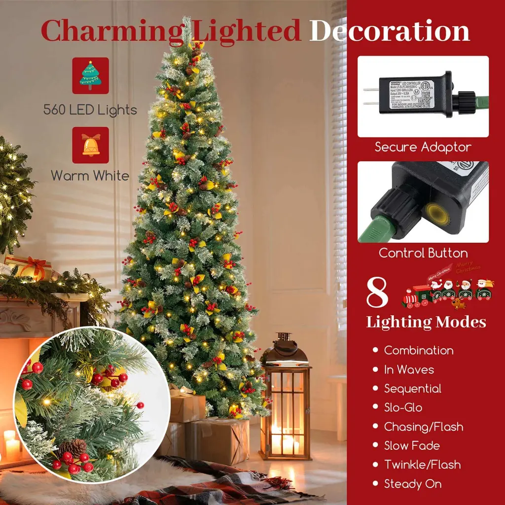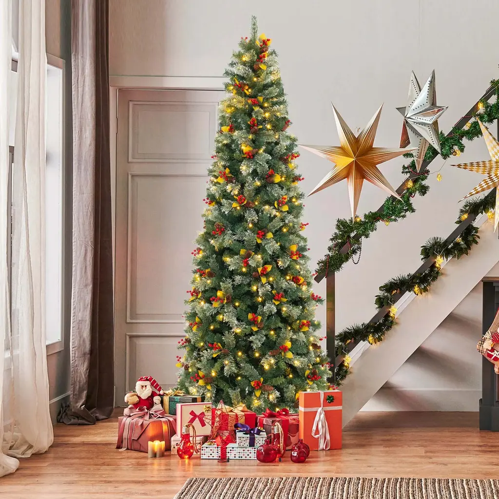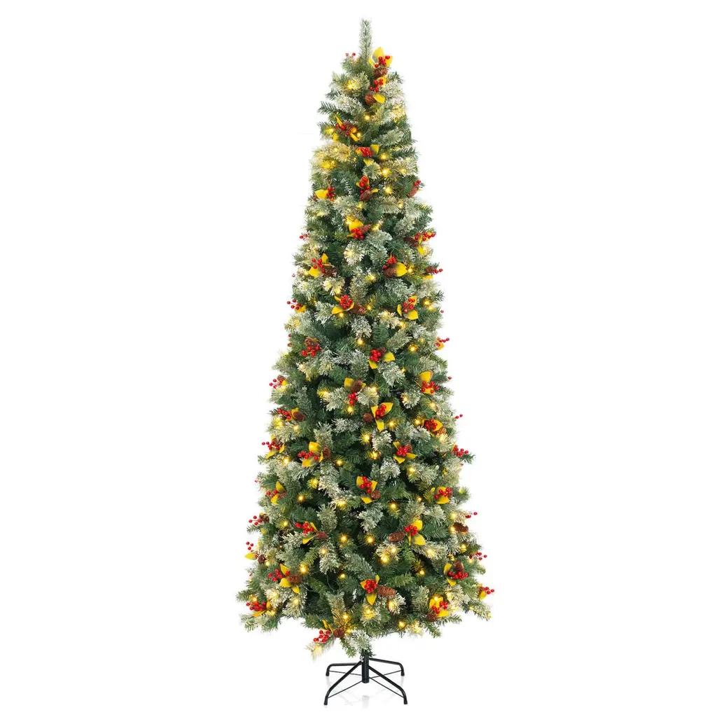 Crafted with 453/1096/1416 snowy branch tips, the 5/7.5/9 ft Xmas tree showcases a lifelike charm with lush pine needles, natural pine cones, red berries, and gradient leaves. It boasts 230/460/560 warm white LED lights offering 8 lighting modes for a festive glow, such as chasing/flash, twinkle/flash, steady on, etc. The Christmas tree’s hinged design ensures easy setup, while the sturdy metal stand provides stability. Versatile for year-round use, this decoration tree can illuminate various settings and conveniently stores in 3/4 sections when not in use. Made of safe PVC materials, it radiates a winter wonderland vibe while maintaining a smell-free, fireproof, non-allergic, and smell-free construction. More attractive details await your discovery. Merry Christmas!Feature453/1096/1416 branch tips are slightly flocked for a realistic and vibrant appearance Combines pine needles, natural pine cones, red berries, and artificial leaves Premium PVC material is fireproof, non-allergic, anti-fading, and smell-free Charming lighted decoration with 230/460/560 LED lights that emit a warm white glow Use the control button to conveniently switch among 8 lighting modes Equipped with a secure adaptor for enhanced using safety Thanks to the hinged structure, the branches expand automatically Practical Xmas tree can be divided into 3/4 sections for compact storage The folding metal stand provides strong support for great stability Eye-catching decoration for homes, offices, shops, schools, and beyondSpecificationColor: Green Material: PVC, Metal Tree Height: 5/7.5/9 ft Tree Width: 2.5/3.3/3.6 ft Diameter of Stand: 16/20/22" Number of Branch Tips: 453/1096/1416 Number of LED Lights: 230/460/560 Number of Red Berries: 40/76/92 Number of Pine Cones: 40/76/92 Number of Artificial Leaves: 40/76/92 Number of Sections: 3/4 Net Weight: 11/24.5/32 lbs Package Includes: 1 x Christmas Tree 1 x User Guide