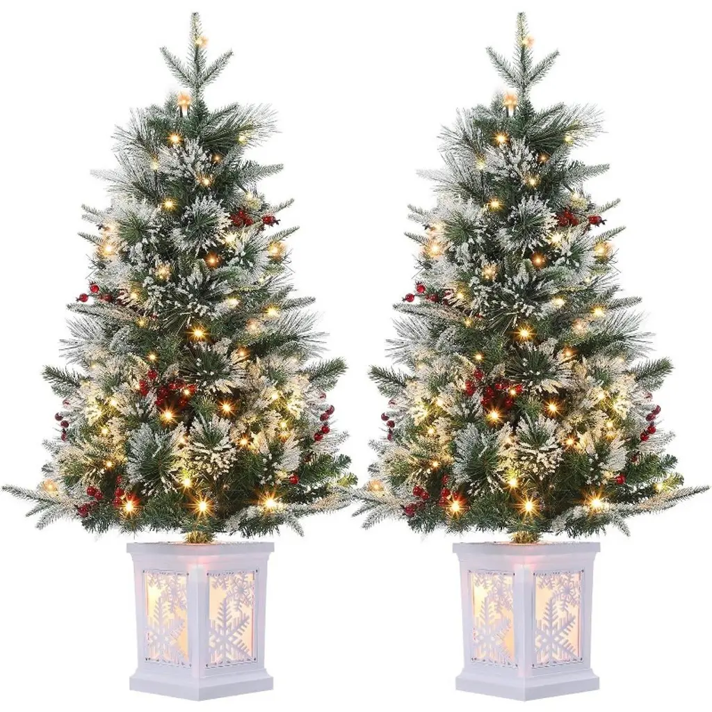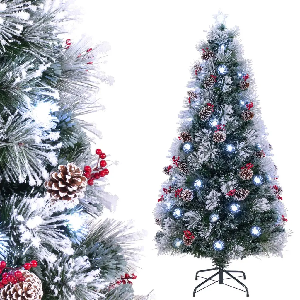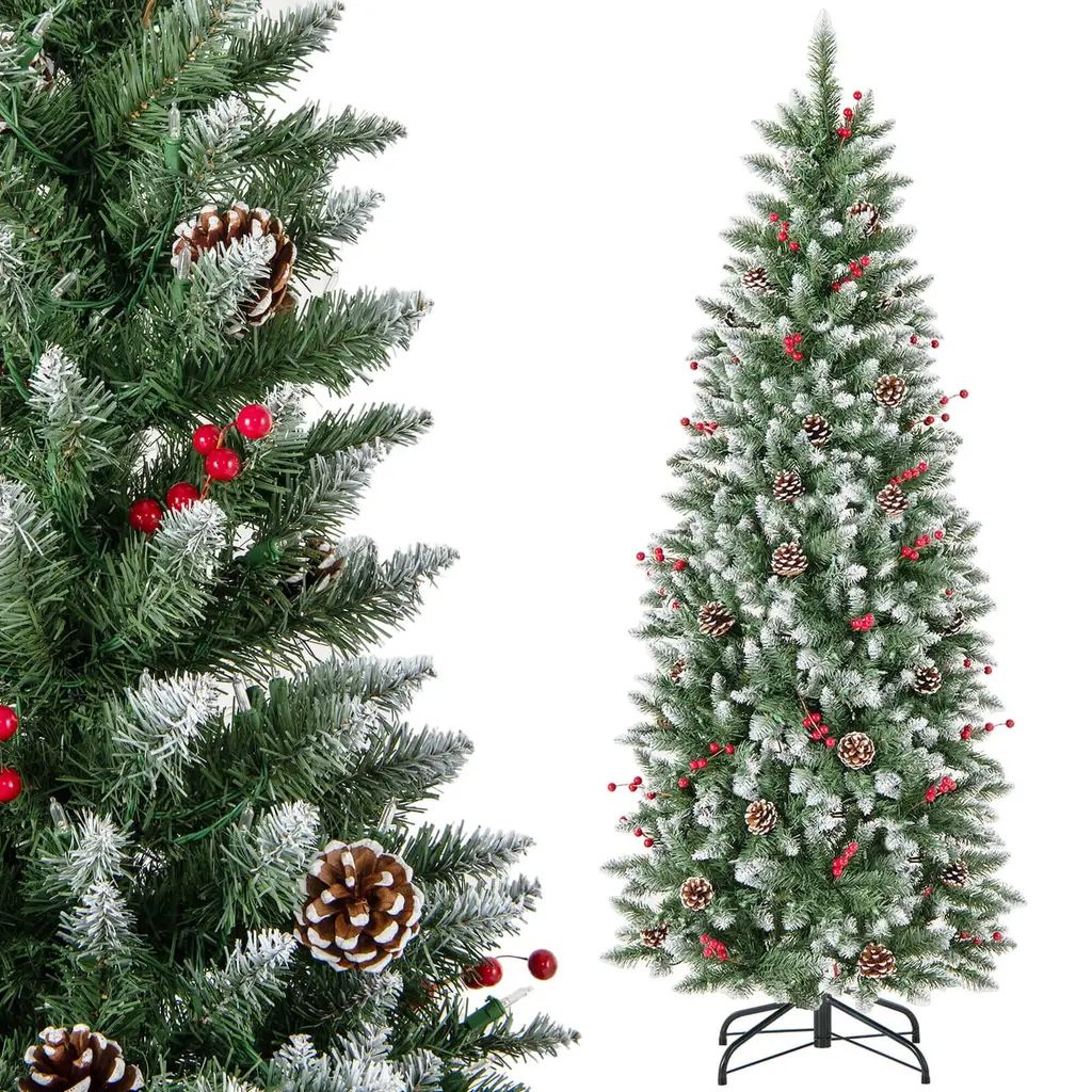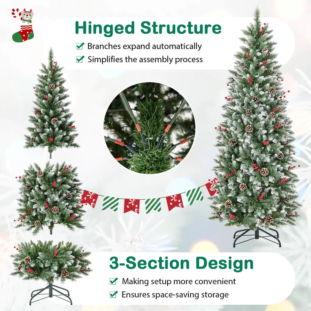 Crafted with 618 snowy branch tips, 33 pine cones, and 32 clusters of red berries, the 6ft Xmas tree exudes a vibrant, snowy charm. Thanks to 280 warm white LED lights, the Christmas tree emits a tender luminescence that dances among the branches. In addition, it is made of selected PVC material that is fireproof, non-allergic, anti-fading, and smell-free. The secure Xmas addition also comes with a hinged structure that simplifies the assembly process. The folding metal stand provides strong support, making setup more convenient. Its slim, pencil shape allows for versatile placement in homes, offices, shops, or festive gatherings. Merry Christmas!FeatureFeatures 618 snowy branch tips that perfectly mimic a real tree With a bullet-shaped design, branches look adorable 100% new PVC is fireproof, non-allergic, anti-fading, and smell-free Visual symphony with 33 natural pine cones and 32 clusters of red berries 280warm white LED lights create a loving and romantic atmosphere Delicate teardrop shape of each light makes the Xmas tree more exquisite Hinged structure ensures branches expand automatically Boasts a 3-section design that ensures space-saving storage Supported by a folding metal stand that offers reliable support for stability Thanks to the preinstalled bolt, the Xmas tree ensures perfect hole alignment Designed with a slim pencil shape that seamlessly fits into any corner Equipped with a UL-certificated adaptor to ensure the using safety Safe choice for wide use in your home, office, shop, carnival, and more Please note that ornaments are not includedSpecificationColor: Green & White Material: PVC, Metal Tree Height: 6 ft Tree Width: 2.3 ft Diameter of Stand: 18" Number of Branch Tips: 618 Number of LED Lights: 280 Number of Red Berries (Clusters): 32 Number of Pine Cones: 33 Number of Sections: 3 Net Weight: 14 lbs Package Includes: 1 x Christmas Tree 2 x Pairs of Gloves 1 x User Guide