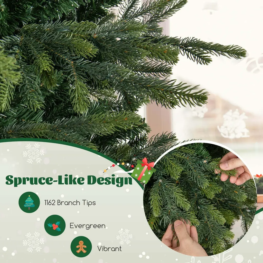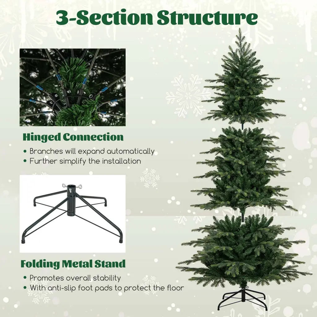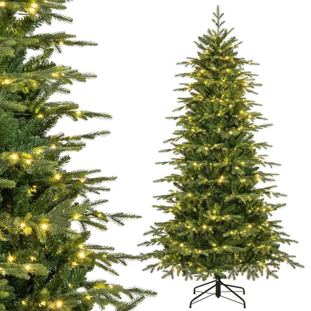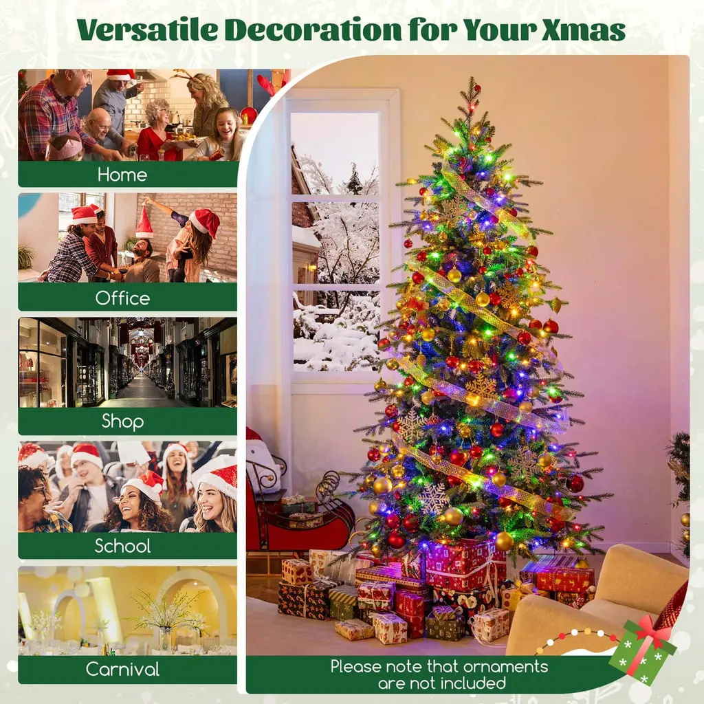 Illuminate your holidays with the 6/7.5/9 ft Xmas tree featuring lifelike 714/1162/1770 branch tips. This pre-lit tree comes with 260/380/560 LED lights offering warm white and colorful options. The Christmas tree features 11 lighting modes, including combination, C1 steady, C2 steady on, C1 mixture, C2 mixture, in wave, slo-glo, breathing, C1 slo-glo, C2 slo-glo, and flash. In addition, it comes with 3 auto timers for 6h on + 18h off, 8h on + 16h off, and 6h on + 6h off + 3h on + 9h off. The Xmas tree can be controlled by the remote or the light controller. Crafted from high-quality PE and PVC materials, the Xmas tree is smell-free, anti-fading, non-allergic, and fireproof. The hinged connection makes branches expand automatically. The folding metal stand promotes overall stability and can also further simplify the installation. The Xmas tree also includes gloves to protect your hands. It is a versatile decoration for your Xmas and blends well into your home, office, shop, school, carnival, etc. Merry Christmas!FeatureContains 714/1162/1770 branch tips that are evergreen and vibrant Made of 100% new materials, PE and PVC, the tree is safe for your kids and pets Up to 260/380/560 LED lights delight your guests and create a loving atmosphere 2 lighting colors, warm white and multi-color, create a loving and romantic Xmas vibe 11 lighting modes and 3 auto timer modes for a dreamy, energy-saving lighting show Boasts a 4-level adjustable brightness to fit your festive mood Memory function conveniently restores your previous setting Enjoy more convenience with dual control ways With a hinged connection, branches will expand automatically Folding metal stand with anti-slip foot pads to protect the floor Features a 3/4-section structure for easy setup and space-saving storage The UL-certificated adaptor is included to ensure optimal using safety Please note that ornaments are not includedSpecificationColor: Green Material: PE, PVC, Metal Tree Height: 6/7.5/9 ft Tree Width: 3.6/4.4/5 ft Diameter of Stand: 20/21.5/25.5" Number of Branch Tips: 714/1162/1770 Number of LED Lights: 260/380/560 Number of Sections: 3/4 Net Weight: 14.5/24.5/36.5 lbs Package Includes: 1 x Christmas Tree 1 x Pair of Gloves 1 x User Guide