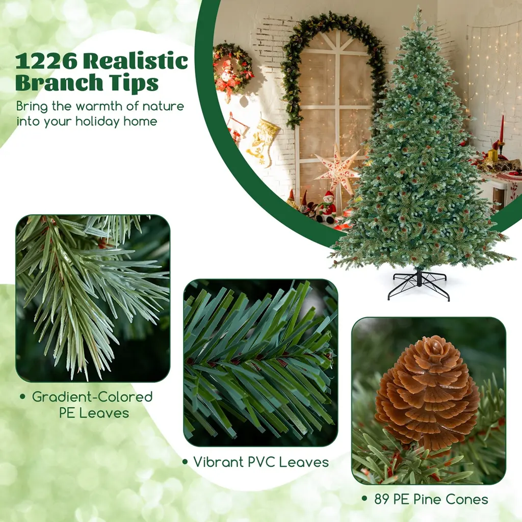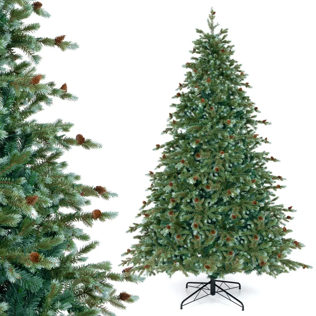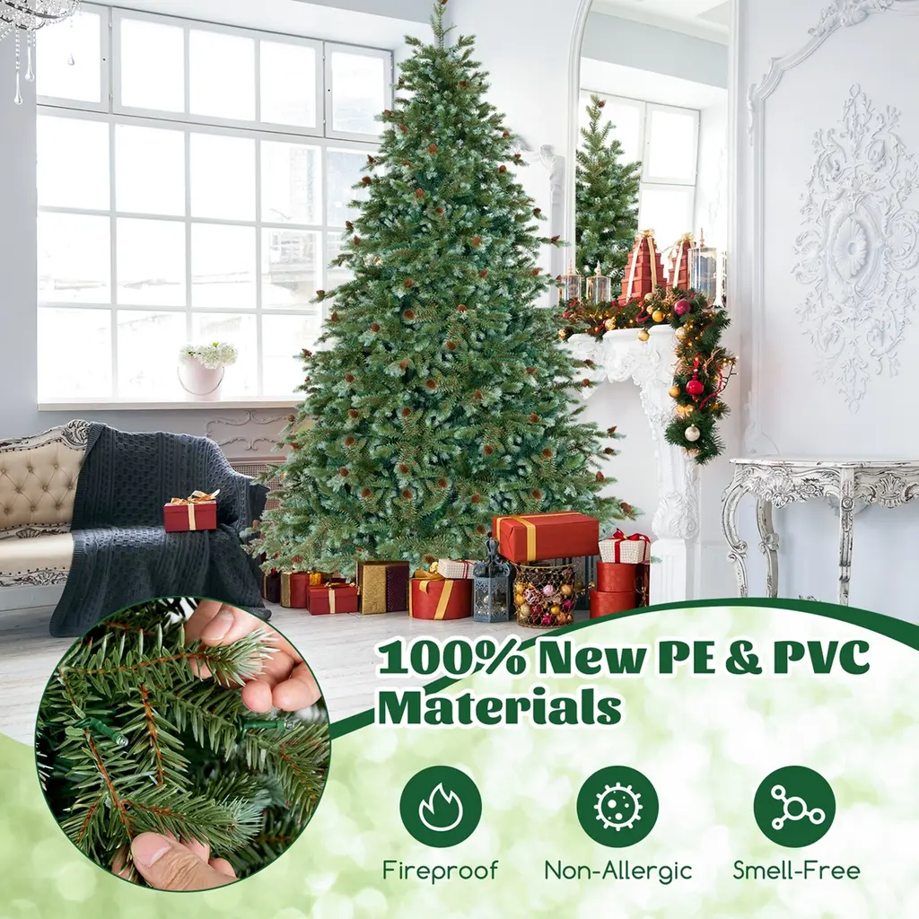 A stunning 6/7/8 ft Xmas tree combines 53/69/89 PE pine cones and 590/846/1226 branch tips, creating cozy corners for the Christmas season. Crafted from 100% new fireproof PVC and PE materials, this Christmas tree is safe, non-allergic, and fade-resistant. It features 240/340/410 warm white LED lights with 8 dazzling modes, including combination, sequential, chasing/flash, twinkle/flash, steady on, and more, all powered by a UL-certified adaptor. Convenient hinged structure allows for easy setup. When installing 3/3/4 sections, branches will expand automatically. The included folding metal stand maintains optimal stability. A pair of gloves is provided for added protection. More practical details await your discovery, Merry Christmas!FeatureBring the warmth of nature into your holiday home with 590/846/1226 branch tips Adorned with 53/69/89 PE pine cones for a more realistic appearance 100% new PE and PVC materials are fireproof, non-allergic, and smell-free 240/340/410 warm white LED lights feature 8 dazzling lighting modes Thanks to the hinged structure, the setup process becomes easier Metal stand ensures swift setup and provides reliable support for stability Equipped with a safe adaptor that comes with the UL certification Includes a pair of gloves to protect your hands from scratches Versatile Xmas decoration for your home, office, shop, school, and more Please note that ornaments are not includedSpecificationColor: Green Material: PE, PVC, Metal Tree Height:6/7/8 ft Tree Width: 3.9/4.4/4.9 ft Diameter of Stand: 20/25/25" Number of Branch Tips: 590/846/1226 Number of LED Lights: 240/340/410 Number of Pine Cones: 53/69/89 Number of Sections: 3/3/4 Net Weight: 16/25/34 lbs Package Includes: 1 x Christmas Tree 1 x Pair of Gloves 1 x User Guide