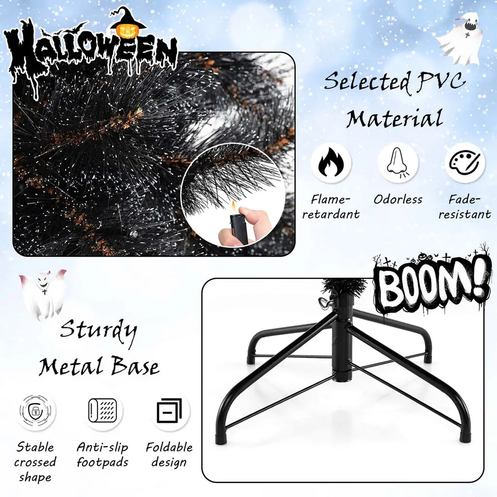 Indulge in the spooky allure of an 6/7/8 ft Halloween tree, adorned with 362/572/860 black branch tips and frosted pine needles. Crafted from premium materials, this decoration tree is fireproof, non-allergic, and smell-free, ensuring optimal safety for kids and pets. Its 210/320/450 clear white LED lights, powered by a UL-certified adaptor, leave you a lasting impression. The tree is easy to install with the convenient hinged design and included protective gloves. When not in use, the Halloween tree can be easily disassembled into 3 sections for efficient storage. Supported by a sturdy folding metal stand, this Halloween tree adds a chilling touch to any setting, such as your school, carnival, shop, etc.Feature362/572/860 luxuriant branches fill your space with great vibrancy Vivid PVC leaves are fireproof, non-allergic, anti-fading, and smell-free Features frosted pine needles that perfectly mimic the real tree 210/320/450 LED lights cast a clear white glow and are energy-saving Comes with an adaptor for safe using, which is UL certificated Thanks to the hinged structure, branches will automatically expand Upgraded metal stand has a preinstalled bolt for ideal hole alignment Boasts a 3-section structure that ensures easy storage Exquisite festive decoration is perfect for your Halloween or Christmas partiesSpecificationColor: Black Material: PVC, Metal Tree Height: 6/7/8 ft Tree Width: 3/3.5/4.2 ft Diameter of Stand: 18/20/24" Number of Branch Tips: 362/572/860 Number of LED Lights: 210/320/450 Number of Sections: 3 Net Weight: 13/20/28 lbs Package Includes: 1 x Halloween Tree 2 x Pairs of Gloves 1 x User Guide