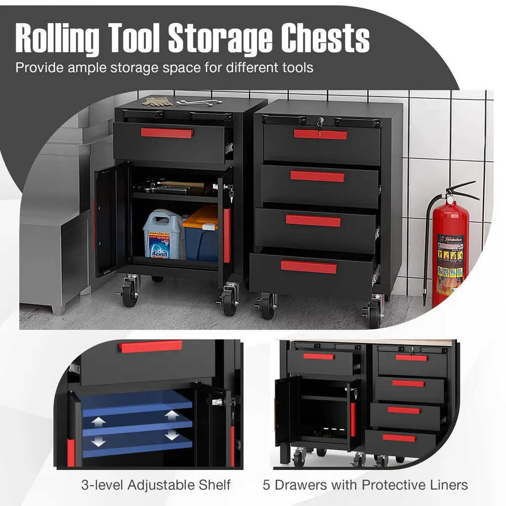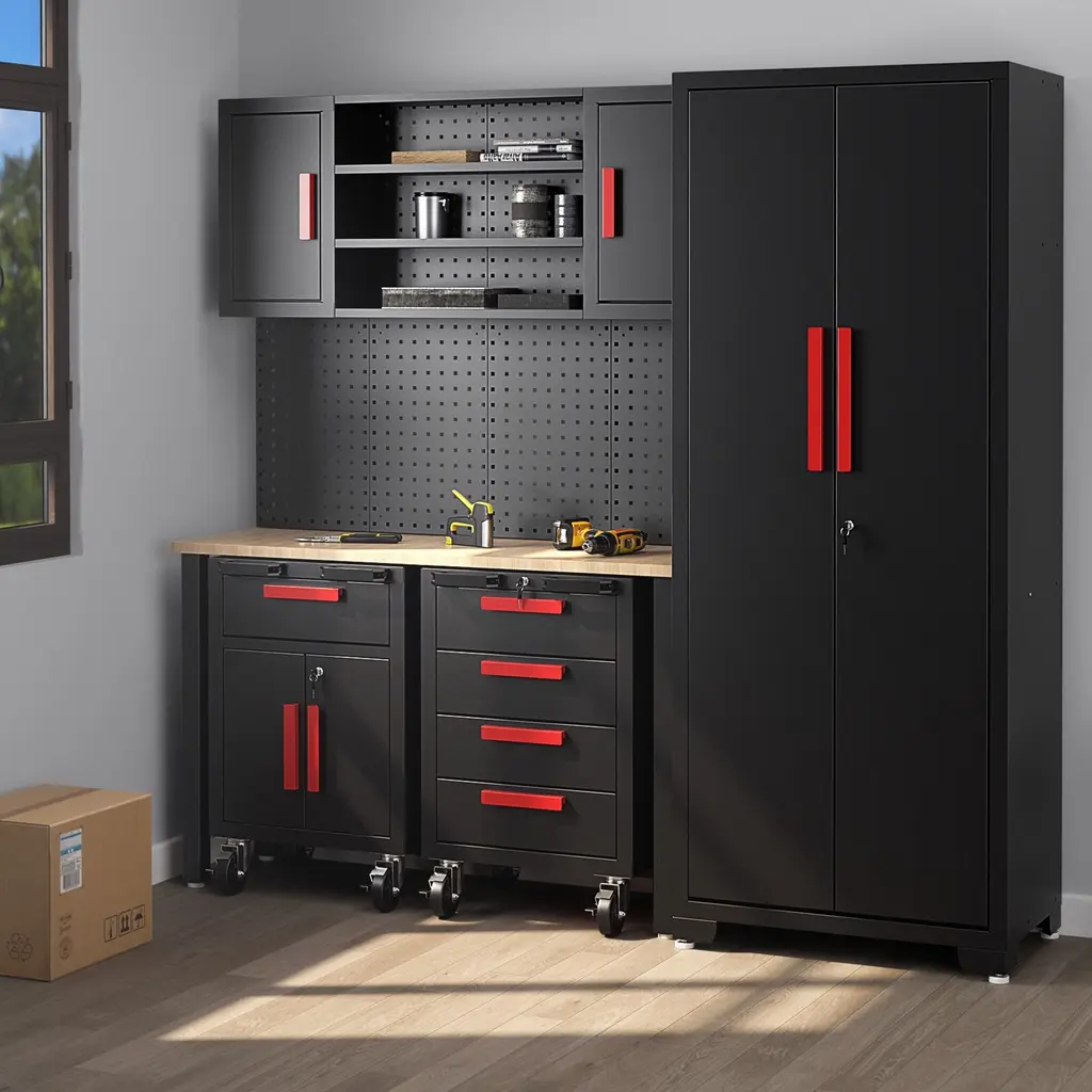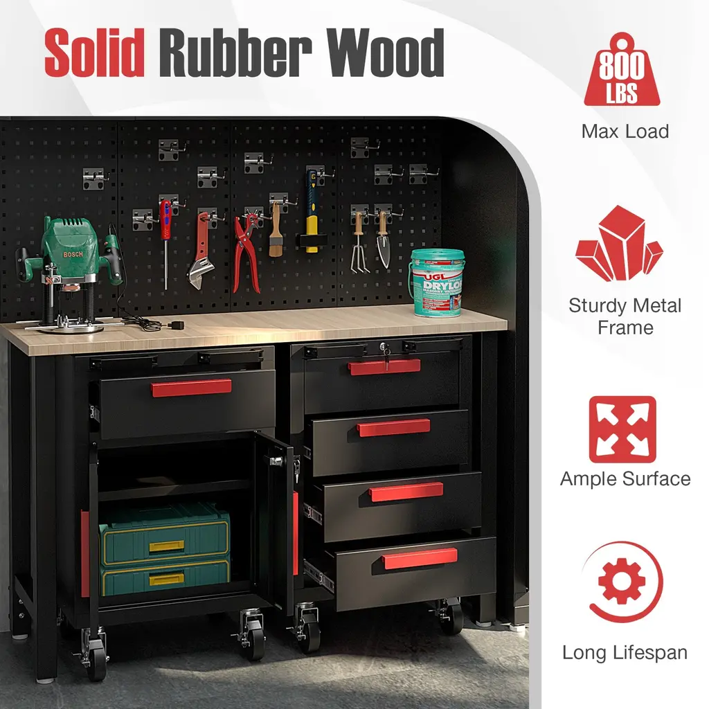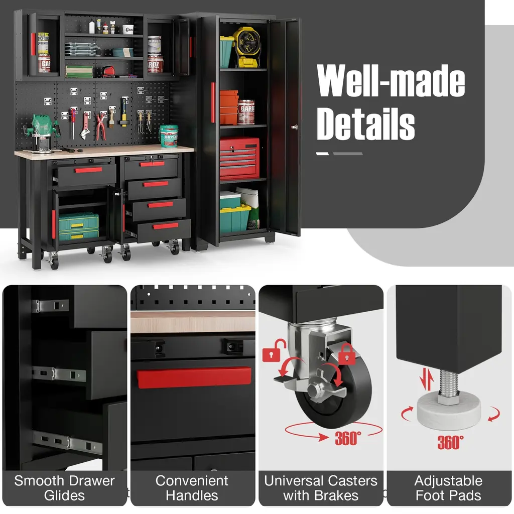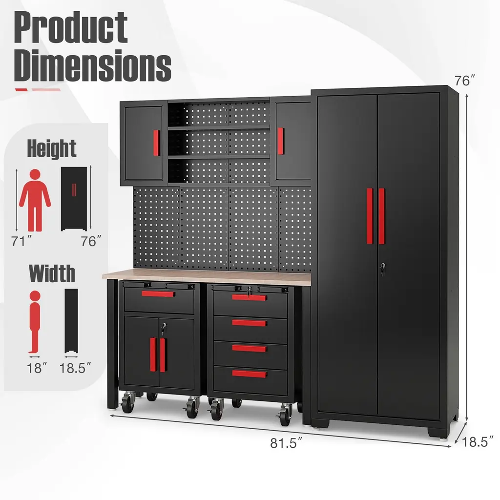 Transform your garage into a professional workspace with our 8-piece garage cabinets and storage system! This comprehensive garage storage cabinet set includes a sturdy rubber wood worktop for hands-on tasks, wall cabinets for organized storage and an adaptable pegboard system for easily accessible tools. The 2-door and 4-drawer rolling tool chests ease your workflow. Additionally, the spacious tall locker with adjustable shelves securely holds larger items. The garage cabinet set's sturdy metal frame supports a maximum load of 2420 lbs, ensuring strong and reliable support.FeatureKeep your tools visibly on standby with a flexible pegboard system Adjustable shelves for bulky equipment and supplies There are 27 positions, each spaced at a height of 3” for your reference 5 drawers with protective liners provide ample storage space for different tools 3-level adjustable shelf in the 2-door rolling tool chest for extra flexibility Solid rubber wood worktop for 800 lbs strong loading capacity Universal casters with brakes ensure simple maneuverability Maintain balance with the adjustable foot pads Smooth drawer glides and convenient handles for well-made details Hold up to 2420 lbs weight capacity thanks to the heavy-duty metal frameSpecificationColor: Black and Red Material: Metal, Rubber Wood Overall Dimensions: 81.5" x 18.5" x 76"(L x W x H) Tabletop Height from the Ground: 33" Total Net Weight: 289 lbs Total Weight Capacity: 2420 lbs Package Includes: 1 x Workbench 1 x Wall Cabinet 1 x Storage Cabinet 1 x Rolling Tool Storage Chest 1 x 4-drawer Rolling Storage Chest 3 x Keys 6 x Pegboards 1 x Instruction
