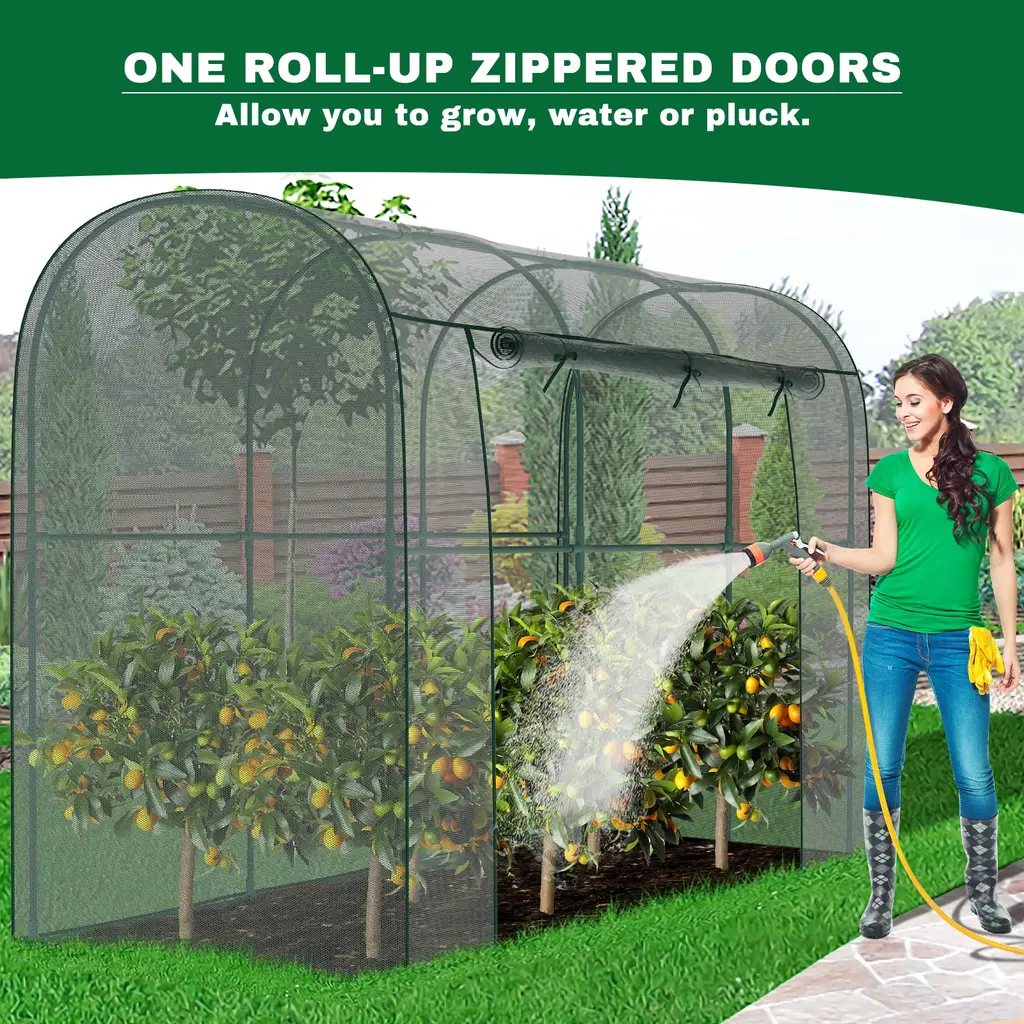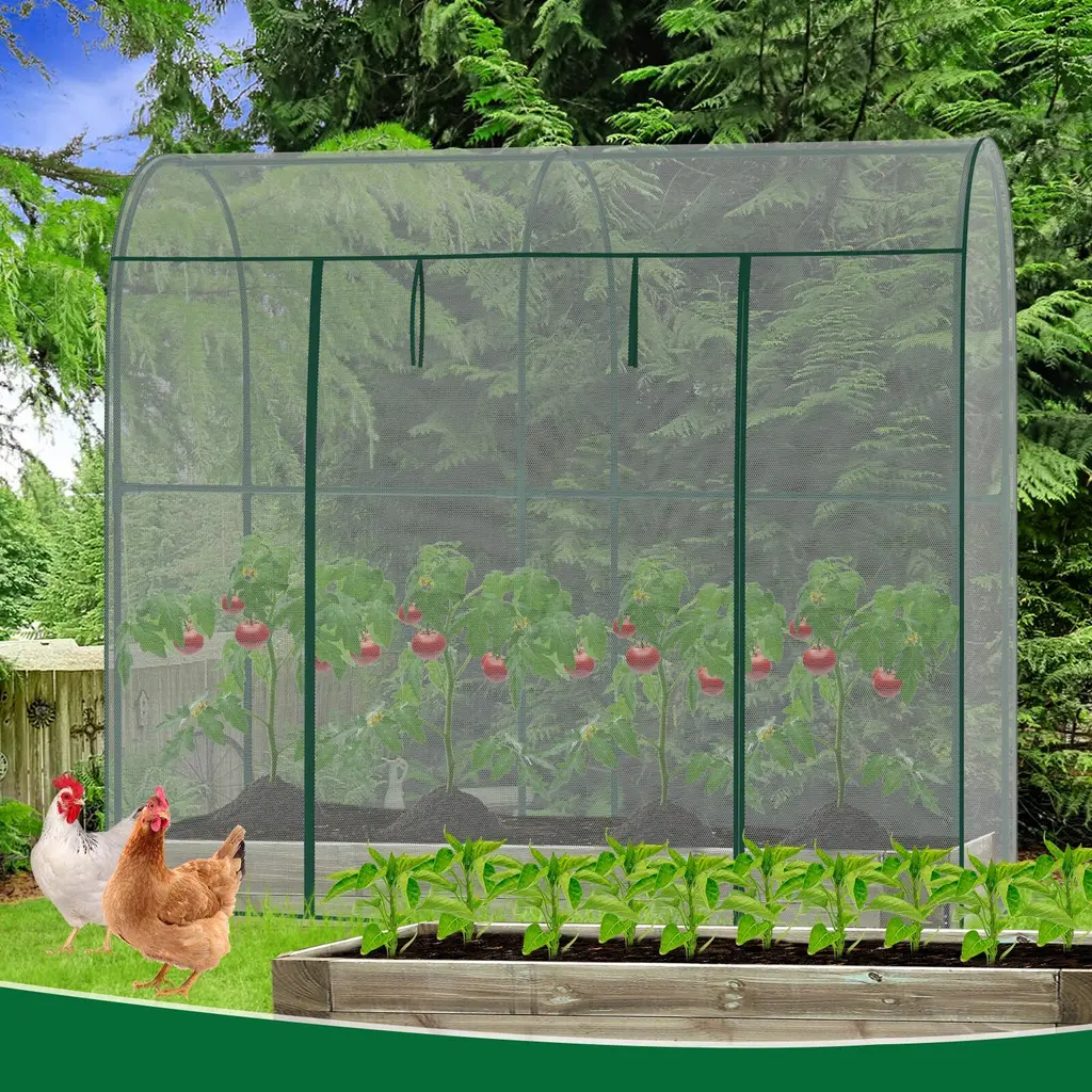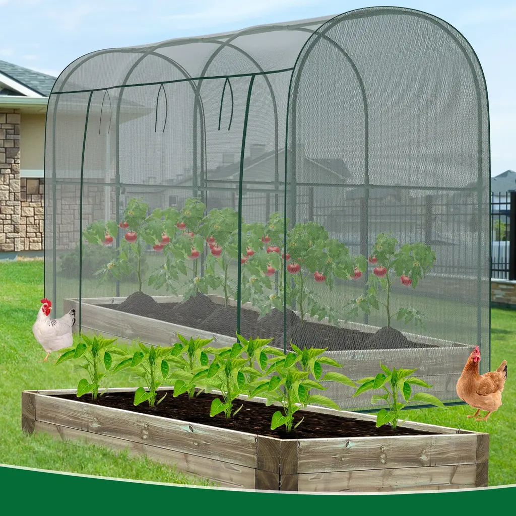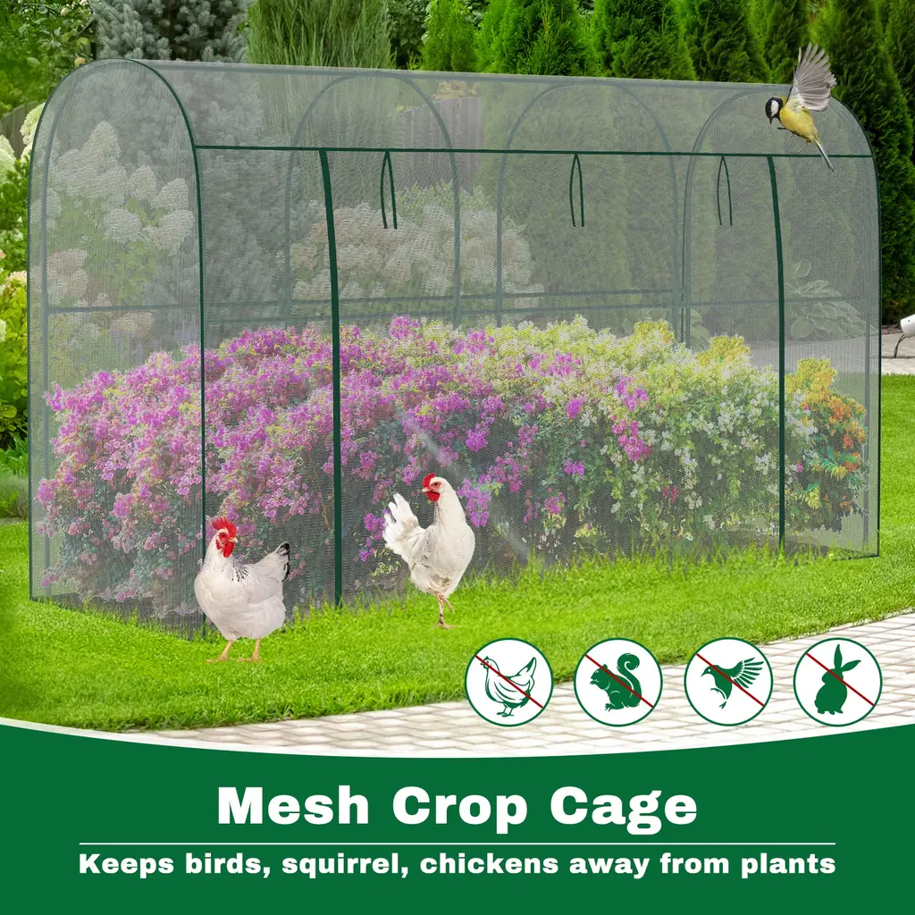 This crop cage plant protection tent prevents birds or other small animals from entering your planting area thus protects your vegetables, fruits, and flowers. The breathable mesh cover design of our plant cage allows your plants to enjoy sunlight and rainwater while staying protected. Large Spacious Design: With a dimension of 78.7"L x 39.4"Wx 71"H Our crop cage for garden offers a large size to ensure that your plants have enough space to grow strong. The plant cage with mesh cover is lightweight, easy to assemble, and easy to disassemble and store at the end of the season. Durable Mesh and Steel Frame: high-density polyester plant netting, which is tear-resistant and allows air circulation and water penetration. The garden bed cover adopts thickened steel tube frame to prevent rust, stabilize and prevent deformation, keep your plant safe , and prevent any birds and small animals. Walk-in Zippered Access Door: Plant protection netting tent is equipped with a large zippered access door that can be opened and closed as needed, making your gardening tasks more convenient. With a height of 71 inches, once inside, you can easily complete daily gardening tasks such as pruning, trimming, and collecting fruits. Widely Used: This garden bed cover is perfect for use in gardens, lawns and yards, providing protection for your vegetables, fruits, flowers and other plants, ensuring your labor does not become prey for birds or other wildlife. And plant tent can also be used as a chicken cage, providing chickens with sun protection and breathable shelter.