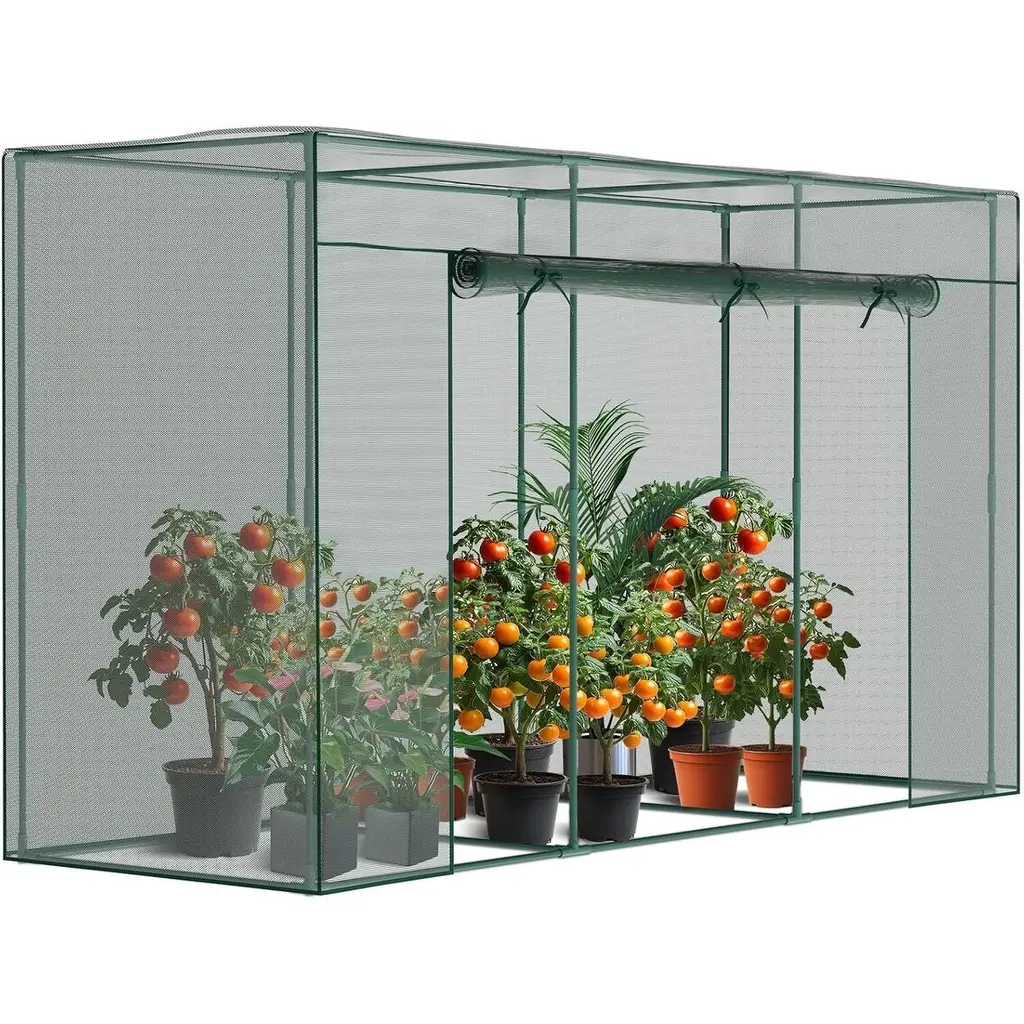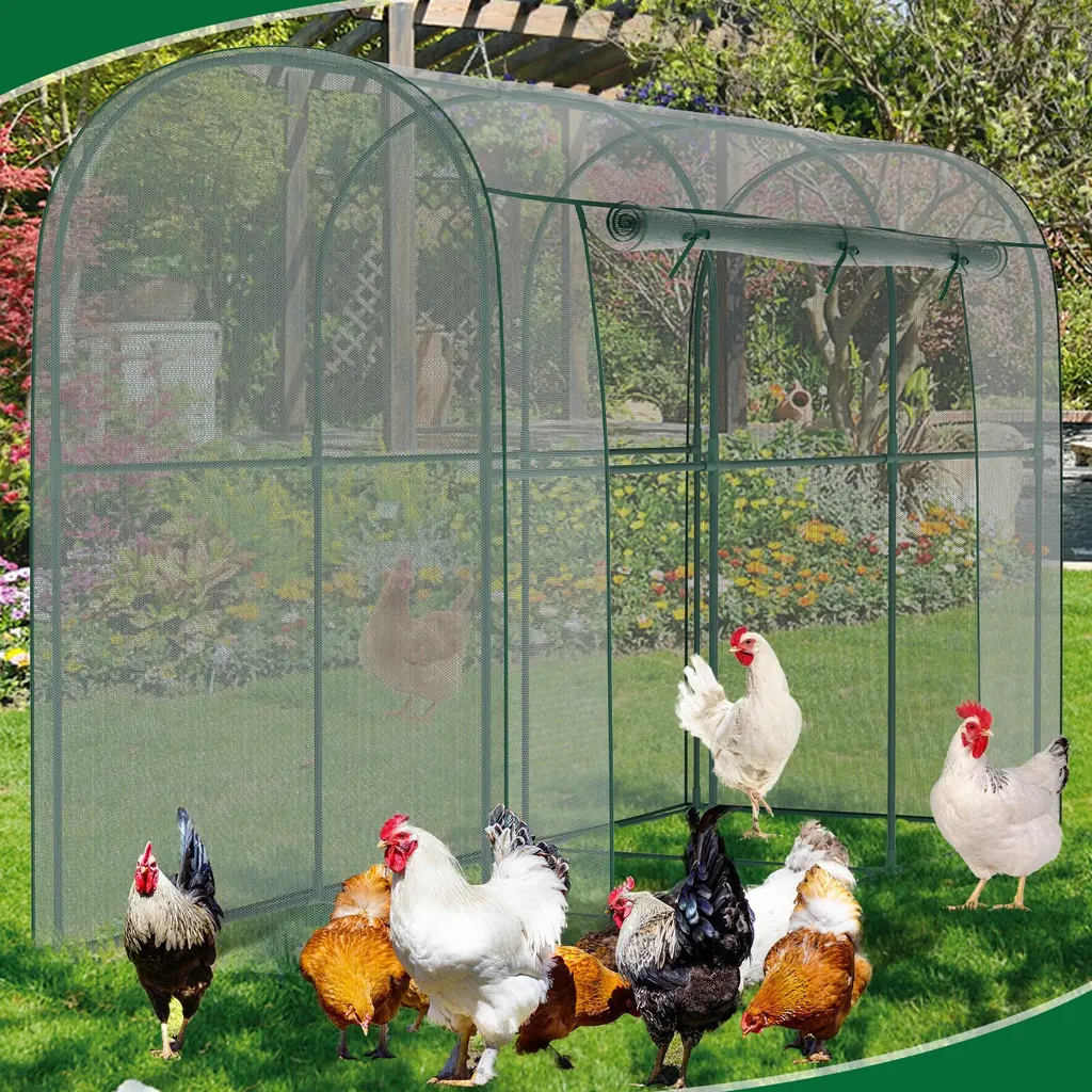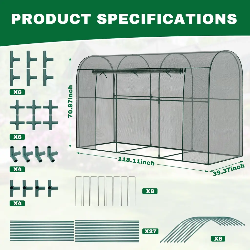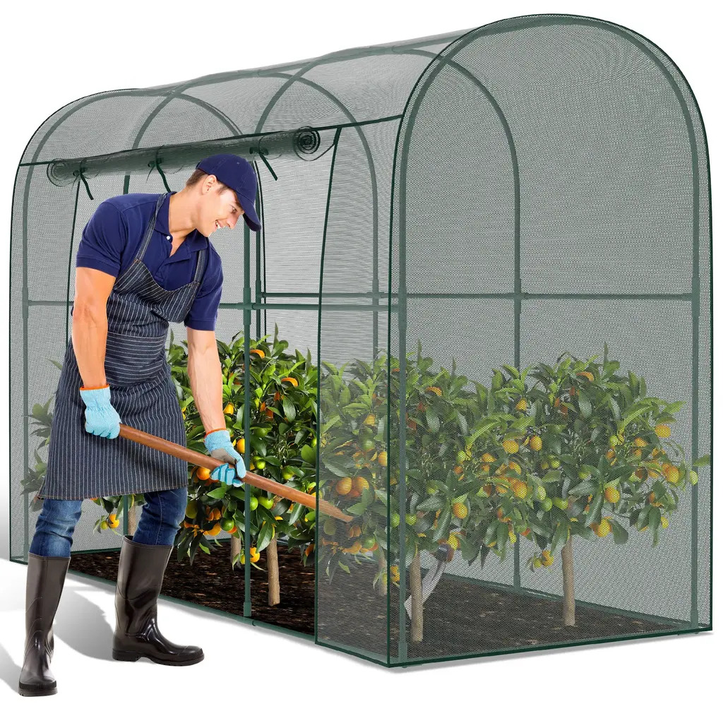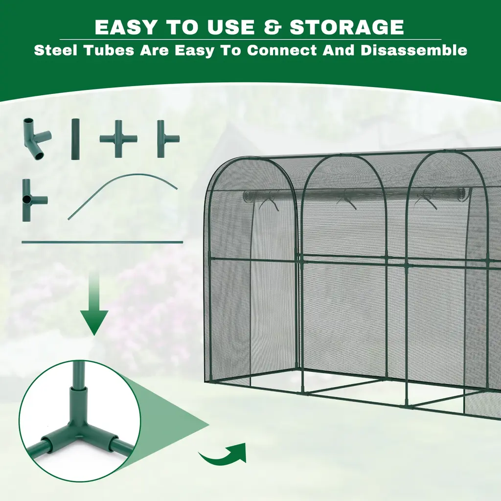 This crop cage plant protection tent prevents birds or other small animals from entering your planting area thus protects your vegetables, fruits, and flowers. The breathable mesh cover design of our plant cage allows your plants to enjoy sunlight and rainwater while staying protected. Large Spacious Design: With a dimension of 78.7"L x 39.4"Wx 71"H Our crop cage for garden offers a large size to ensure that your plants have enough space to grow strong. The plant cage with mesh cover is lightweight, easy to assemble, and easy to disassemble and store at the end of the season. Durable Mesh and Steel Frame: high-density polyester plant netting, which is tear-resistant and allows air circulation and water penetration. The garden bed cover adopts thickened steel tube frame to prevent rust, stabilize and prevent deformation, keep your plant safe , and prevent any birds and small animals. Walk-in Zippered Access Door: Plant protection netting tent is equipped with a large zippered access door that can be opened and closed as needed, making your gardening tasks more convenient. With a height of 71 inches, once inside, you can easily complete daily gardening tasks such as pruning, trimming, and collecting fruits. Widely Used: This garden bed cover is perfect for use in gardens, lawns and yards, providing protection for your vegetables, fruits, flowers and other plants, ensuring your labor does not become prey for birds or other wildlife. And plant tent can also be used as a chicken cage, providing chickens with sun protection and breathable shelter.