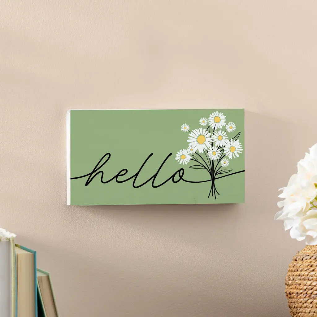 Daisy Scape Wood Hanging Sign W/ Rope, "Hello" Bouquet, 11"x6"