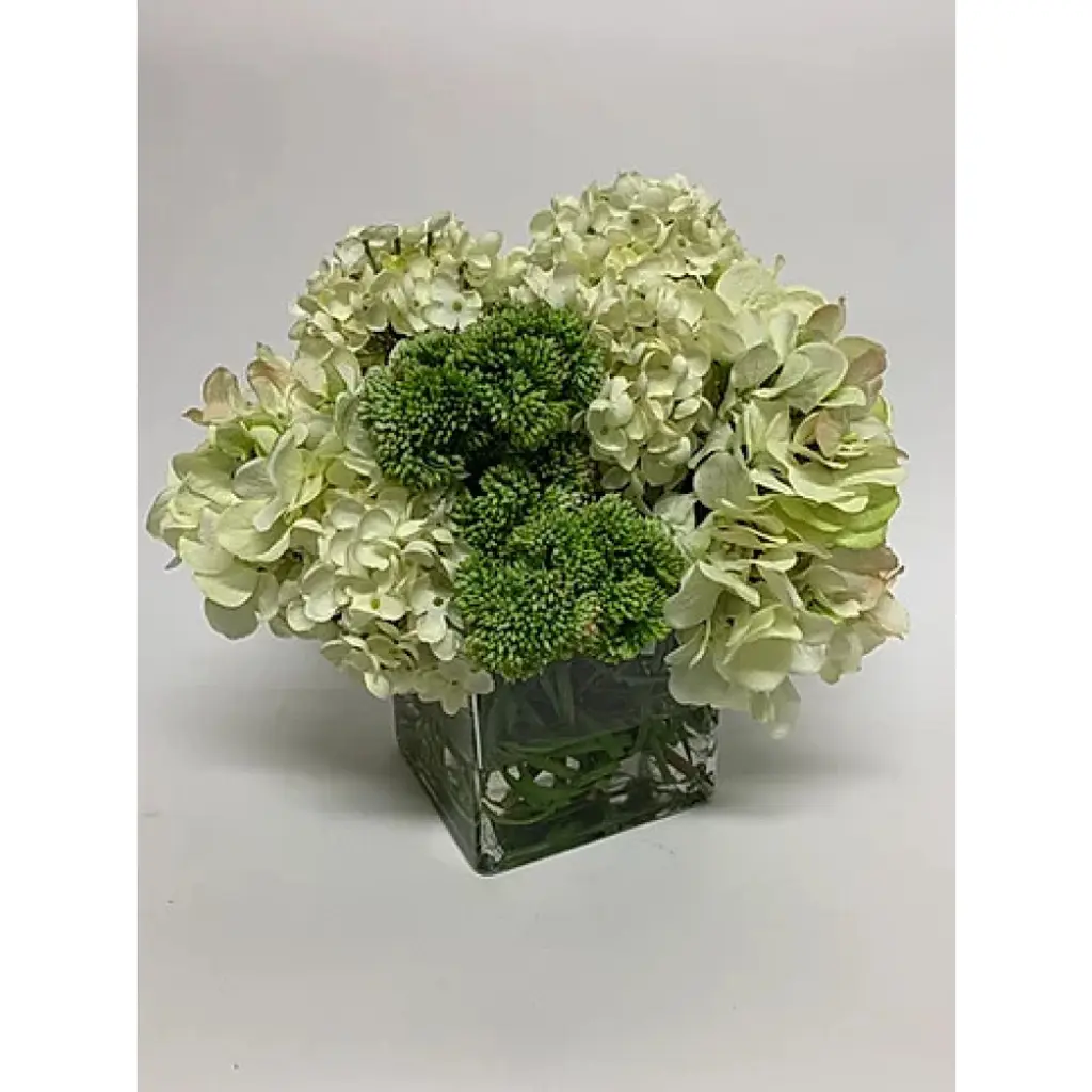 Beautiful hydrangea bouquet in glass cube handcrafted by Diane James Home.