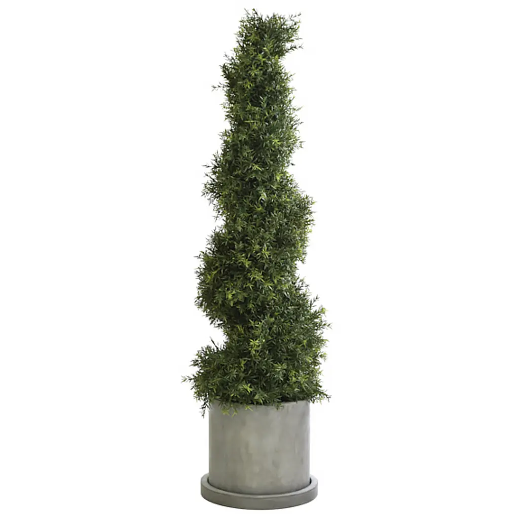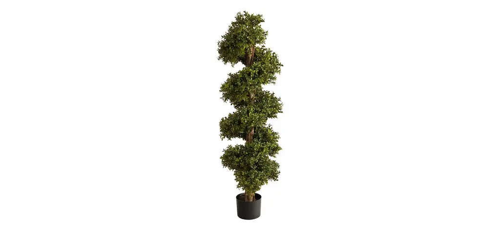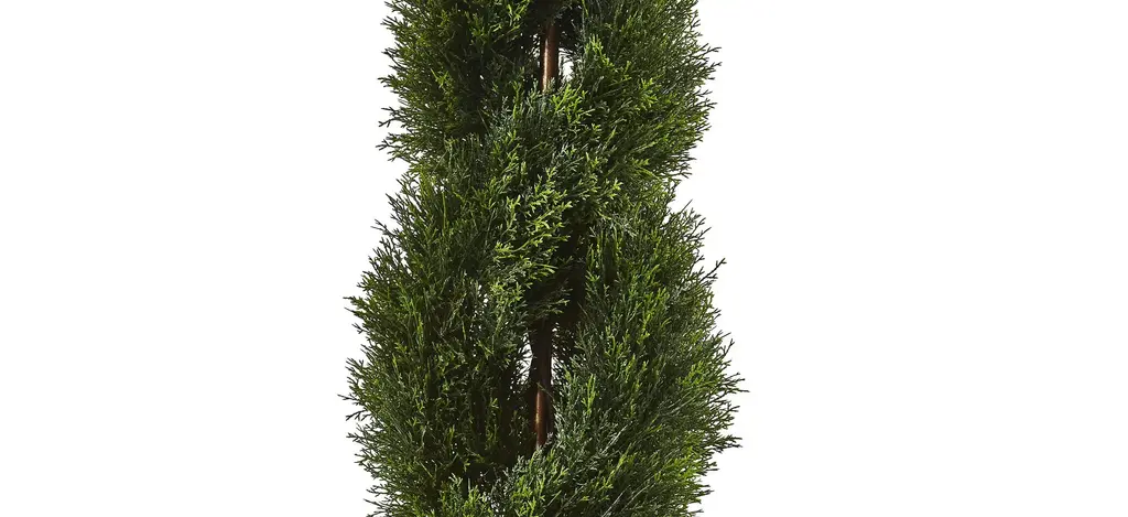 Standing 4 feet tall, this faux double pond cypress plant features two twisting stalks of greenery to form a spiral topiary arrangement. Adorned with 1,036 leaves, this floor plant is handcrafted in fine detail to mimic a true topiary. Place at the front entryway to greet guests or atop an entryway table for added height. Leaves are UV resistant, suitable for indoor or outdoor use.