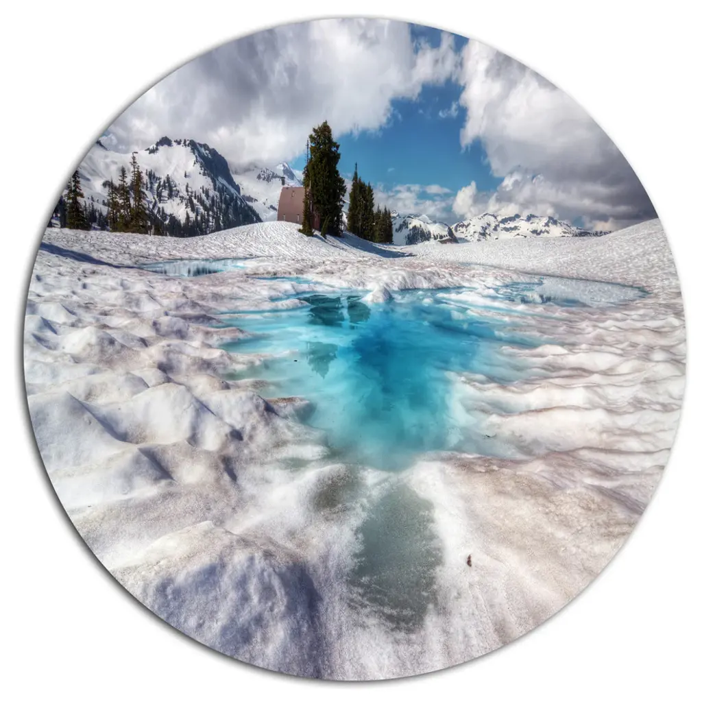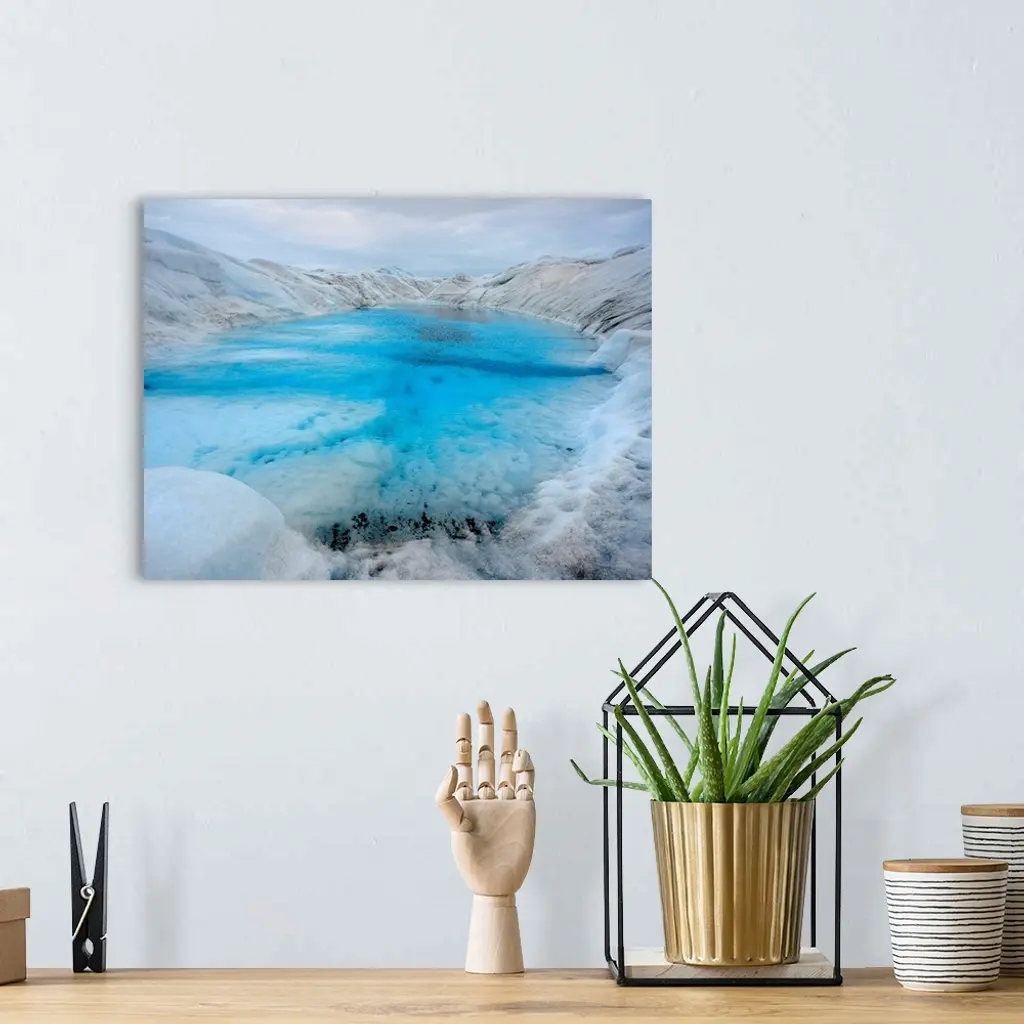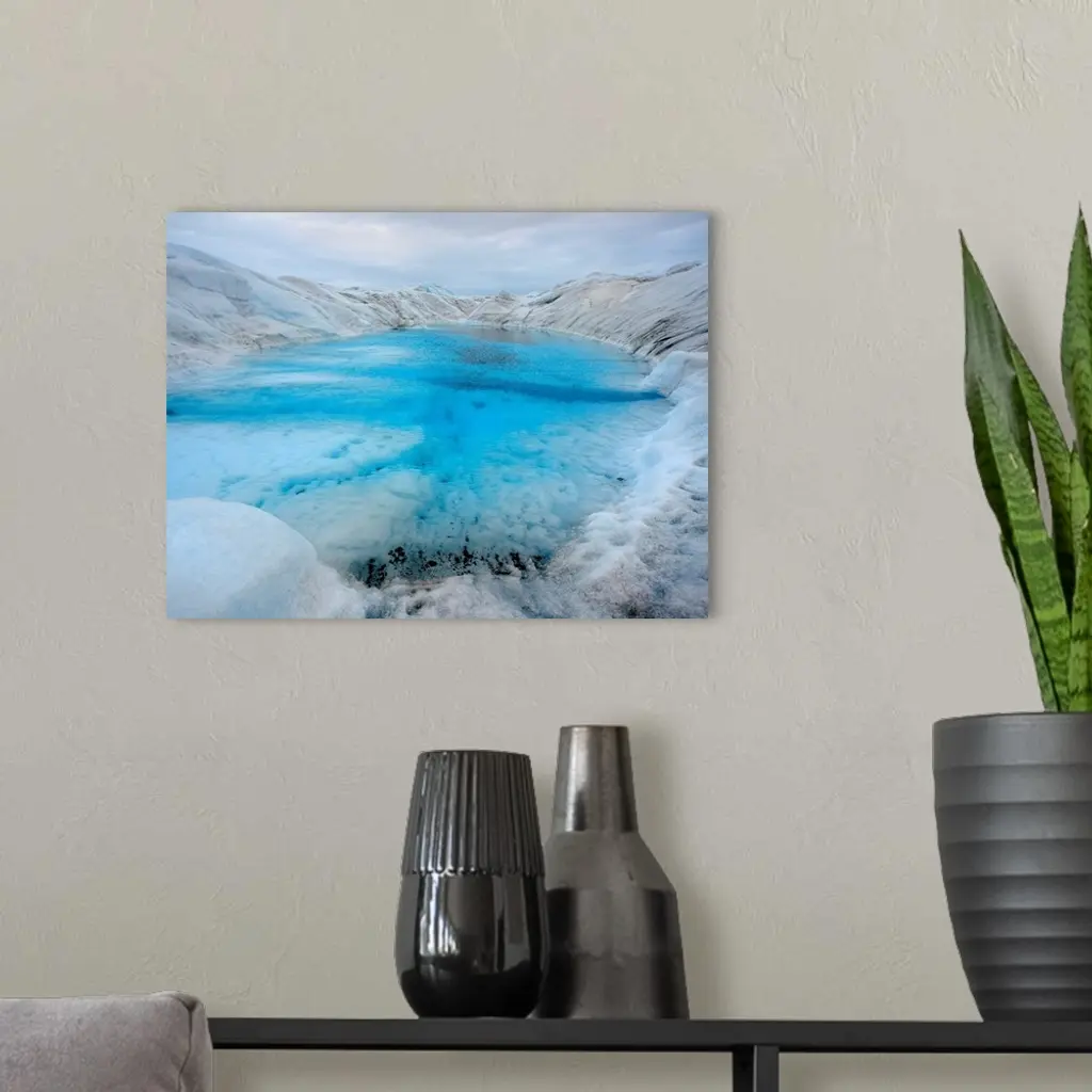 Drainage system with lake on the surface of the ice sheet. The brown sediment on the ice is created by the rapid melting of the ice. Landscape of Greenland near Kangerlussuaq, Kingdom of Denmark.