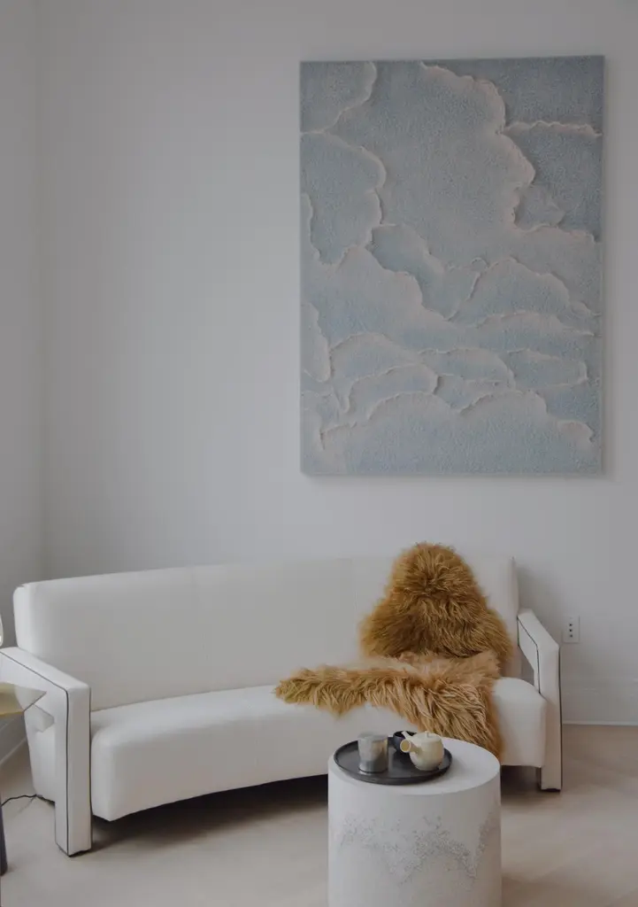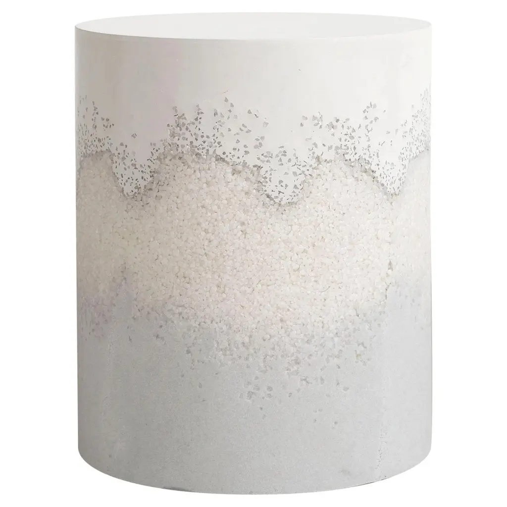 A layering of cement and crushed aggregates, the made-to-order drum consists of an hand-dyed white cement top and a packed crystal quartz bottom. Poured by hand over the jagged minerals, the white cement merges the materials to create a unique organic blend. The piece has a hollow cavity and weighs approximately 40lbs.