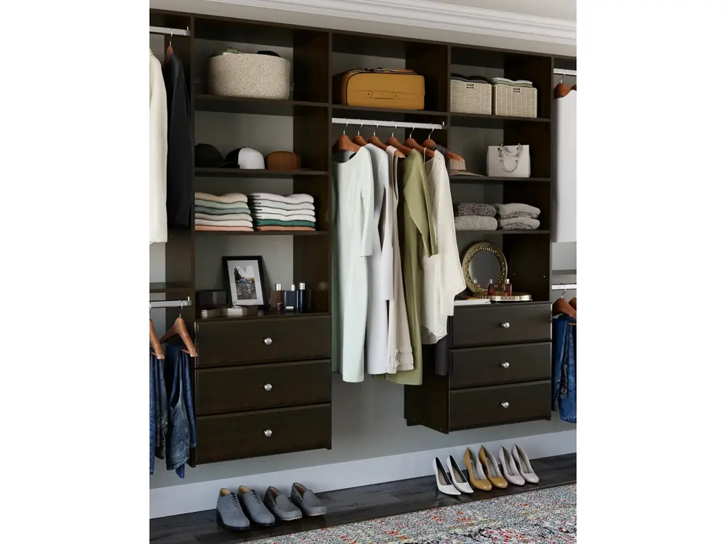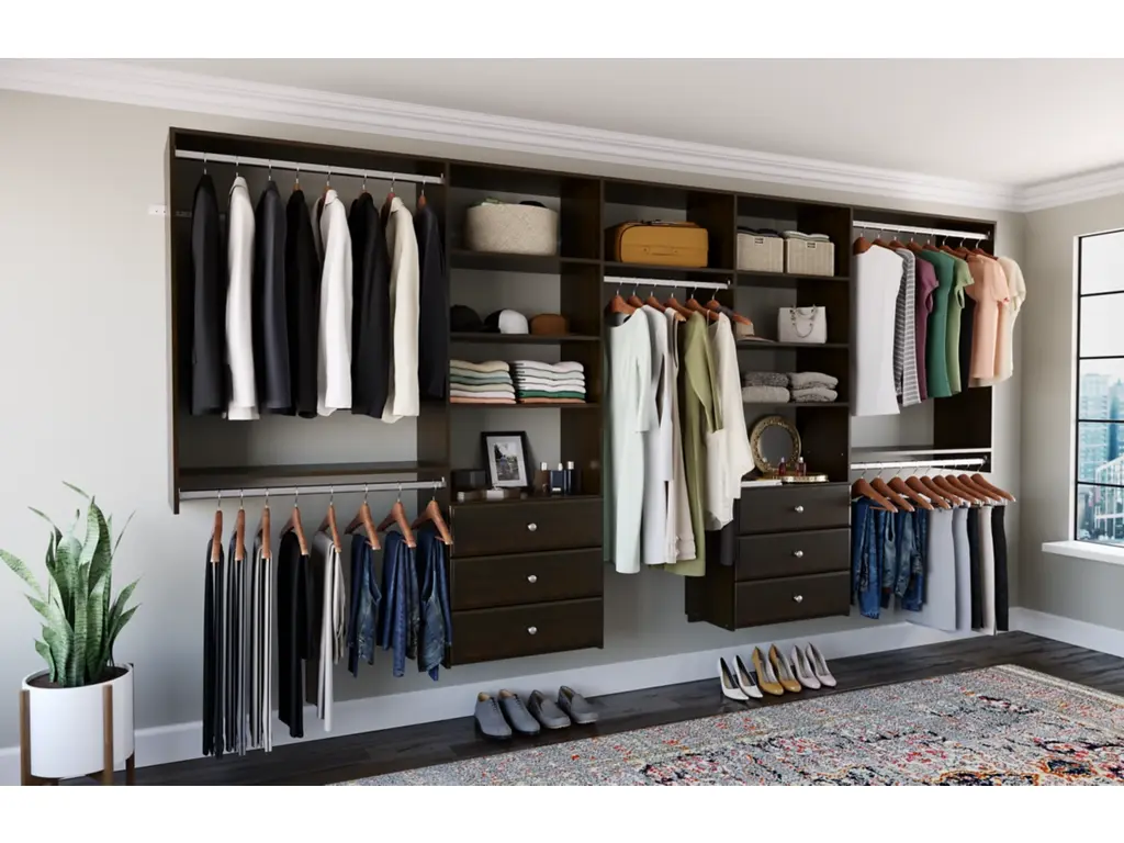 The 12 ft. Deluxe Shared Kit is crafted symmetrically to perfectly accommodate both his and her wardrobes. This box includes a kit that does it all, doing the job of both a closet and dresser. It includes adjustable shelving, drawers and ample hanging space. Adjustable shelving stores stacks of sweaters, denim, shoes and more. Ample open shelving leaves room for personal touches and large bins to hold small items. Drawers for hidden storage and hanging space keep clothing off the floor and offer quick access to shirts, dresses and slacks. For an easy install, the Deluxe Shared Kit hangs on wall-mounted steel rails and comes with all of the required installation hardware. For any questions regarding this product, please contact customers@thestowcompany.com or 1-800-562-4257, Monday through Friday, 8:00AM to 5:00PM (EST).