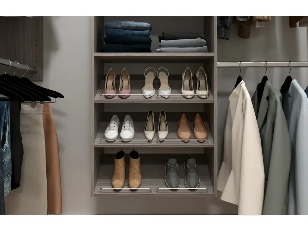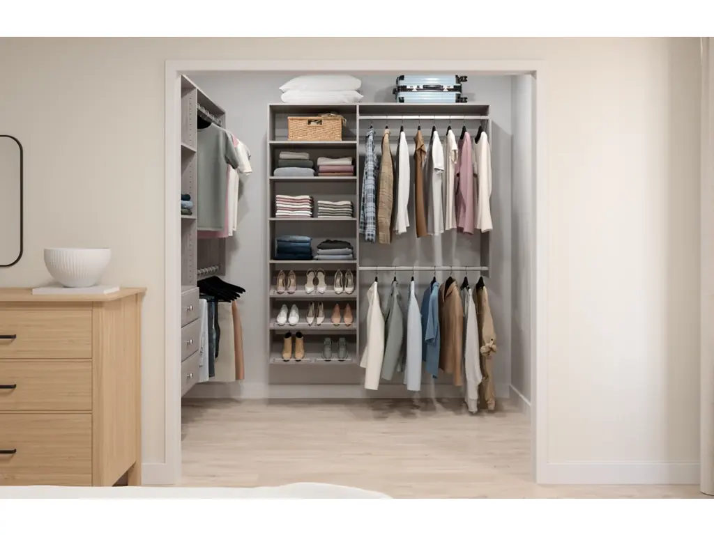 This 3 ft. - 5 ft. closet kit was designed intentionally to maximize space in smaller closets. Not all closets are made the same, which is why we offer customizable solutions to fit your needs. Install the cut-to-fit shelves and rods in a reach-in closet or combine with other kits for a maximized walk-in closet solution. Wherever you choose to install this closet system, enjoy open shelving, dedicated shoe storage, and plenty of hanging space. For any questions regarding this product, please contact customers@thestowcompany.com or 1-800-562-4257, Monday through Friday, 8:00AM to 5:00PM (EST).