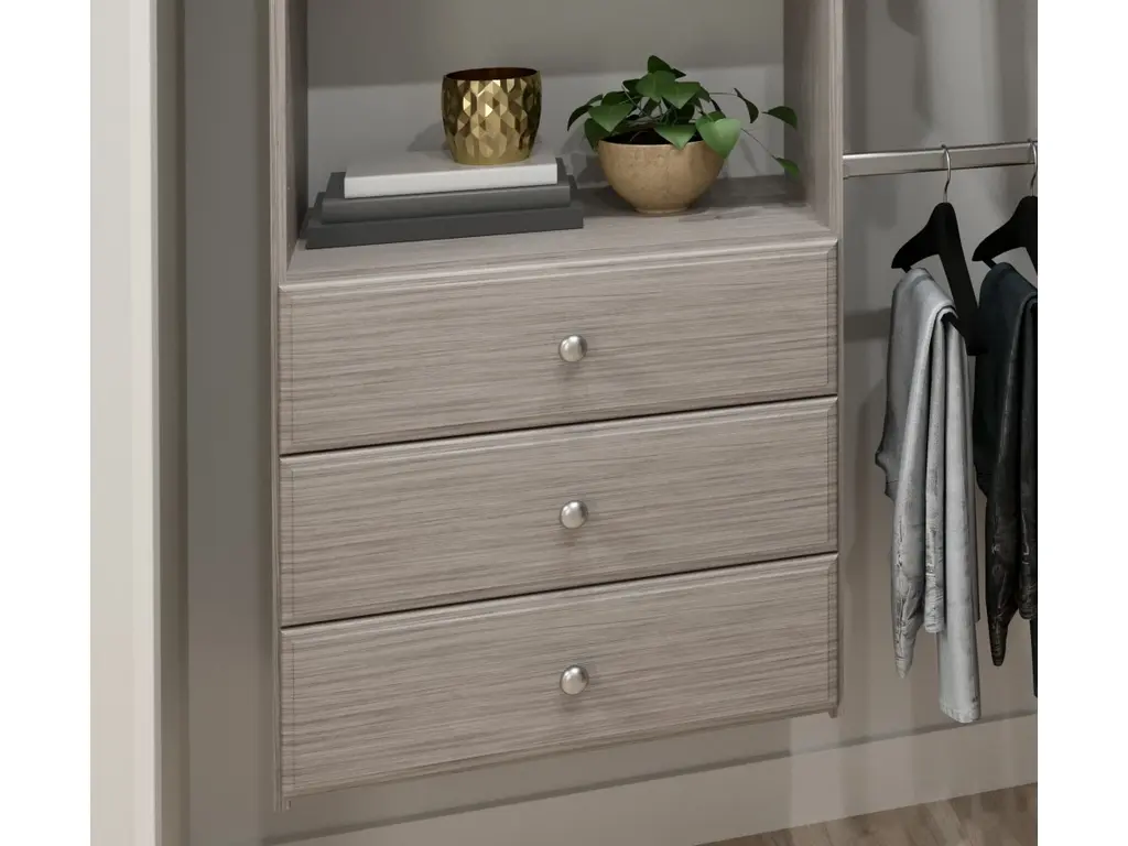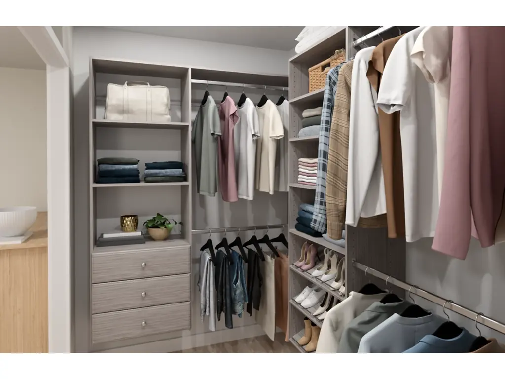 This 3 ft. - 5 ft. closet kit was designed intentionally to maximize space in smaller closets. Not all closets are made the same, which is why we offer customizable solutions to fit your needs. Install the cut-to-fit shelves and rods in a reach-in closet or combine with other kits for a maximized walk-in closet solution. Wherever you choose to install this closet system, enjoy open shelving, hidden storage with the drawers and plenty of hanging space. For any questions regarding this product, please contact customers@thestowcompany.com or 1-800-562-4257, Monday through Friday, 8:00AM to 5:00PM (EST).