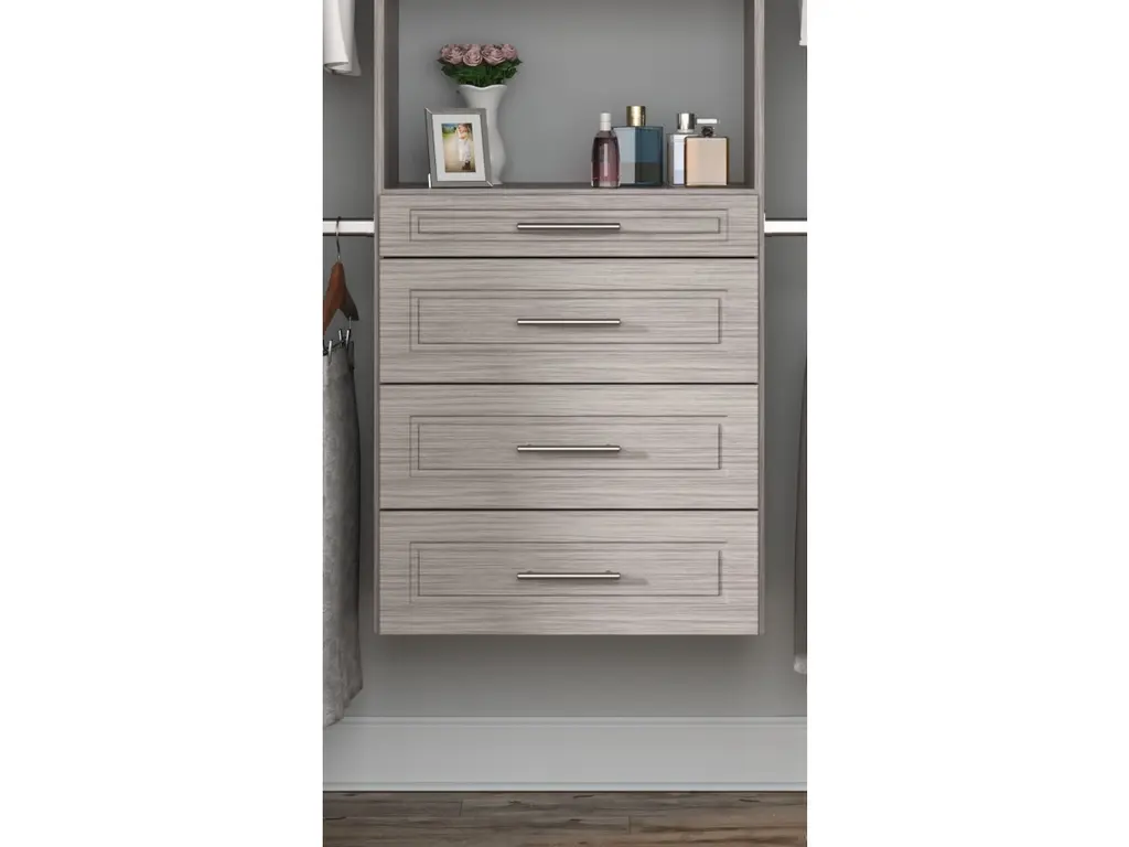 Organizing your space is easy with the Modern Raised Ultimate Closet Kit. This contemporary closet system creates a space for all of your clothes and accessories with four hanging rods, two adjustable open shelves and four drawers. Designed in four finish options with modern drawer fronts, this kit will maximize your space while upgrading the look and feel of your closet. For any questions regarding this product, please contact customers@thestowcompany.com or 1-800-562-4257, Monday through Friday, 8:00AM to 5:00PM (EST).