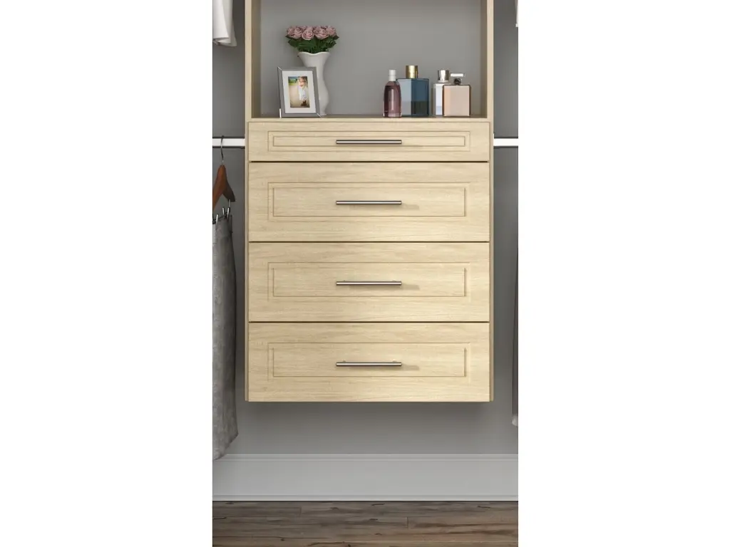 Organizing your space is easy with the Modern Raised Ultimate Closet Kit. This contemporary closet system creates a space for all of your clothes and accessories with four hanging rods, two adjustable open shelves and four drawers. Designed in four finish options with modern drawer fronts, this kit will maximize your space while upgrading the look and feel of your closet. For any questions regarding this product, please contact customers@thestowcompany.com or 1-800-562-4257, Monday through Friday, 8:00AM to 5:00PM (EST).